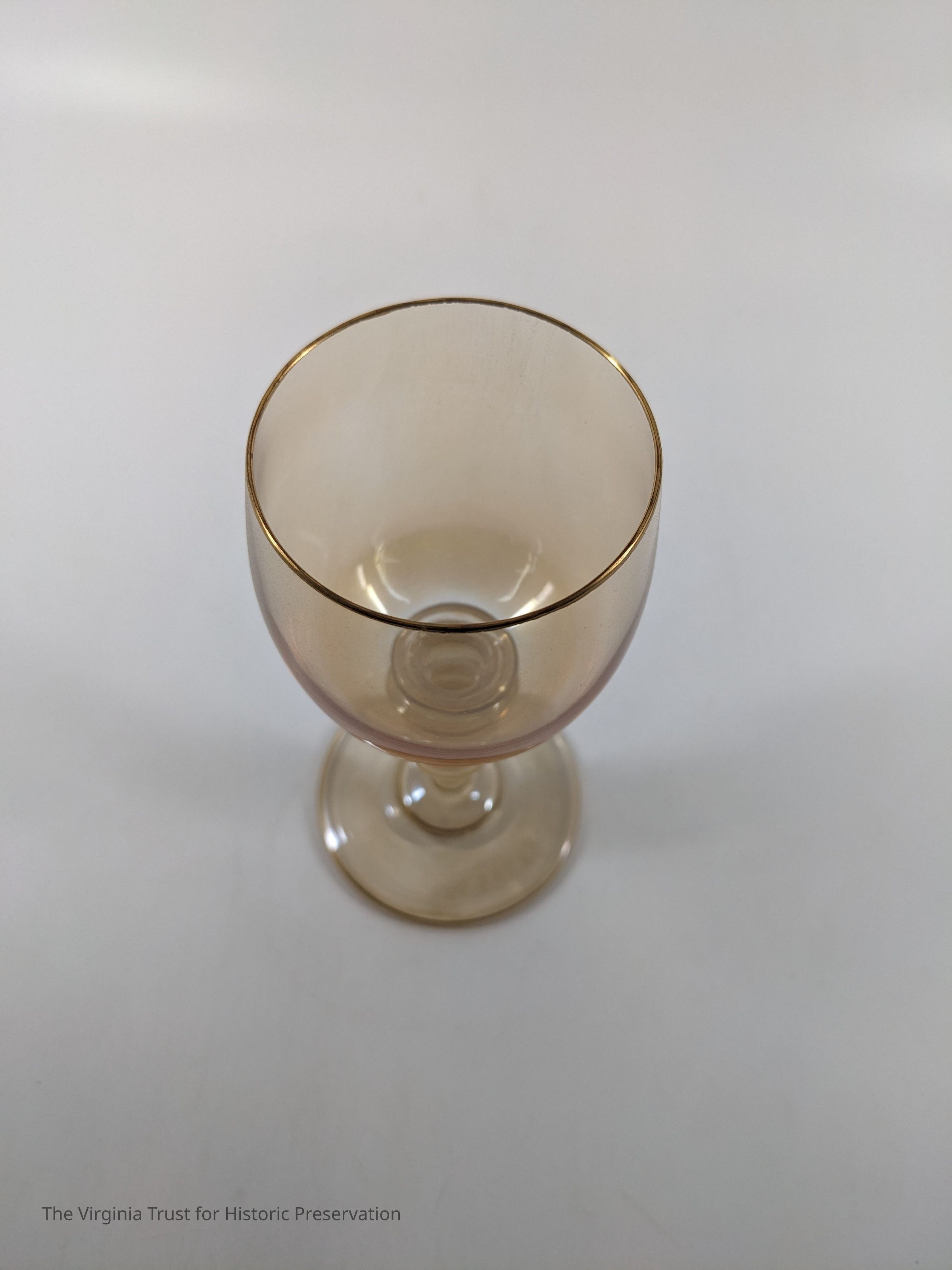 Set of 6 iridescent wine glasses. Yellow in color with gold band around rim and base.