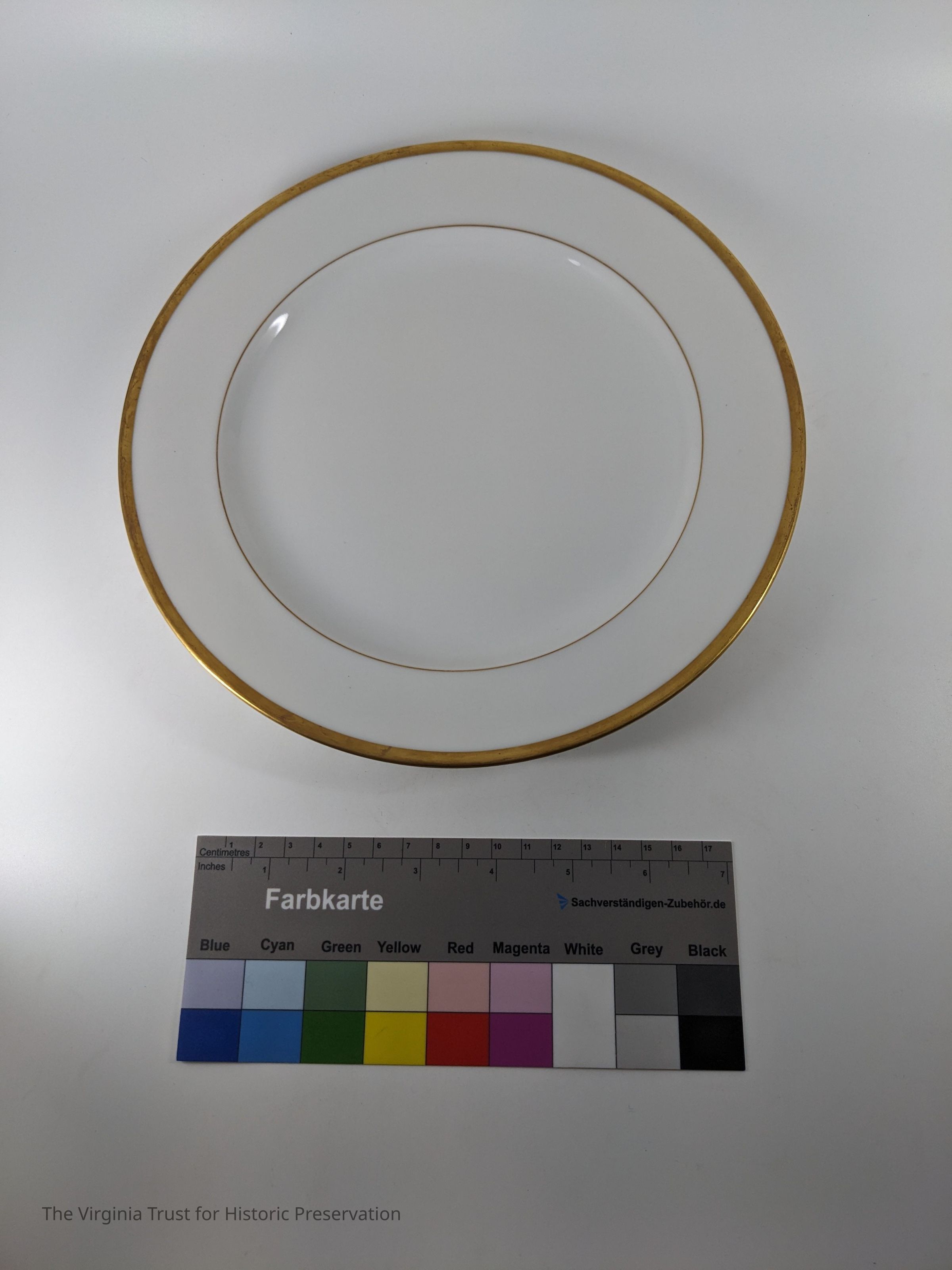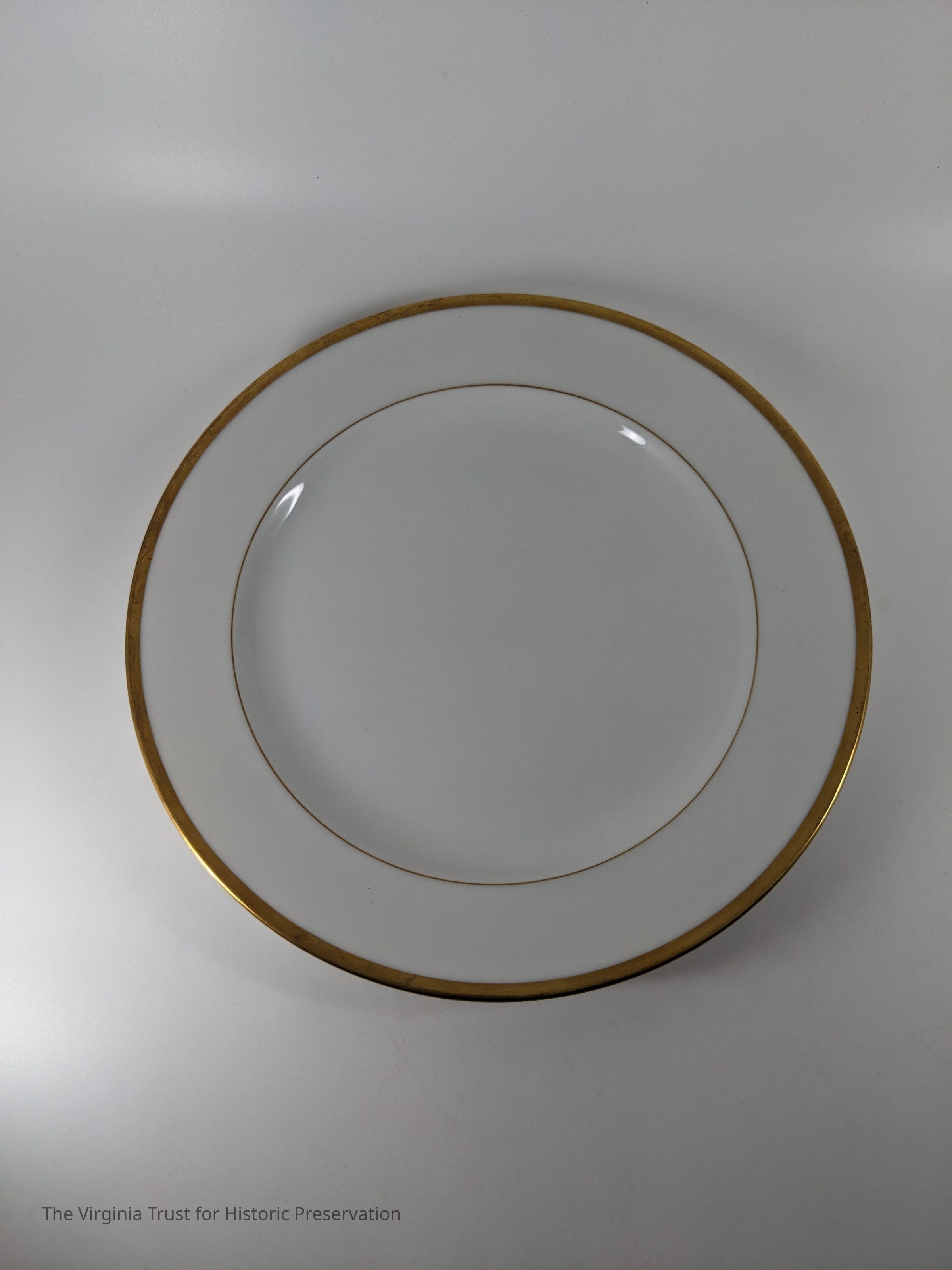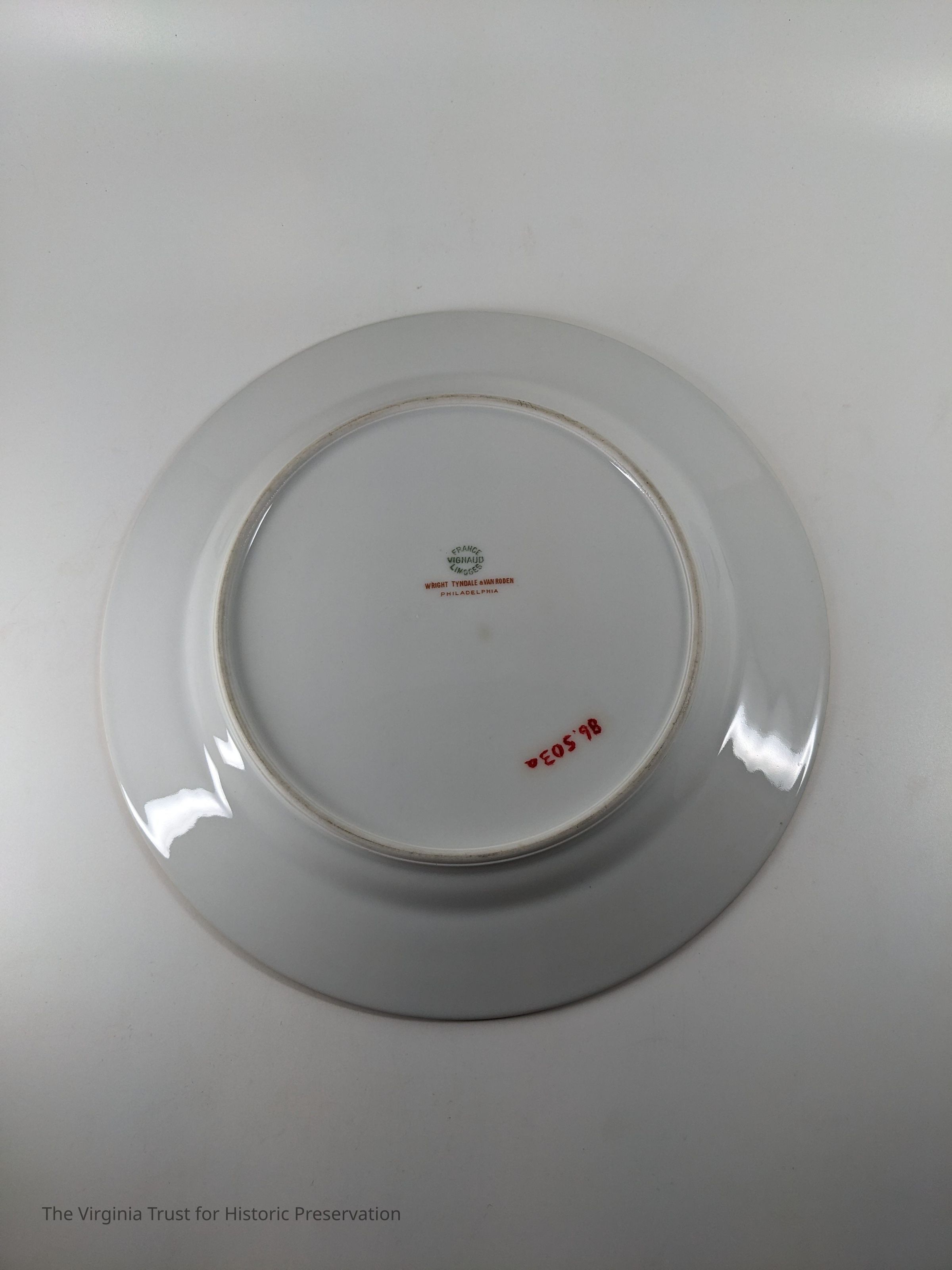 White plate with gold rim. Marked on back: "France Vignaud Limoges Wright Tyndale and Van Roden Philadelphia."