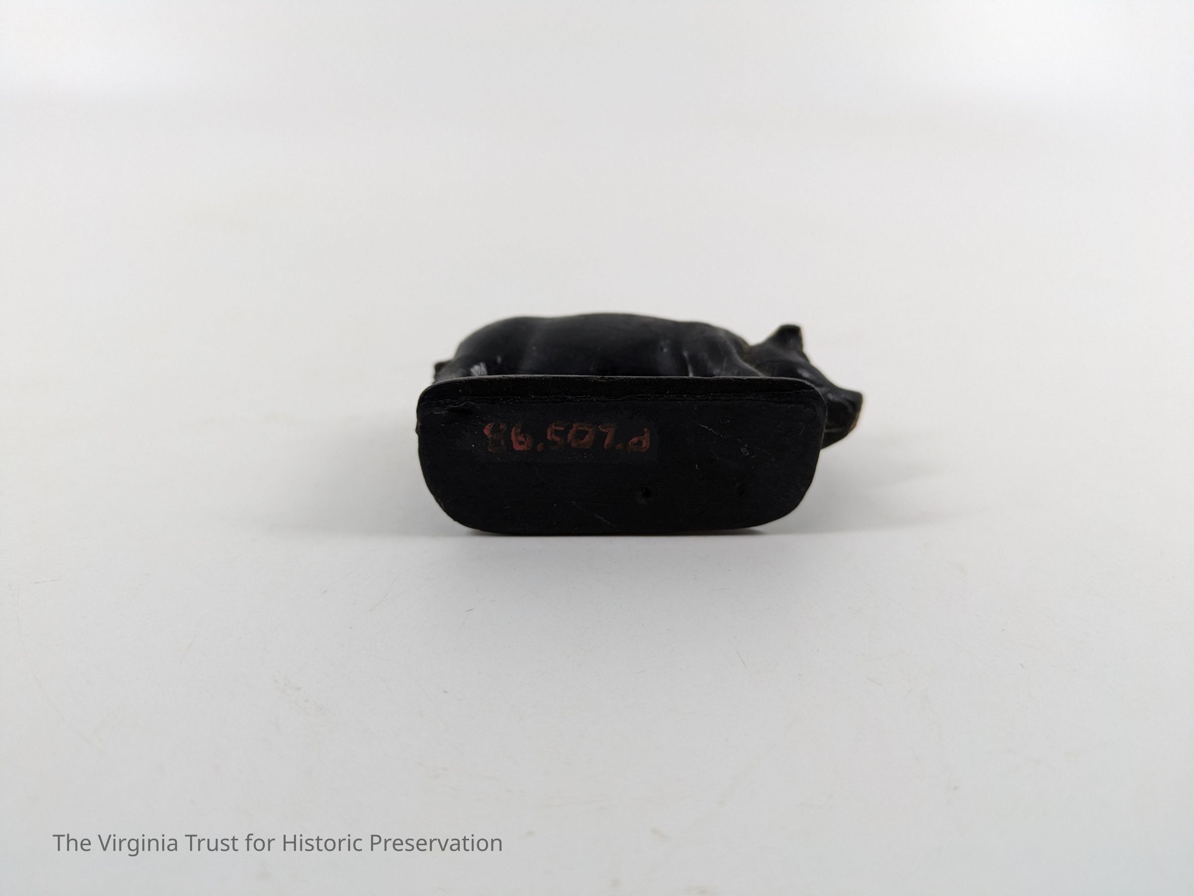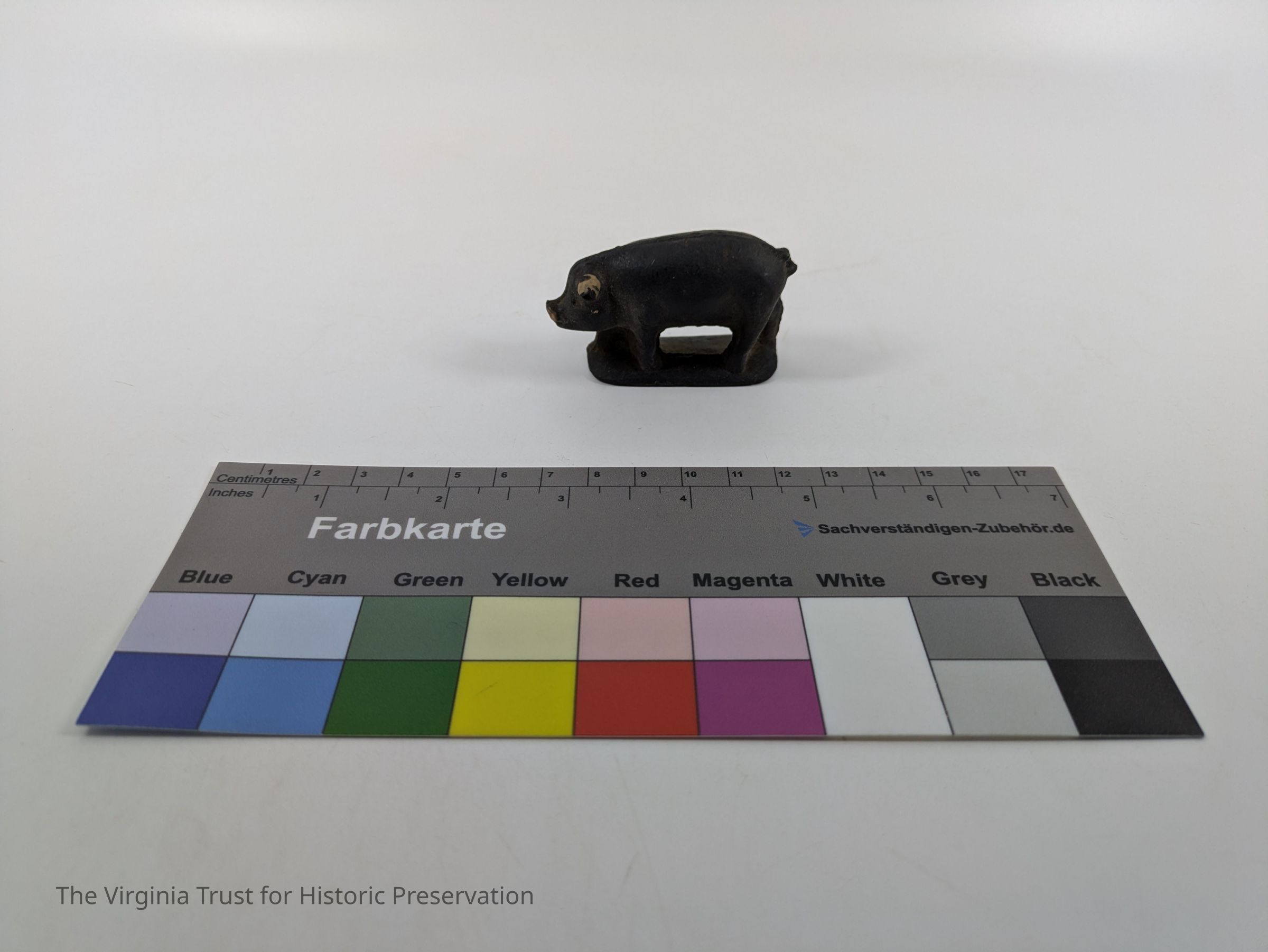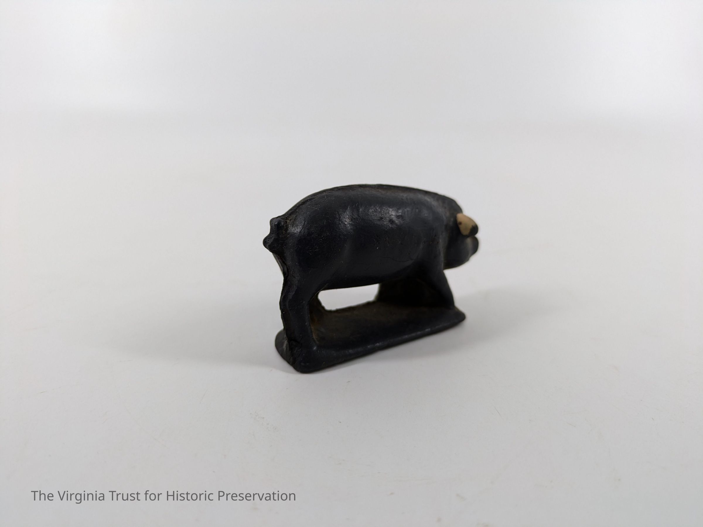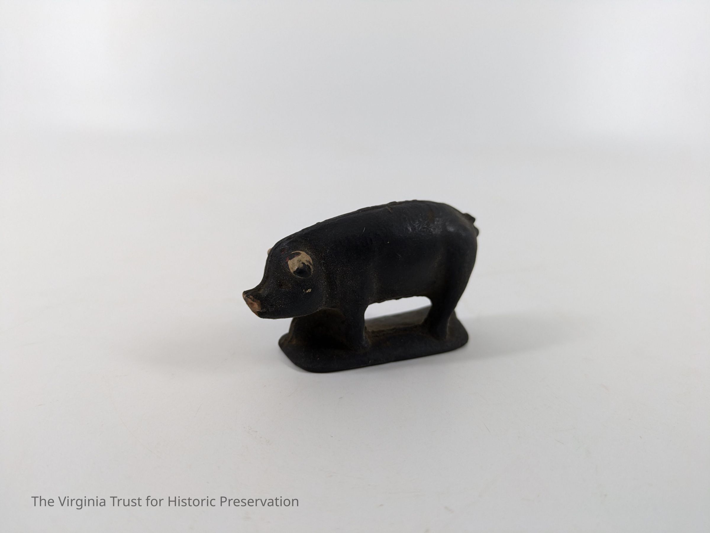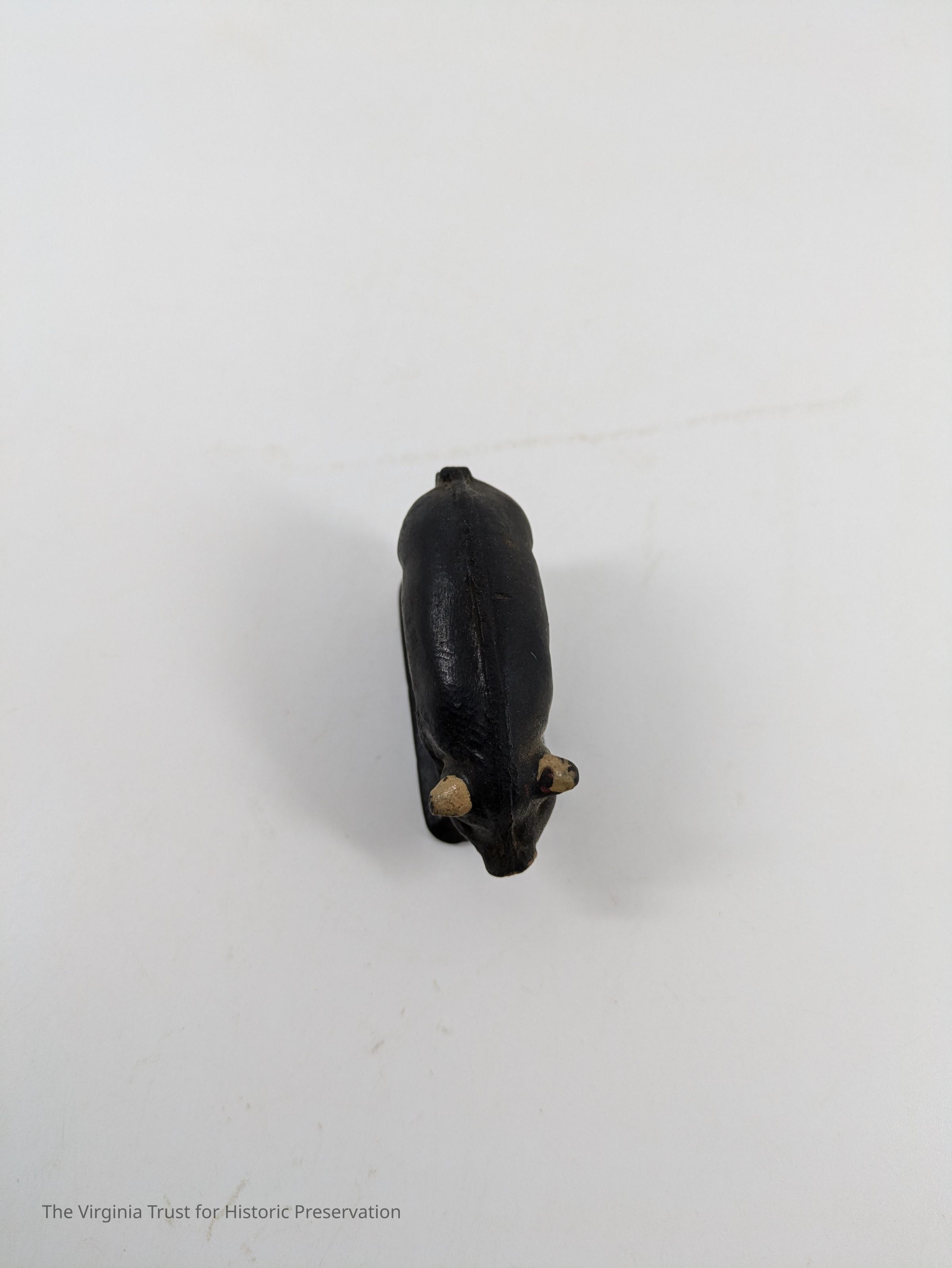 Pig with black with tan ears and pink nose. One of six molded rubber animal figurines