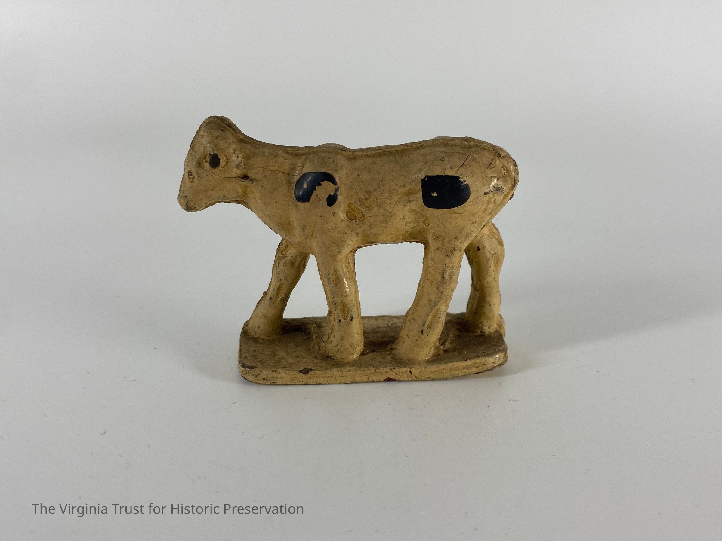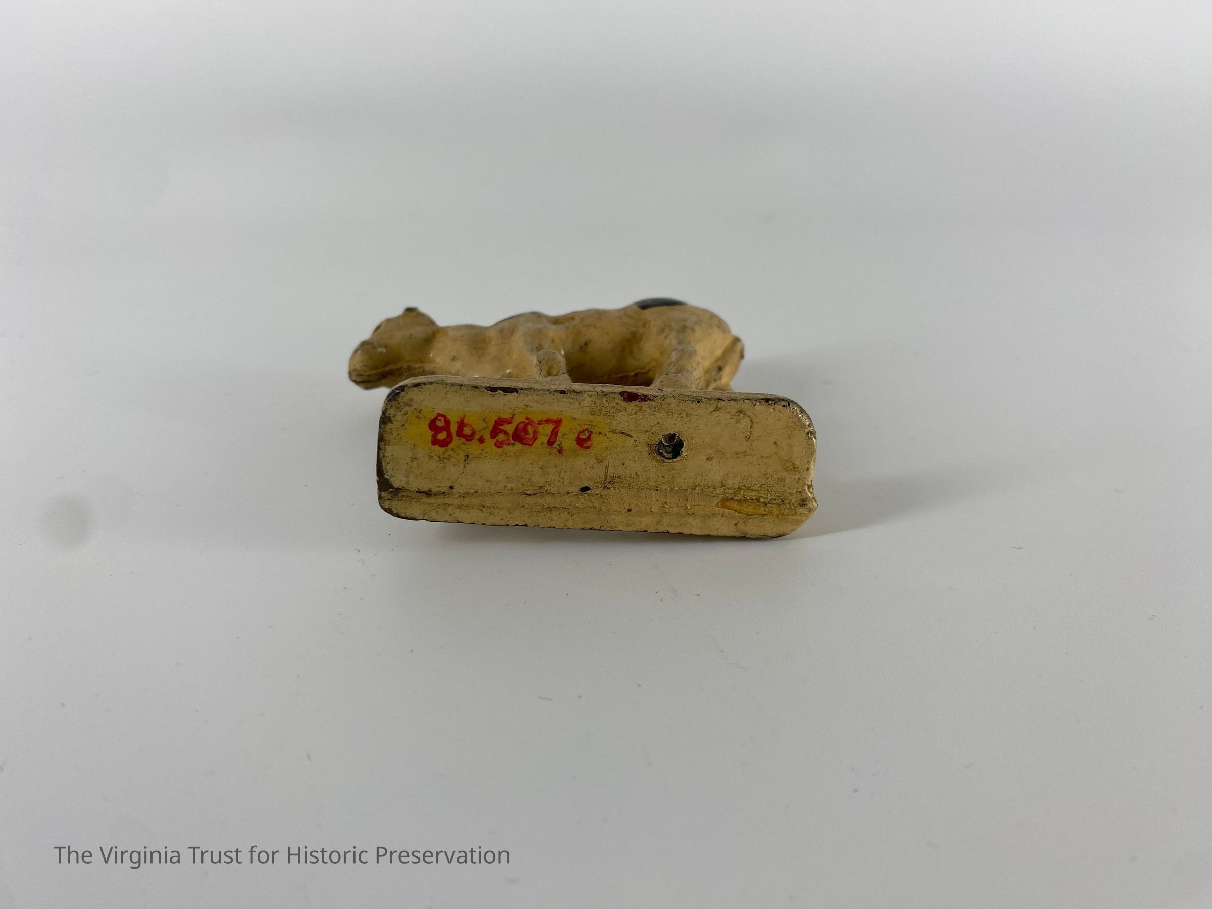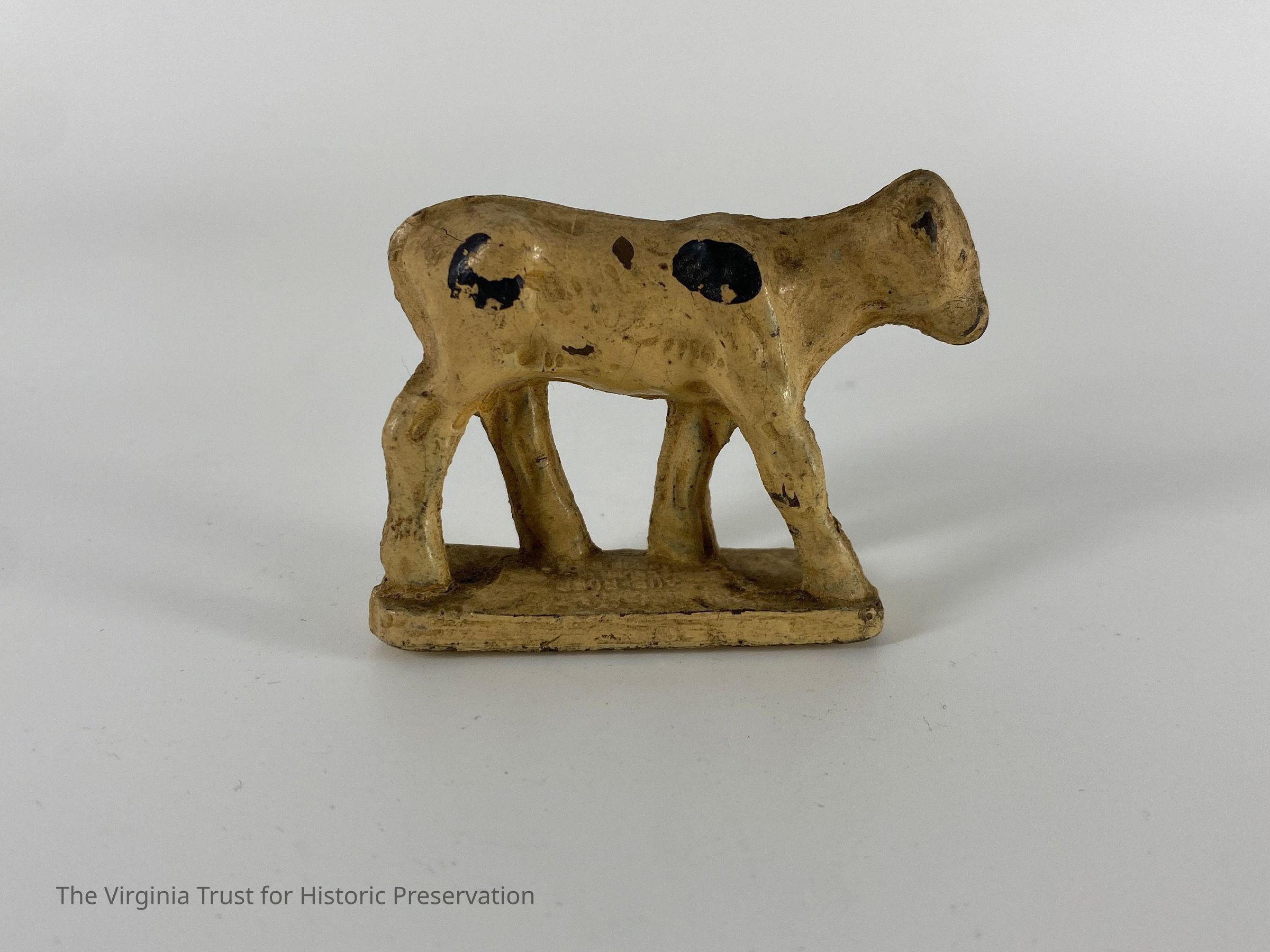 Calf: tan with black spots. Embossment worn, likely same as 1986.570 F. One of six molded rubber animal figurines.