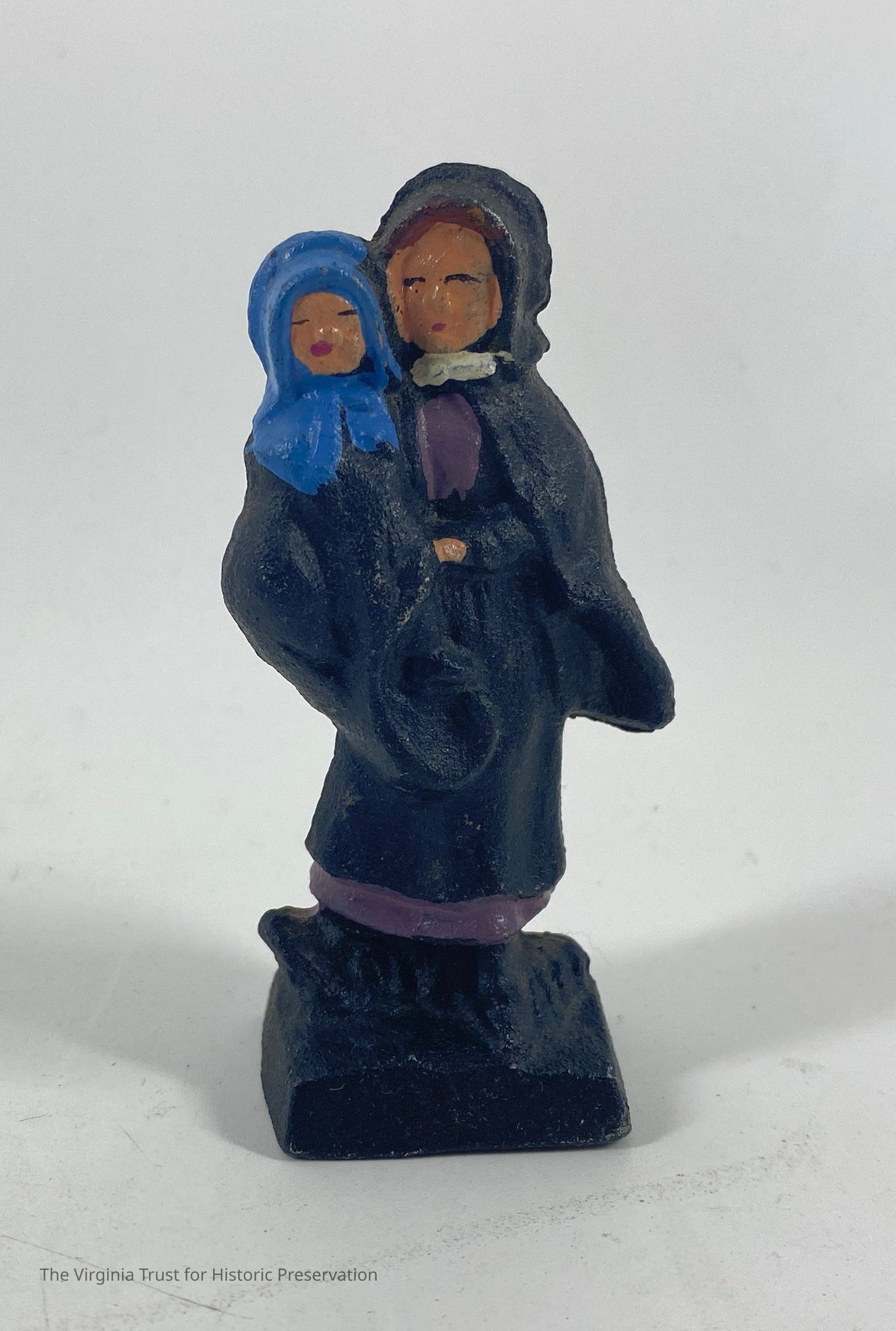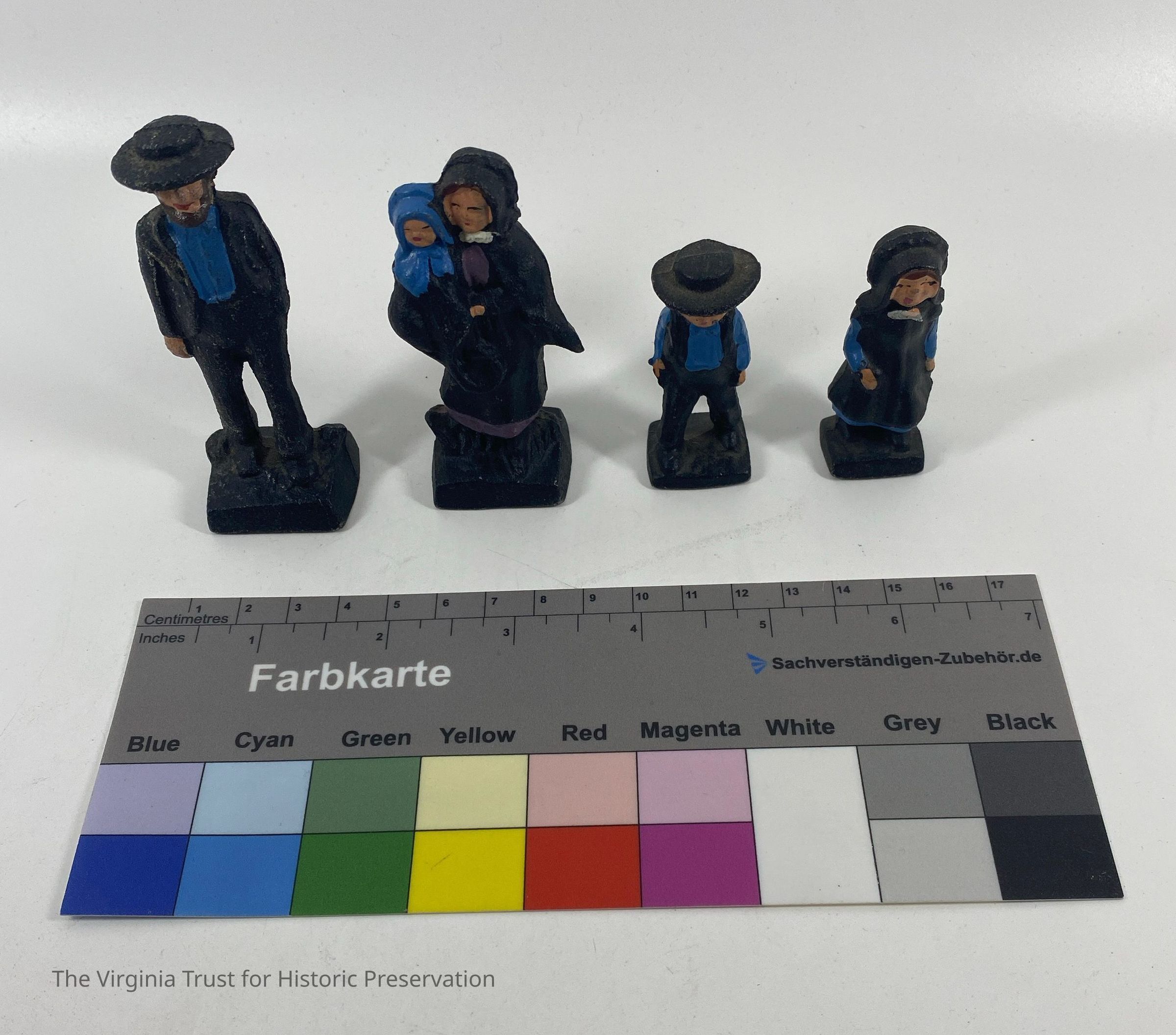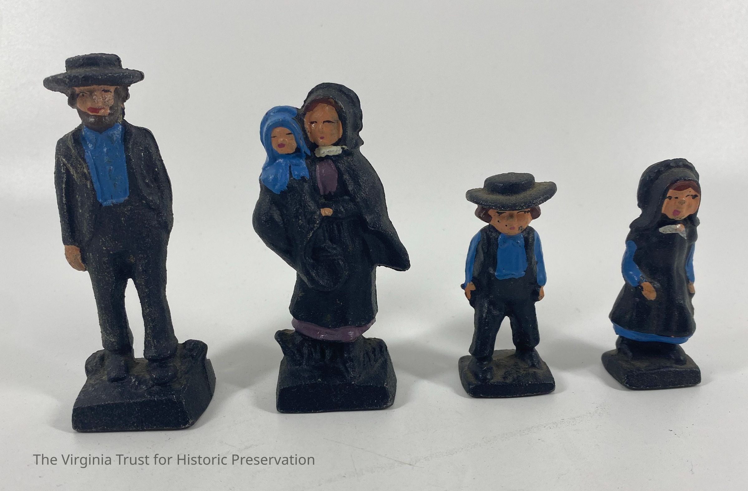 Four metal figurines of an Amish family. Man (A), woman holding child (B), boy (C), and girl (D).