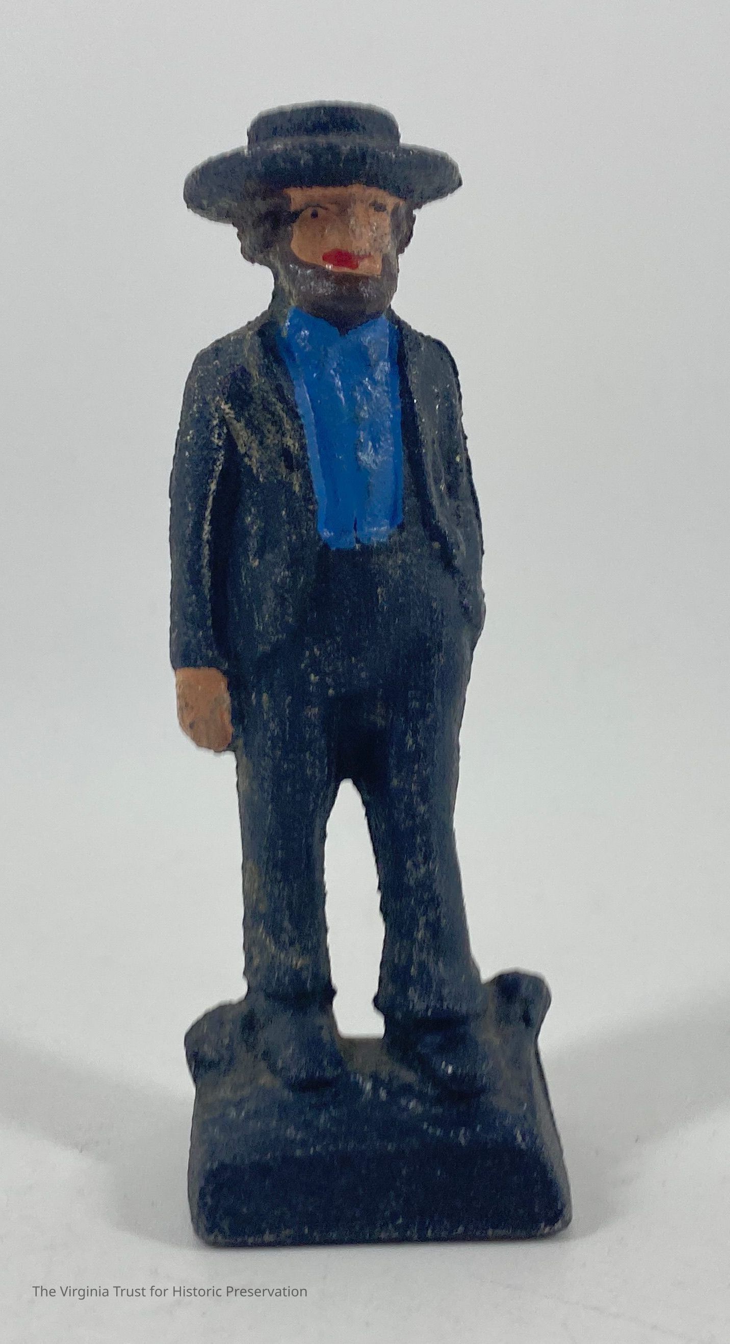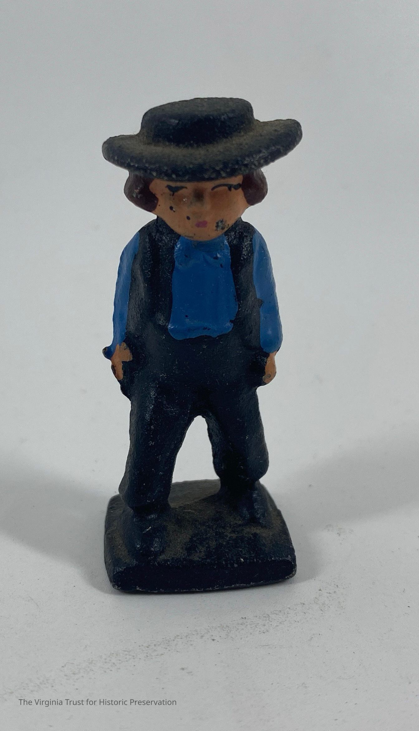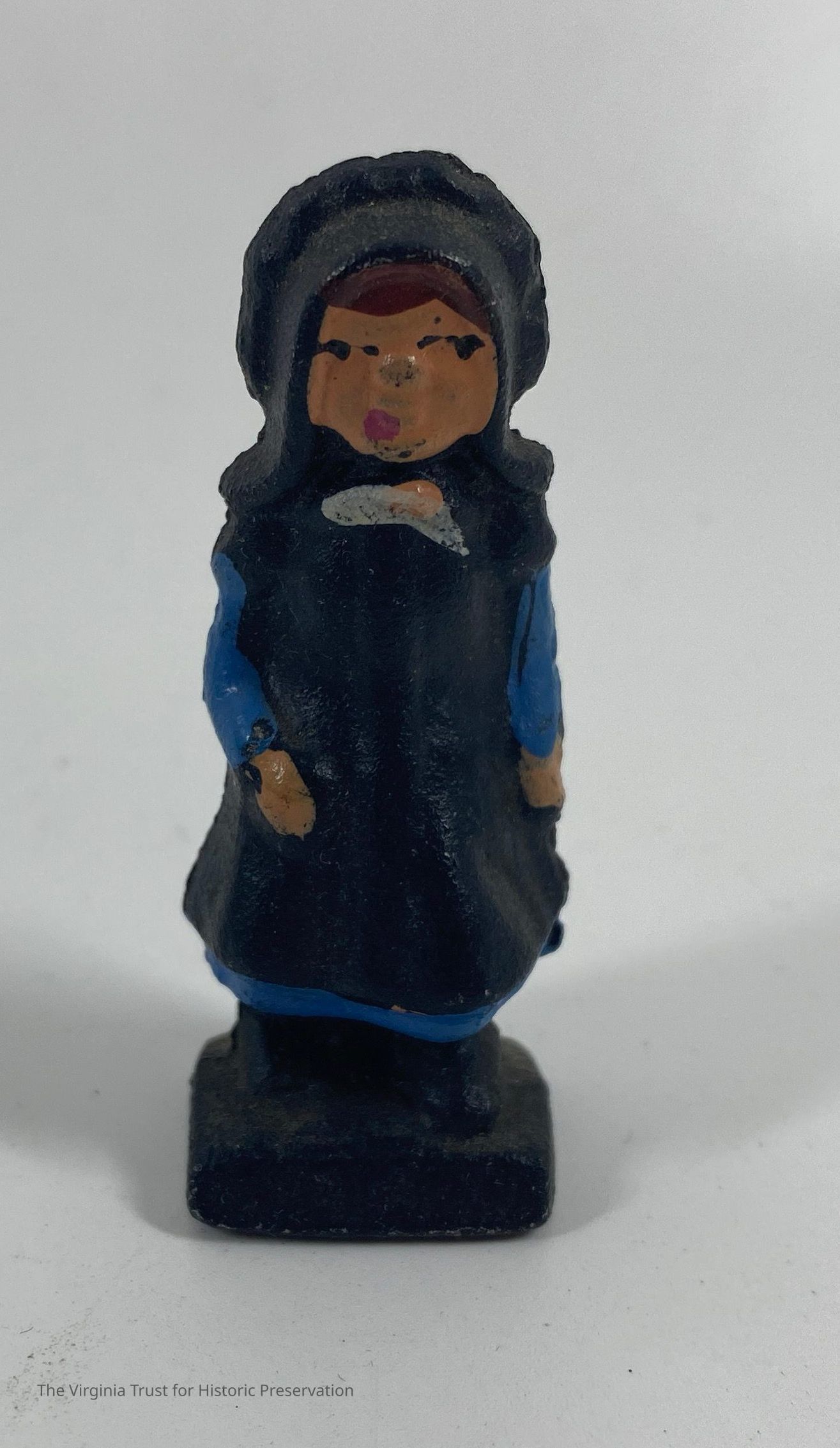 Four metal figurines of an Amish family. Man (A), woman holding child (B), boy (C), and girl (D).
