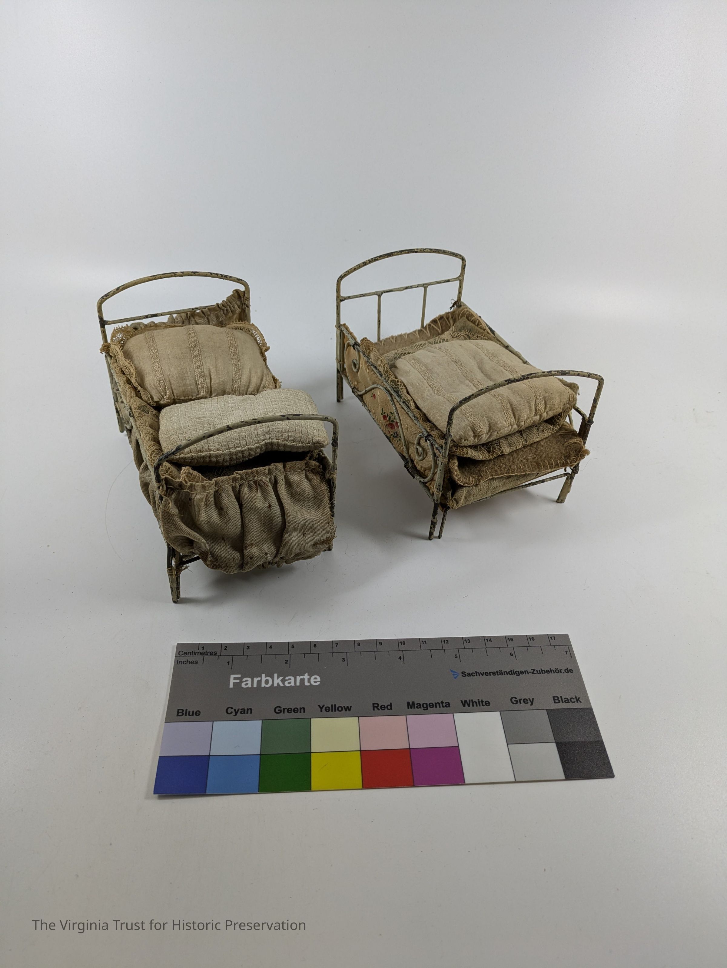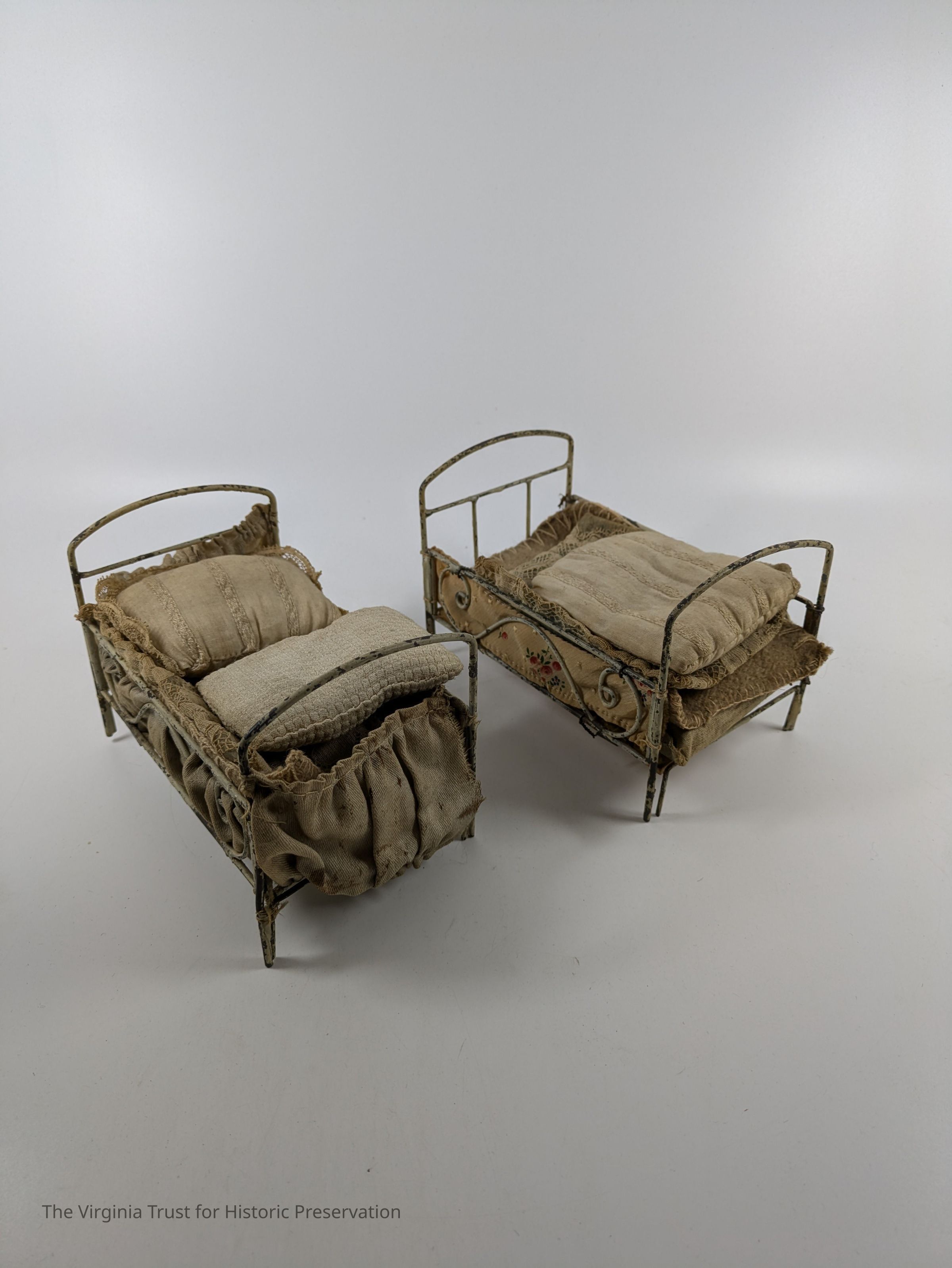 Pair of miniature white wire beds with bedding for a dollhouse. Victorian.