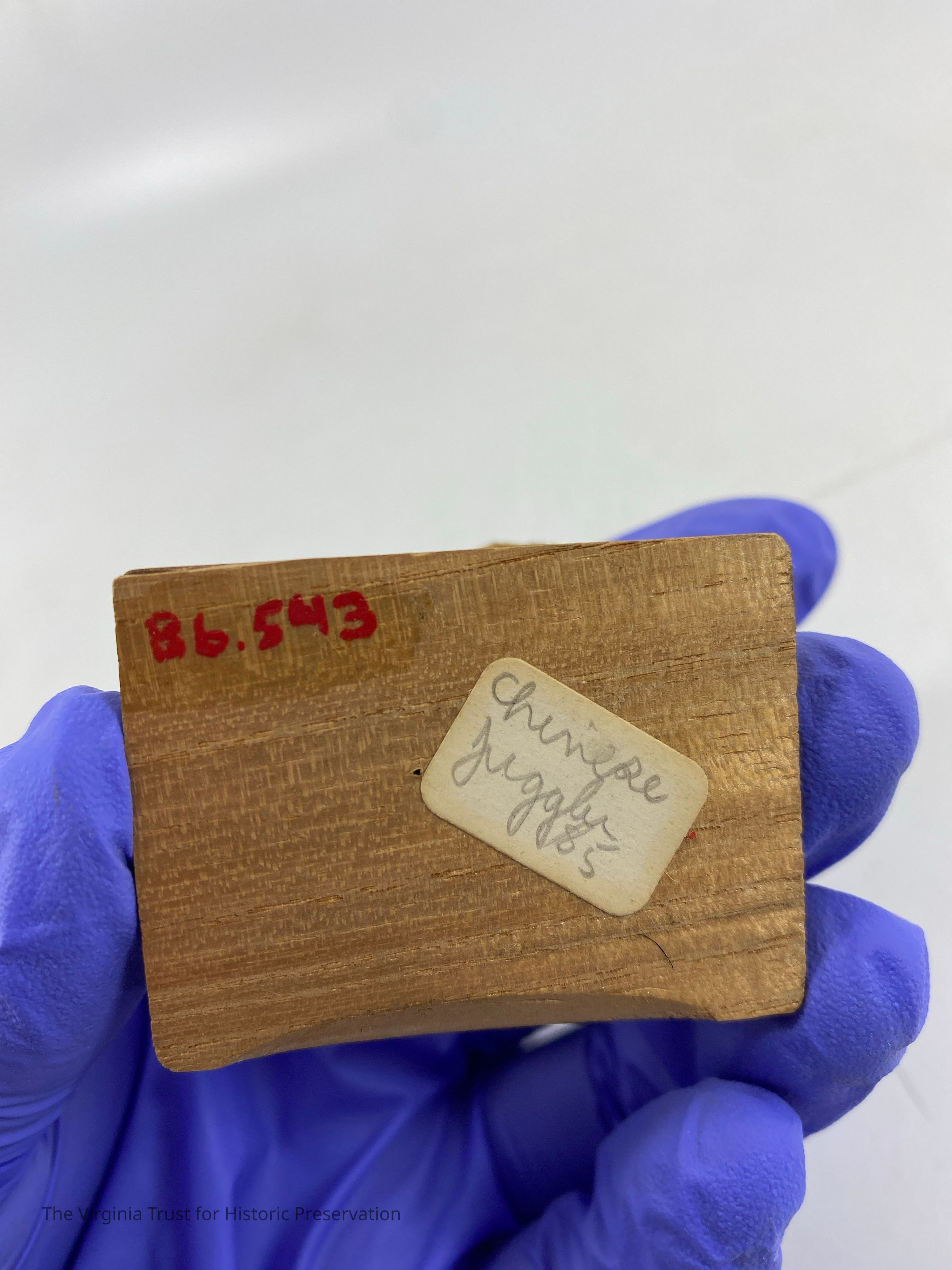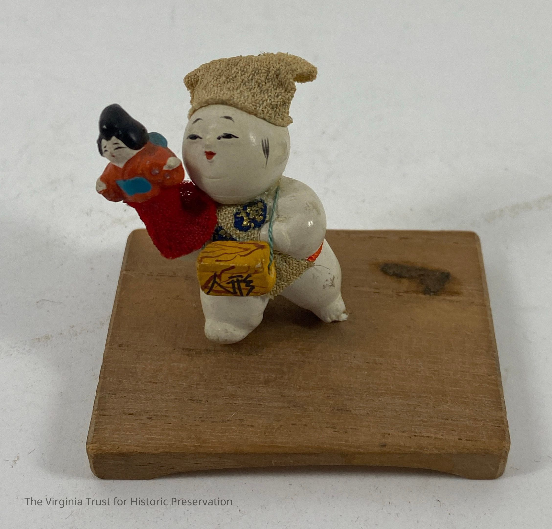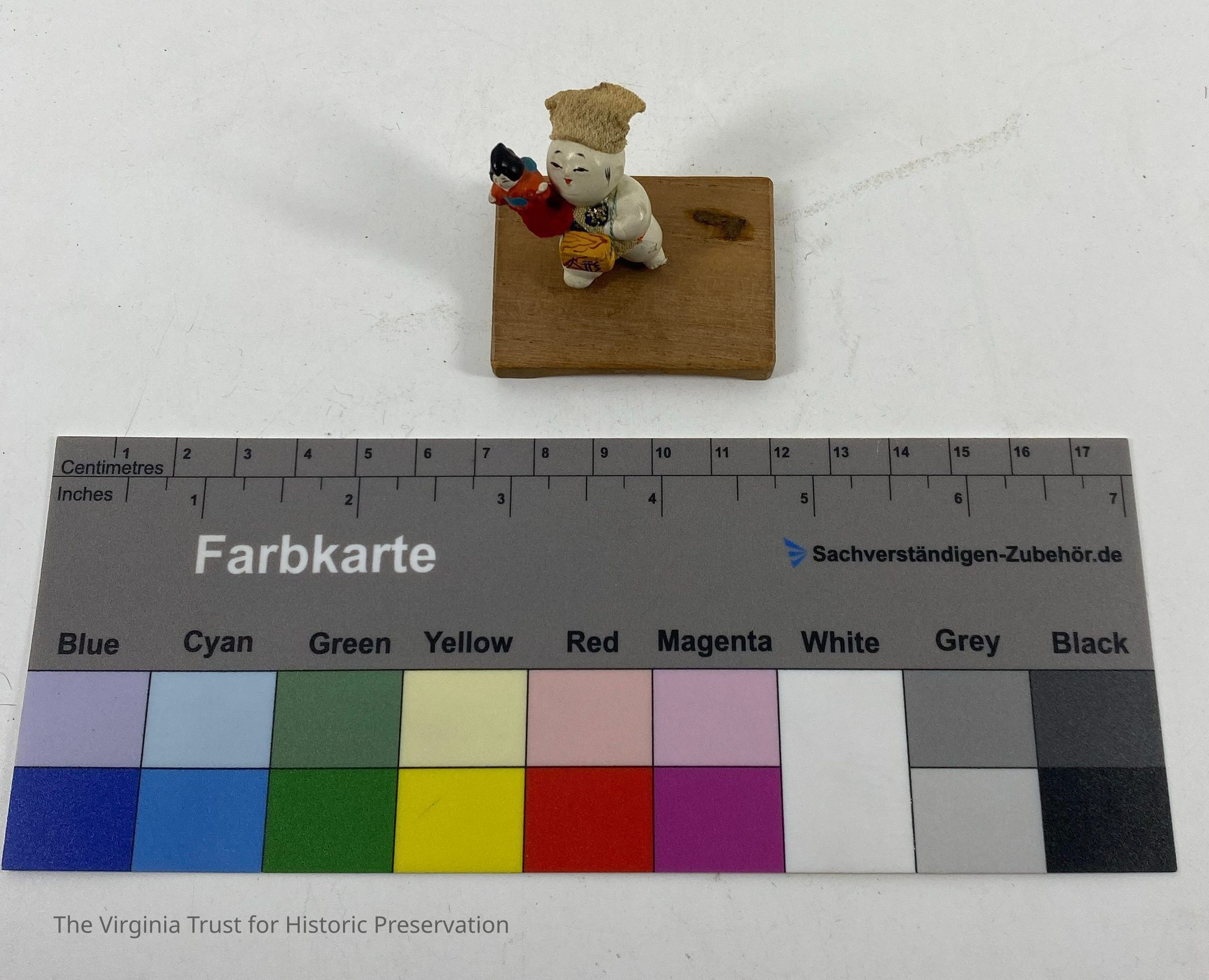 Small Chinese juggler figure on a wooden base; figure is white and carries a puppet dressed in orange and red. Sticker on bottom of base reads "Chinese Juggler, $5."Dimensions