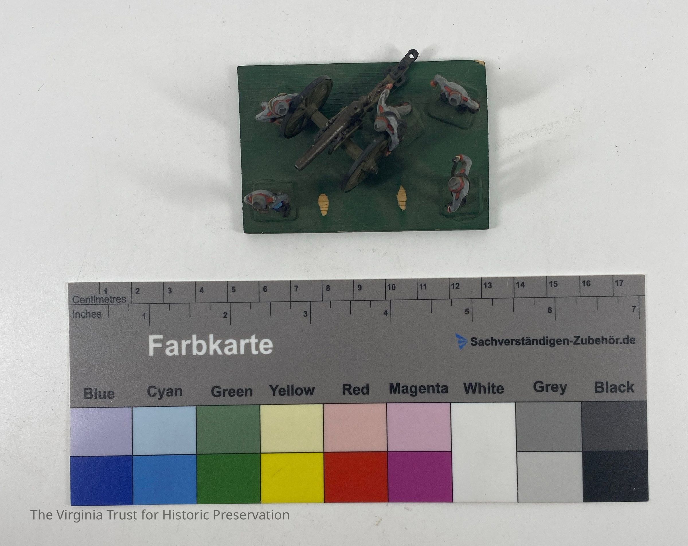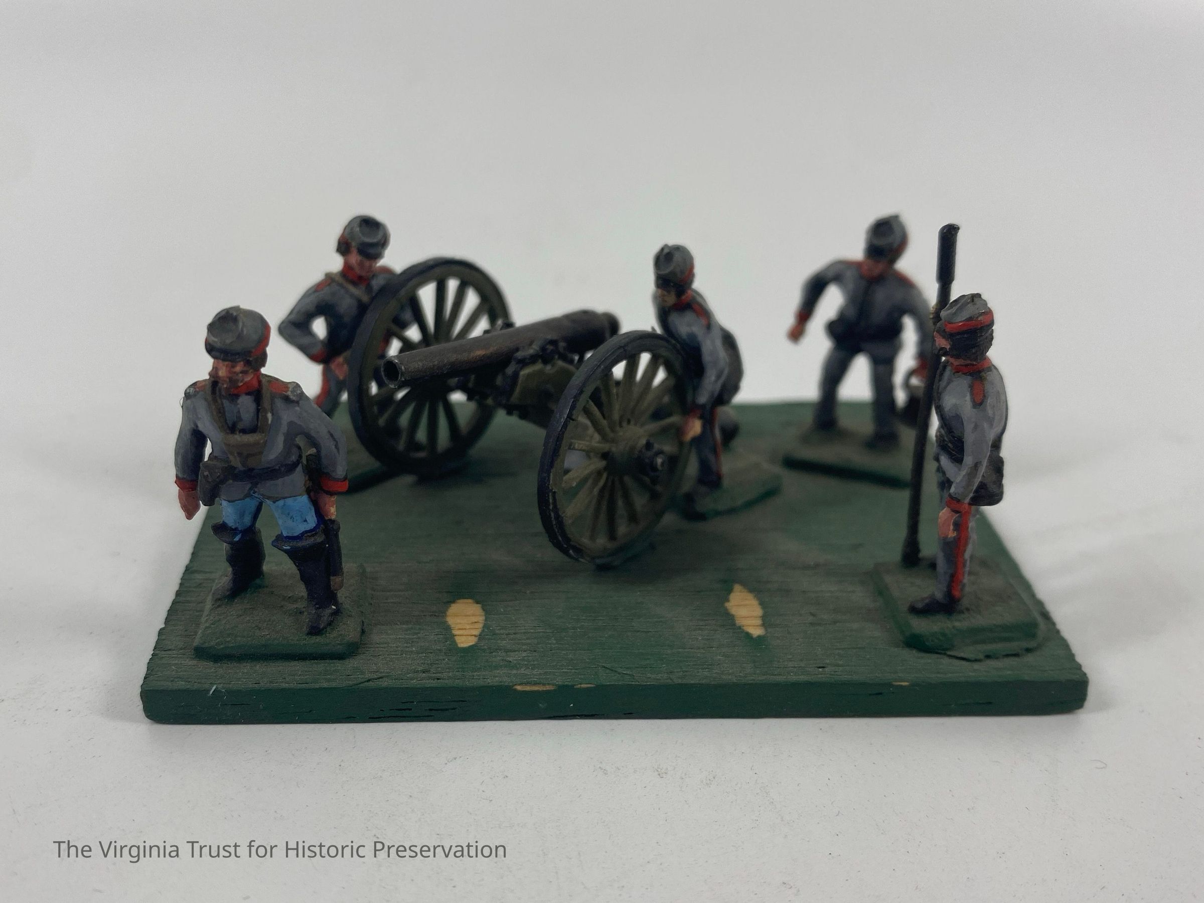 5 soldiers in gray uniforms with red trim surrounding a cannon. Wood base, wood cannon, soldiers made of clay (?) and paintedDimensions