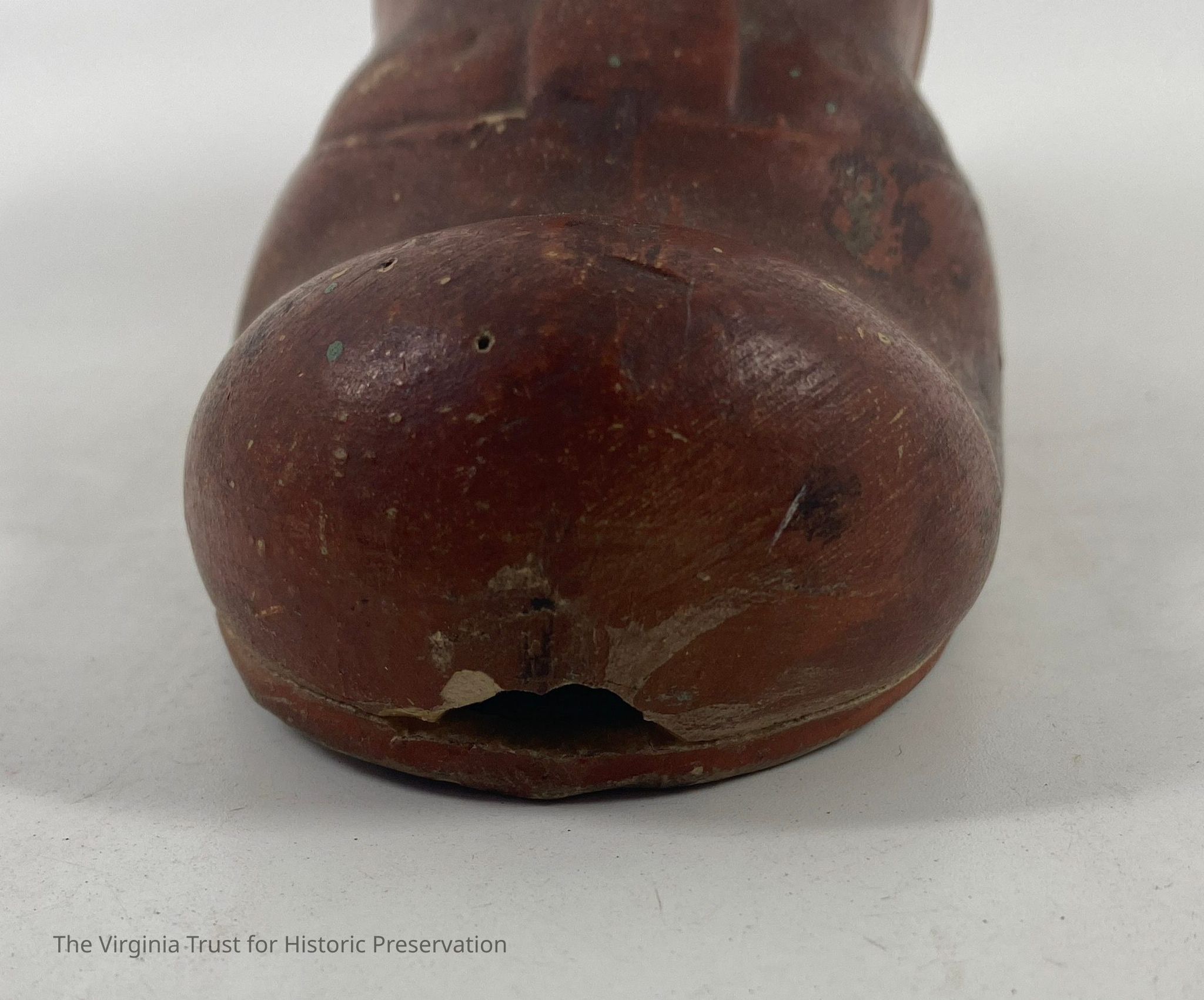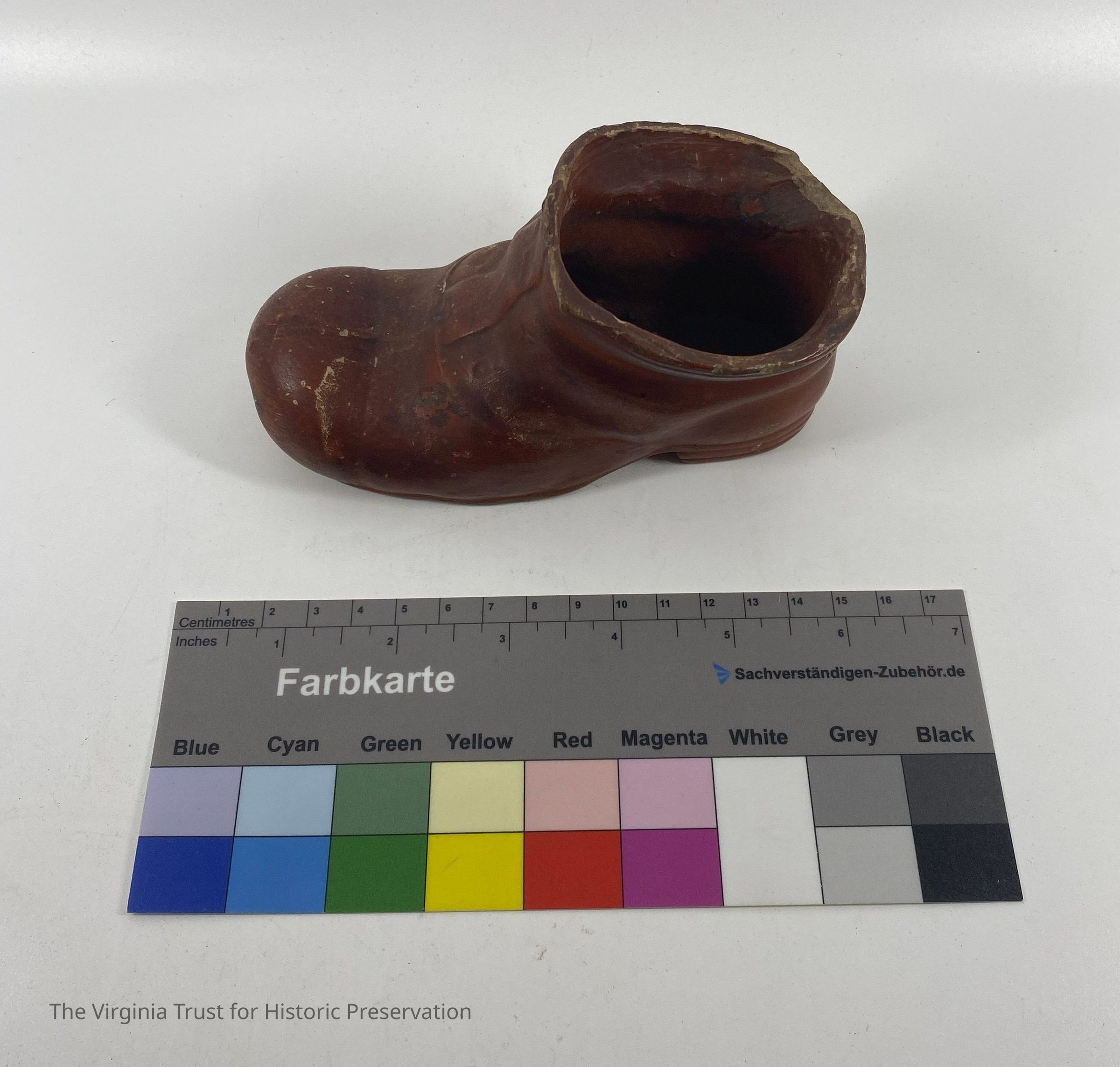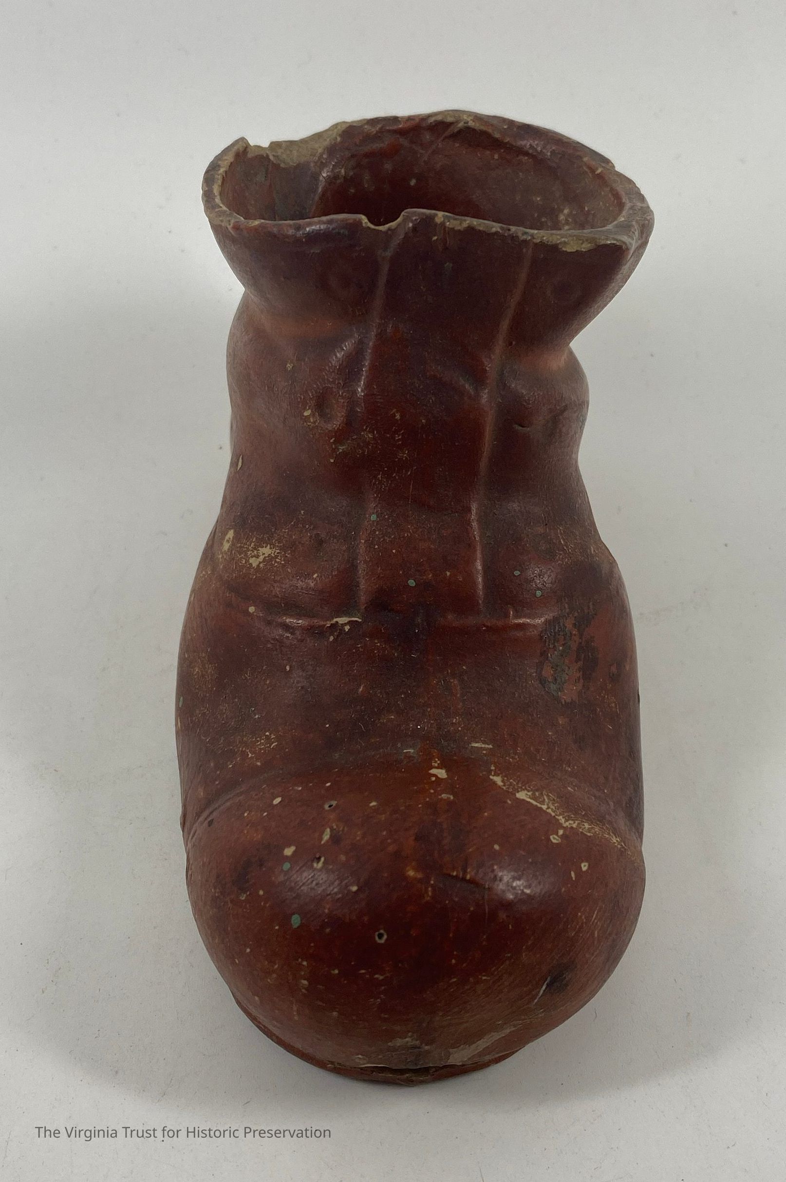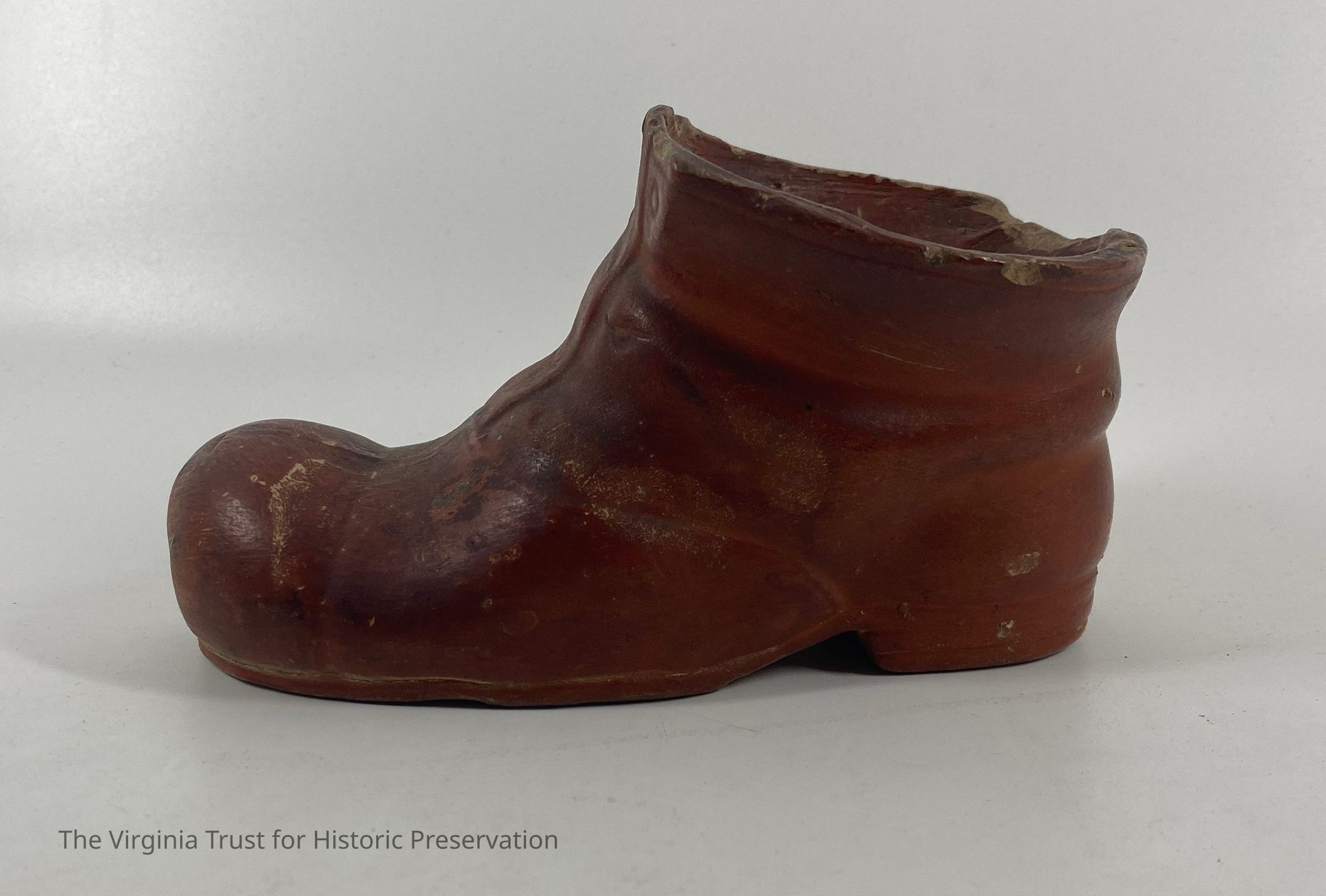 Red-brown ceramic shoe for a right foot. Sticker on bottom reads "Old Shoe - $5"