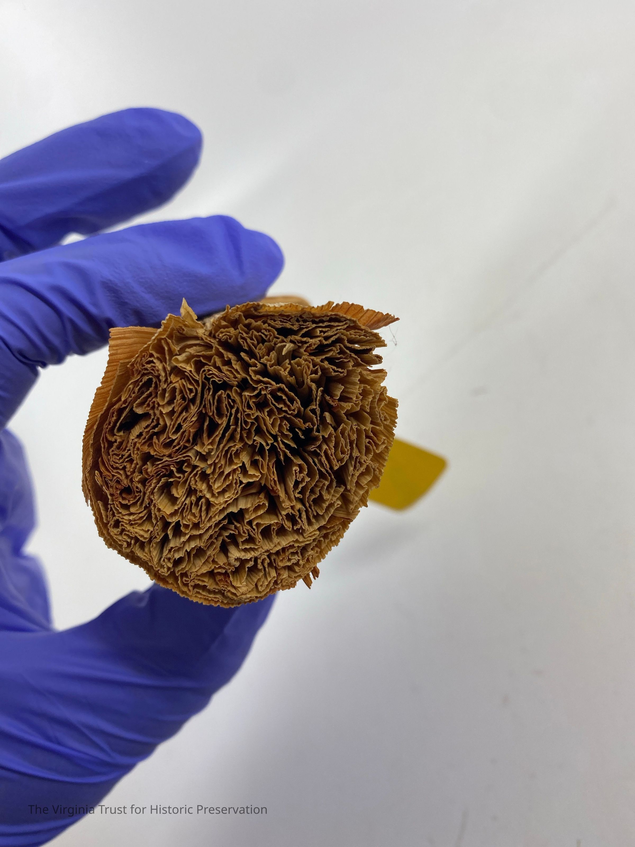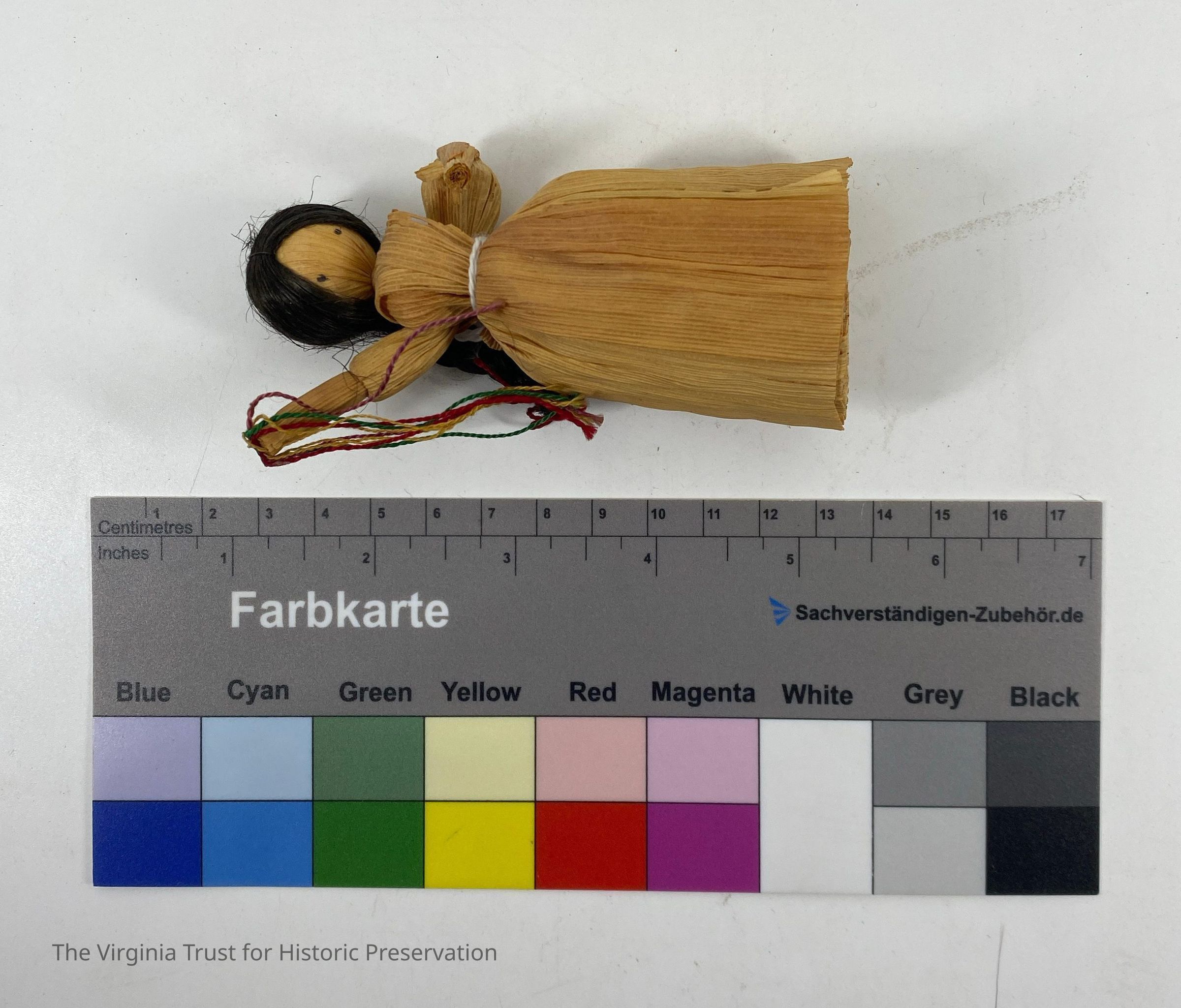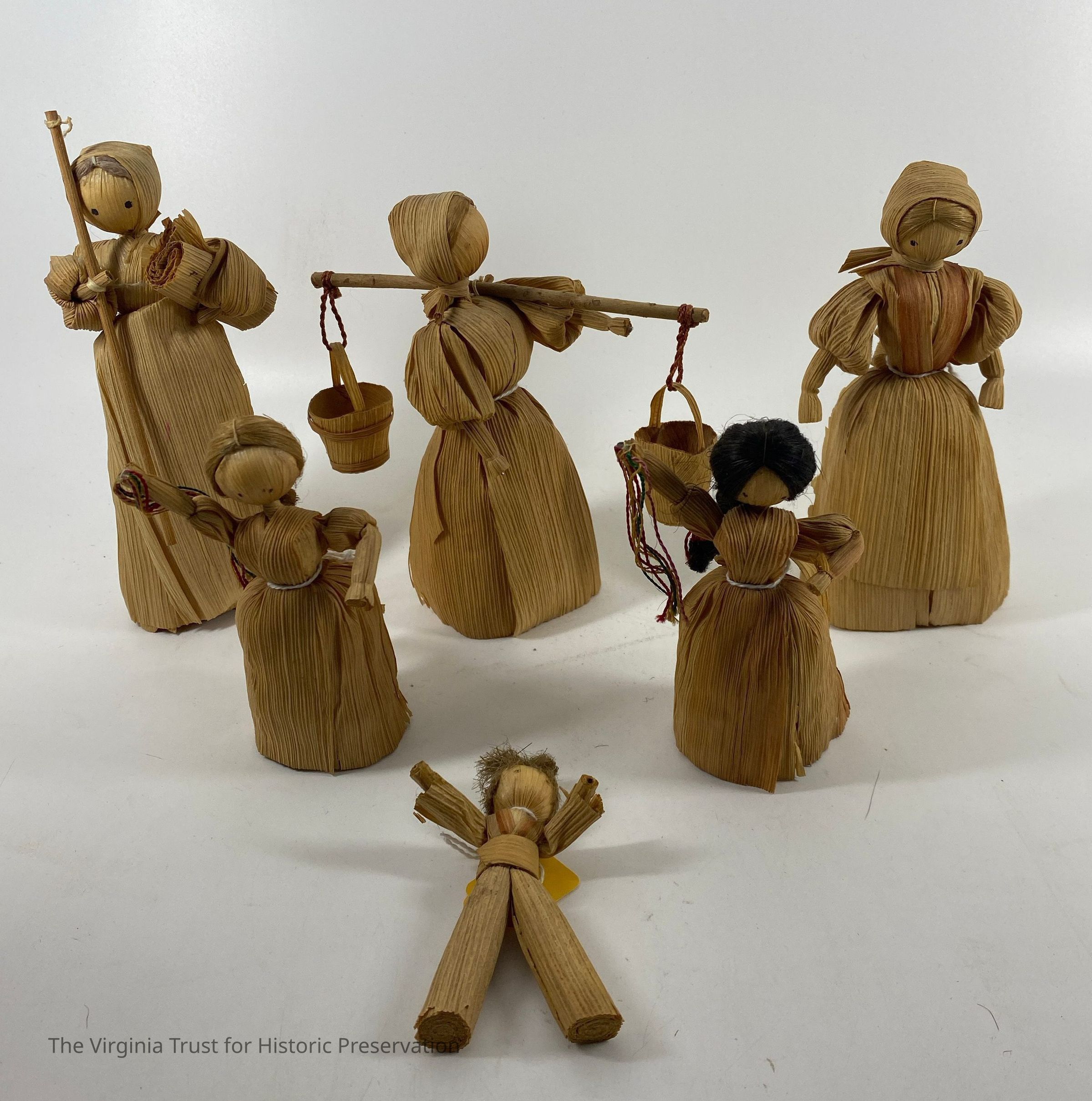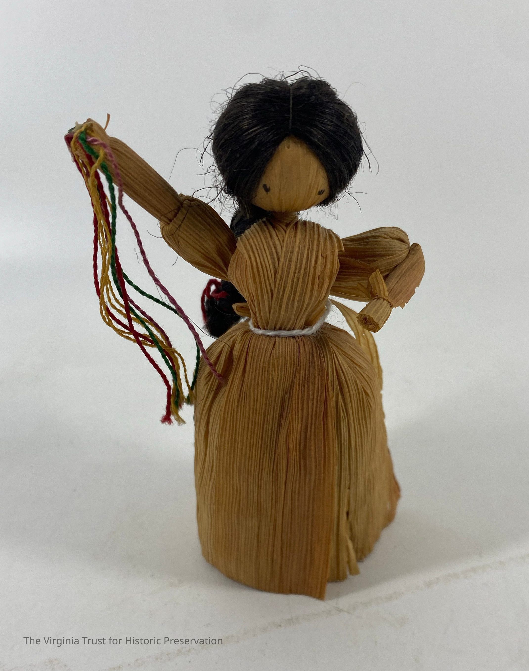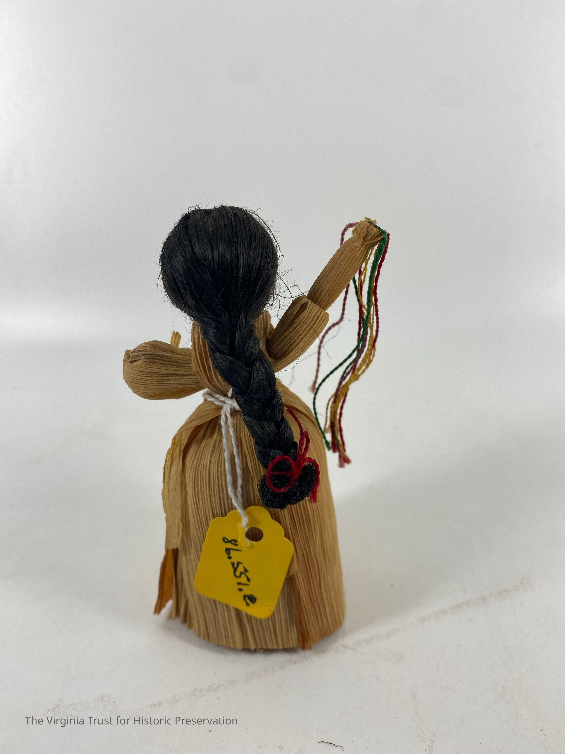 One of a set of six corn husk dolls. Girl with black hair holding multi-colored string.