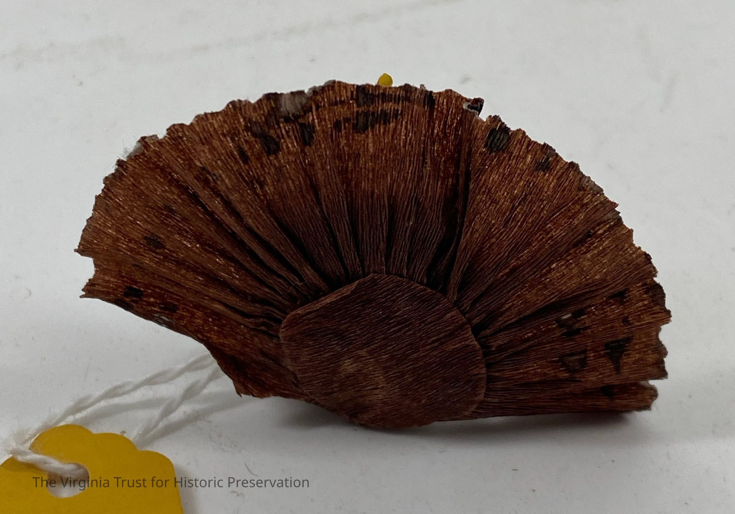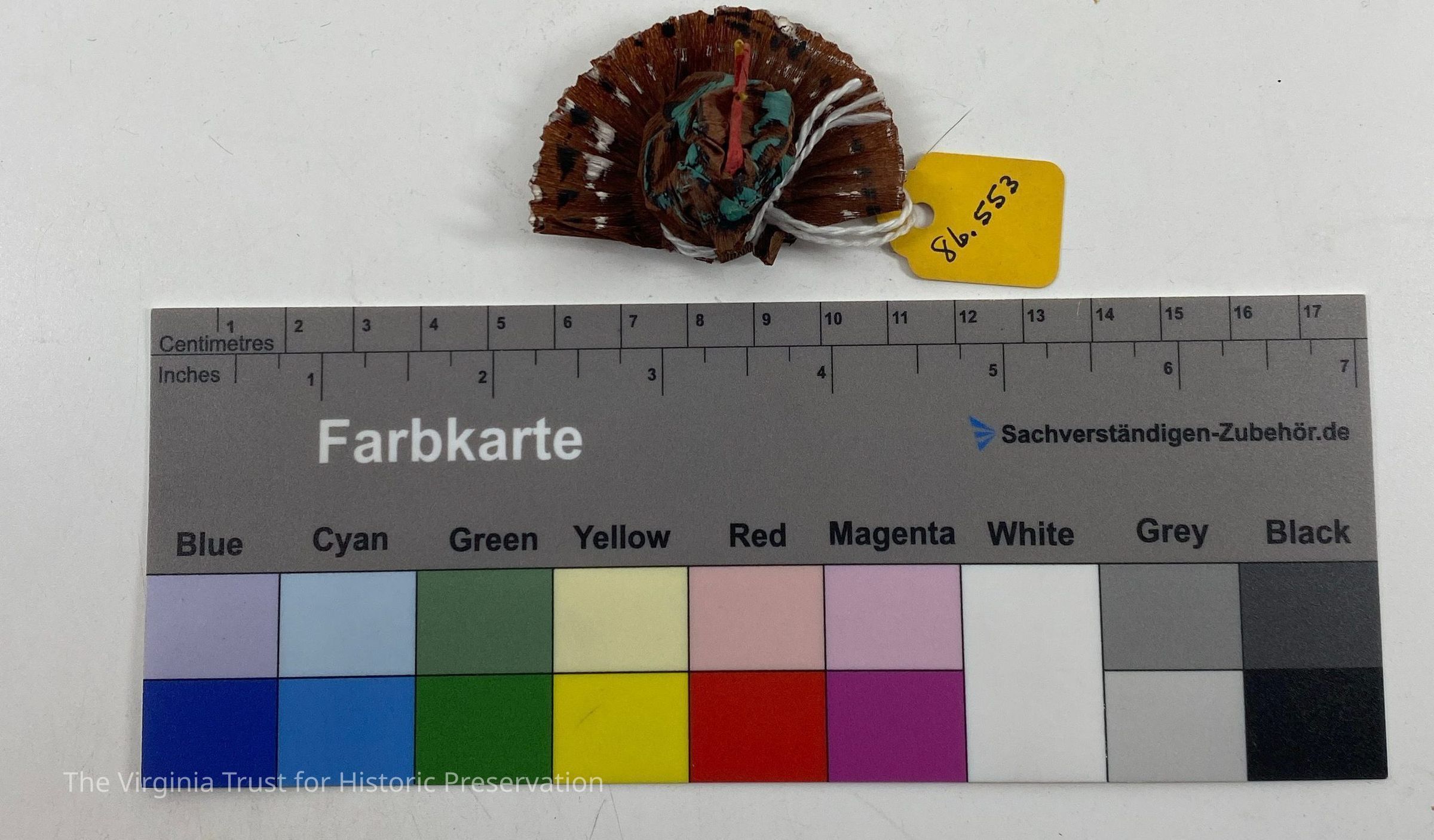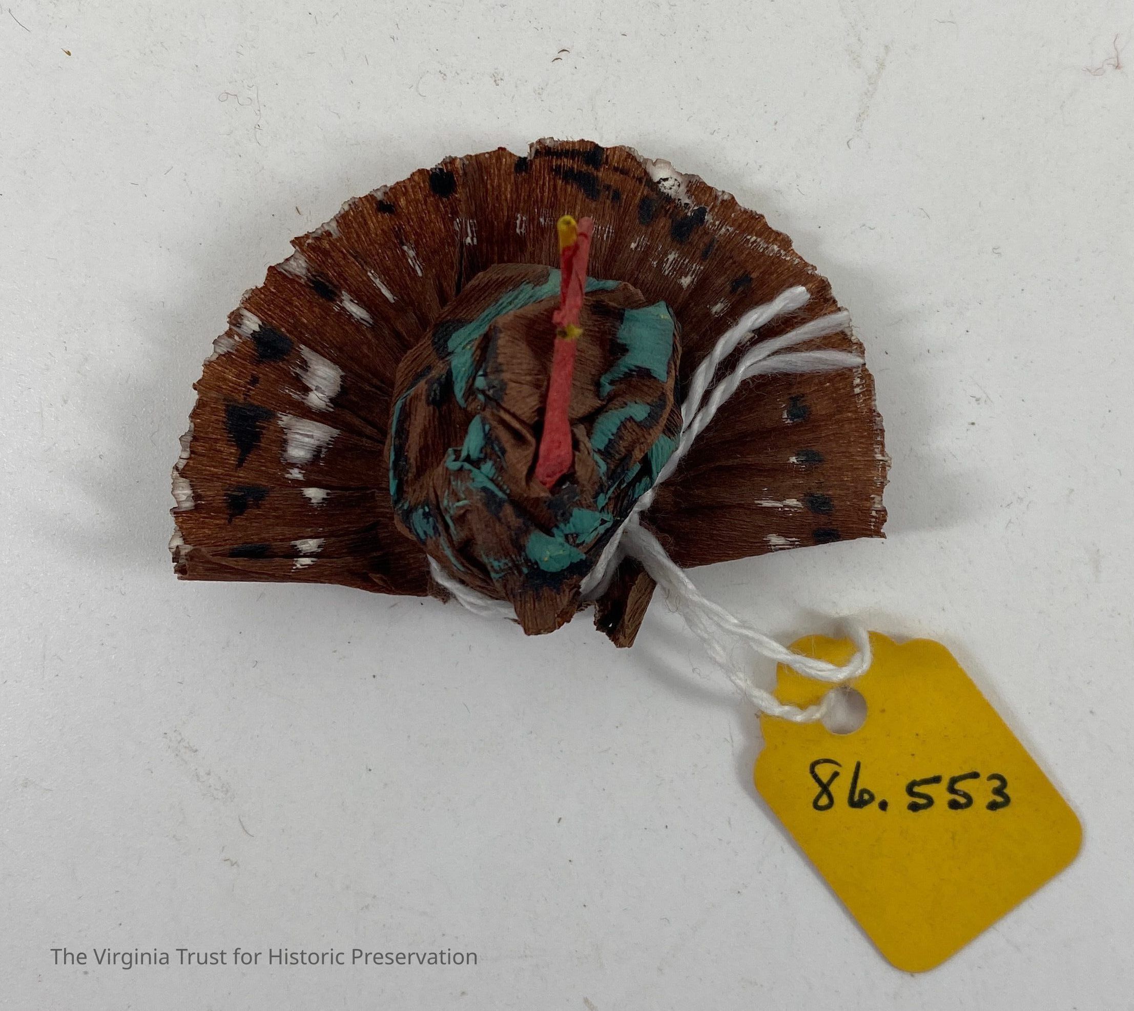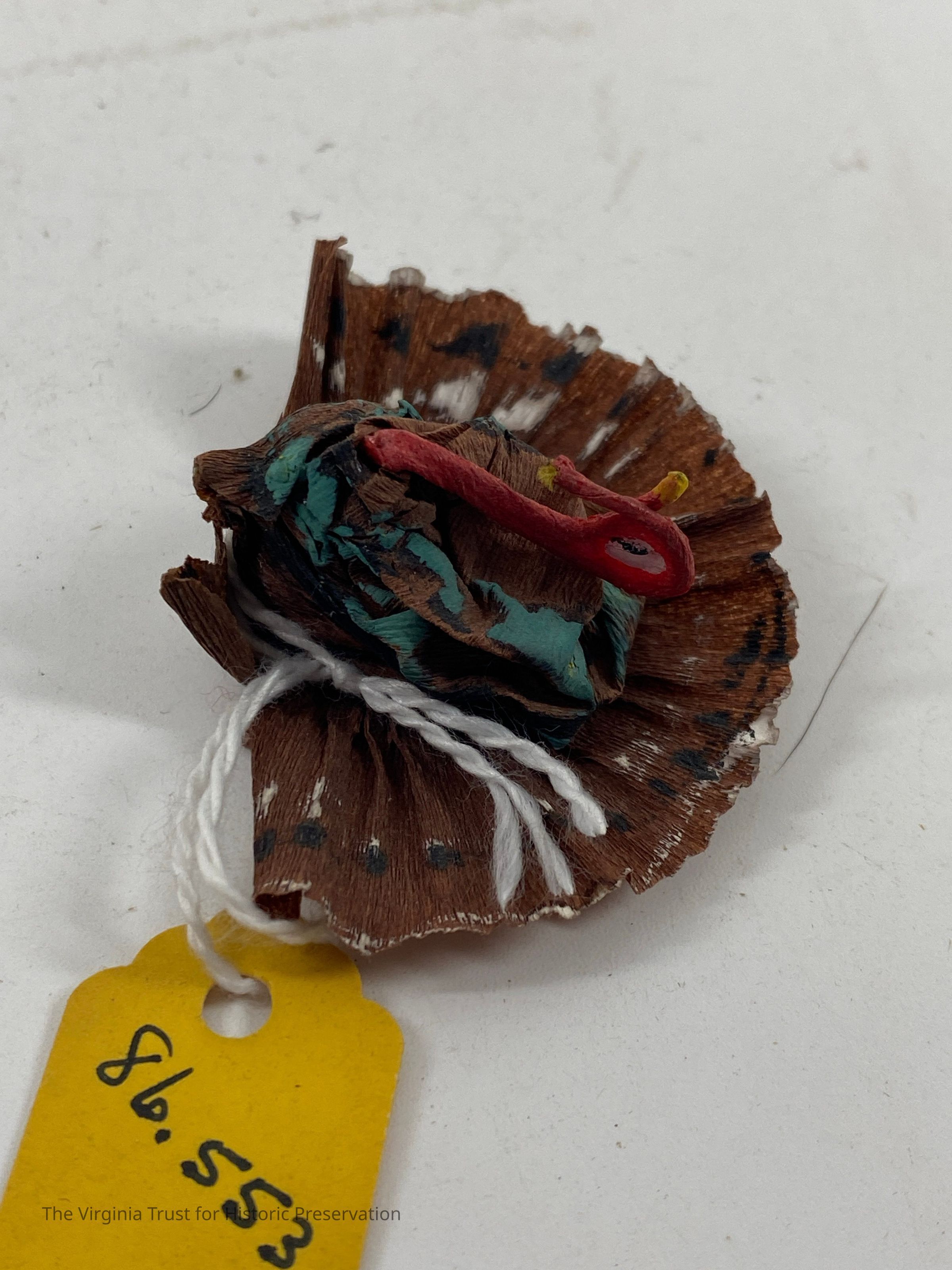 Turkey fashioned from cornhusks; brown with white, black, and blue trim and red head.