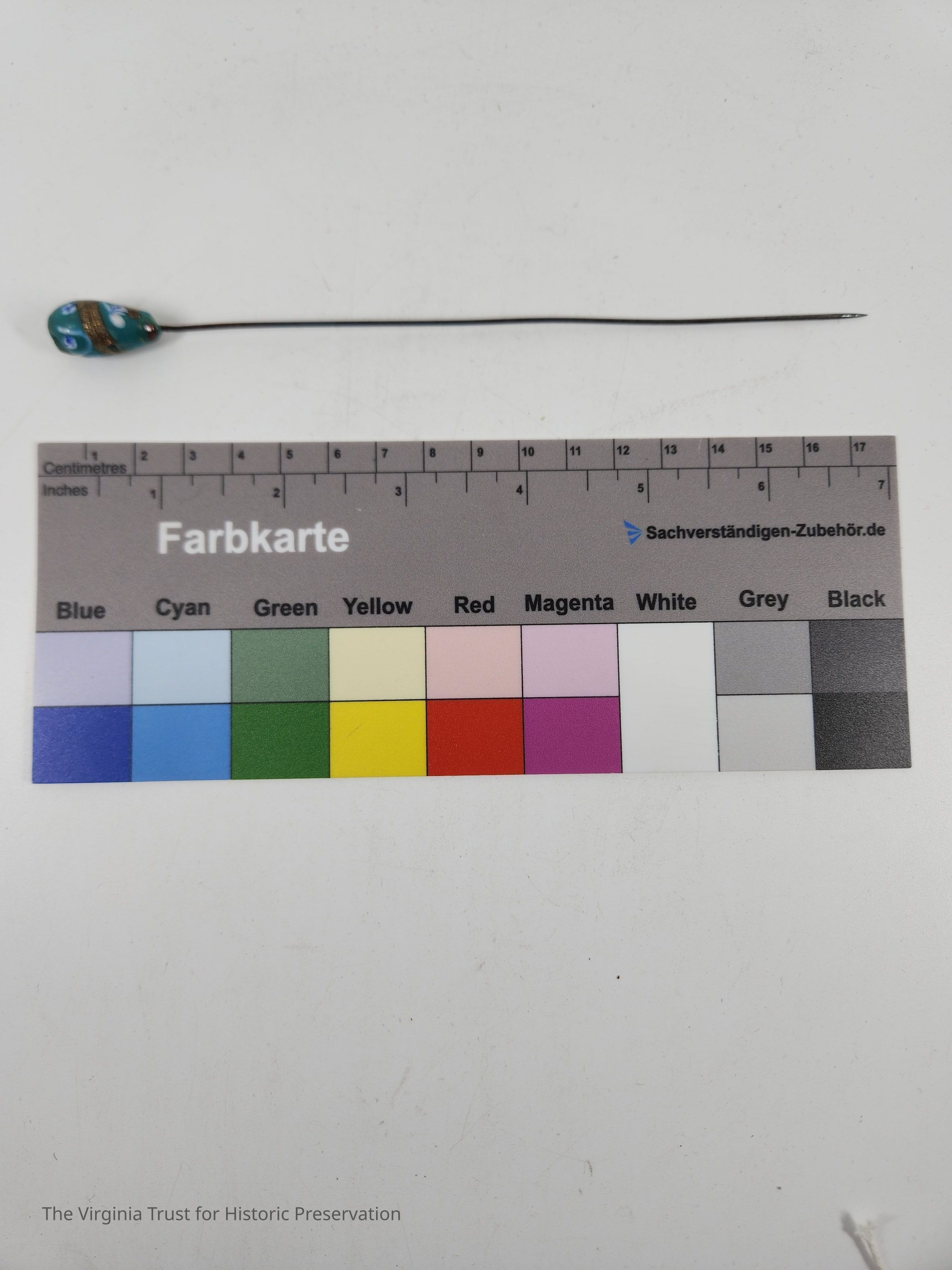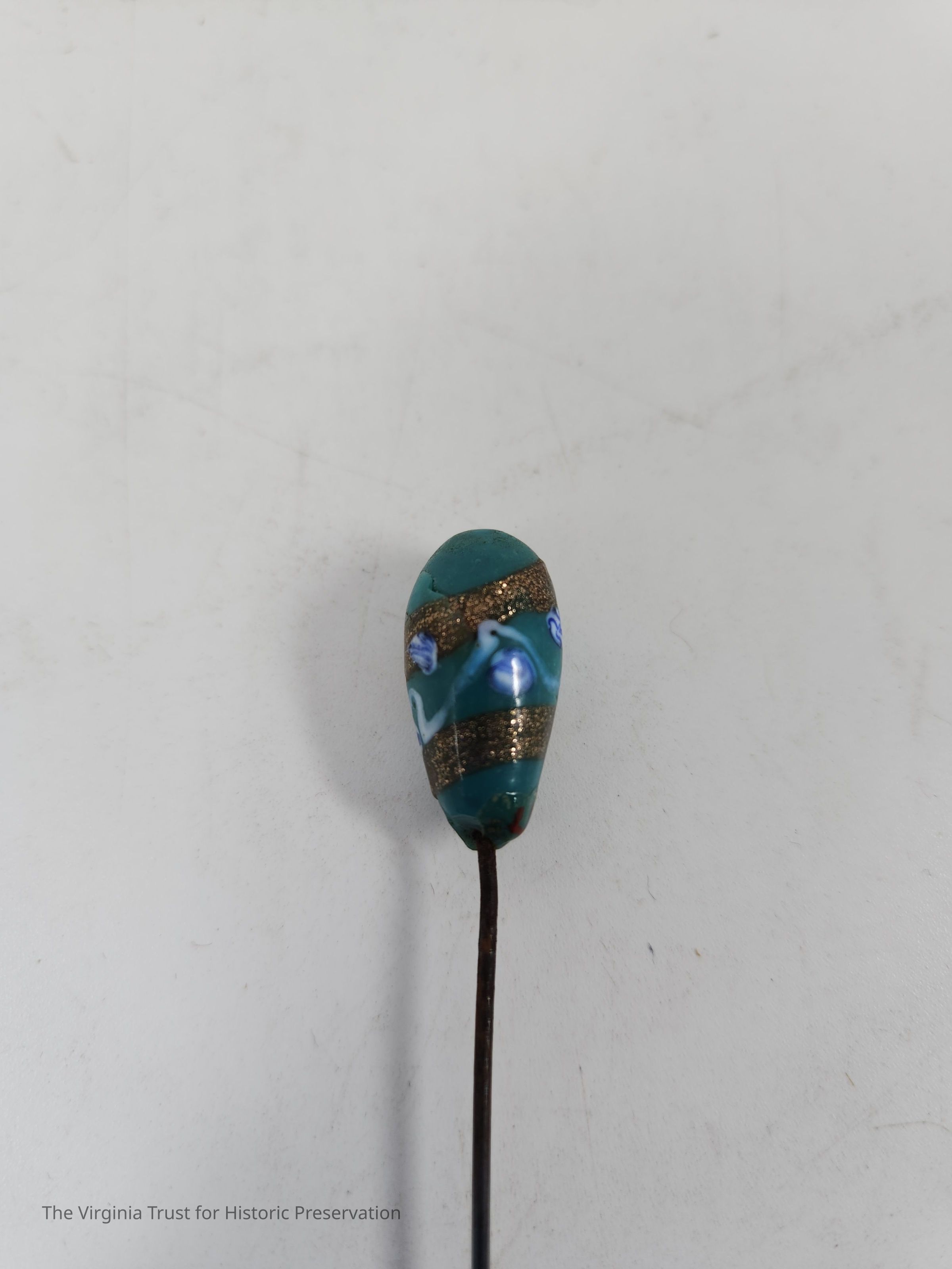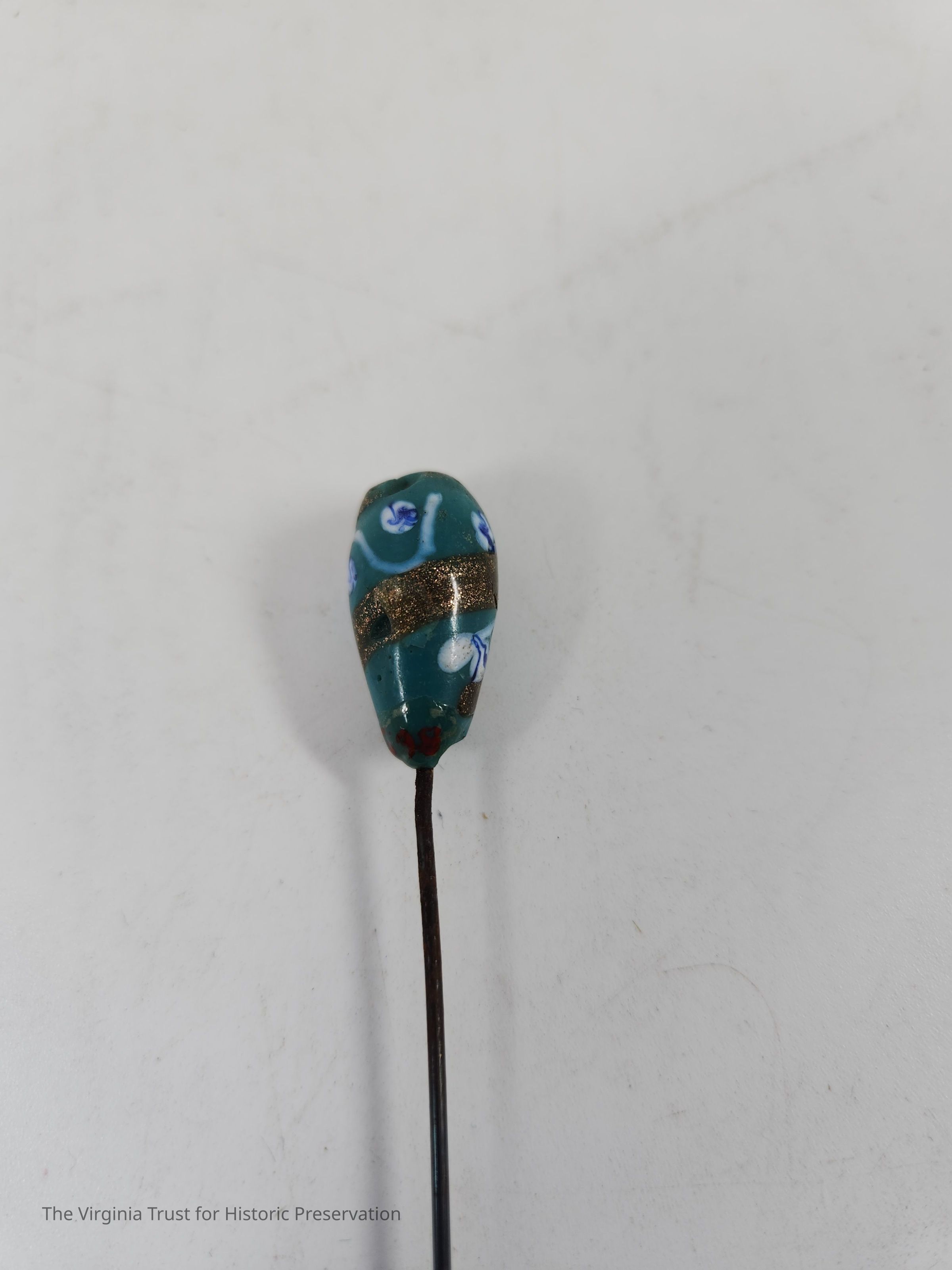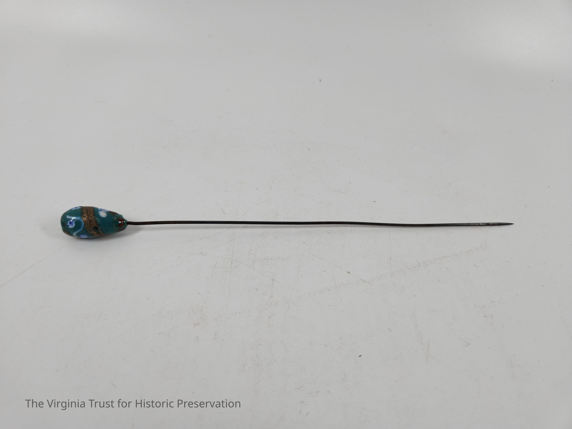 Turquoise hatpin with white, blue, and gold design and iron pin. One of a set of thirteen hat pins of assorted sizes and heads.Dimensions