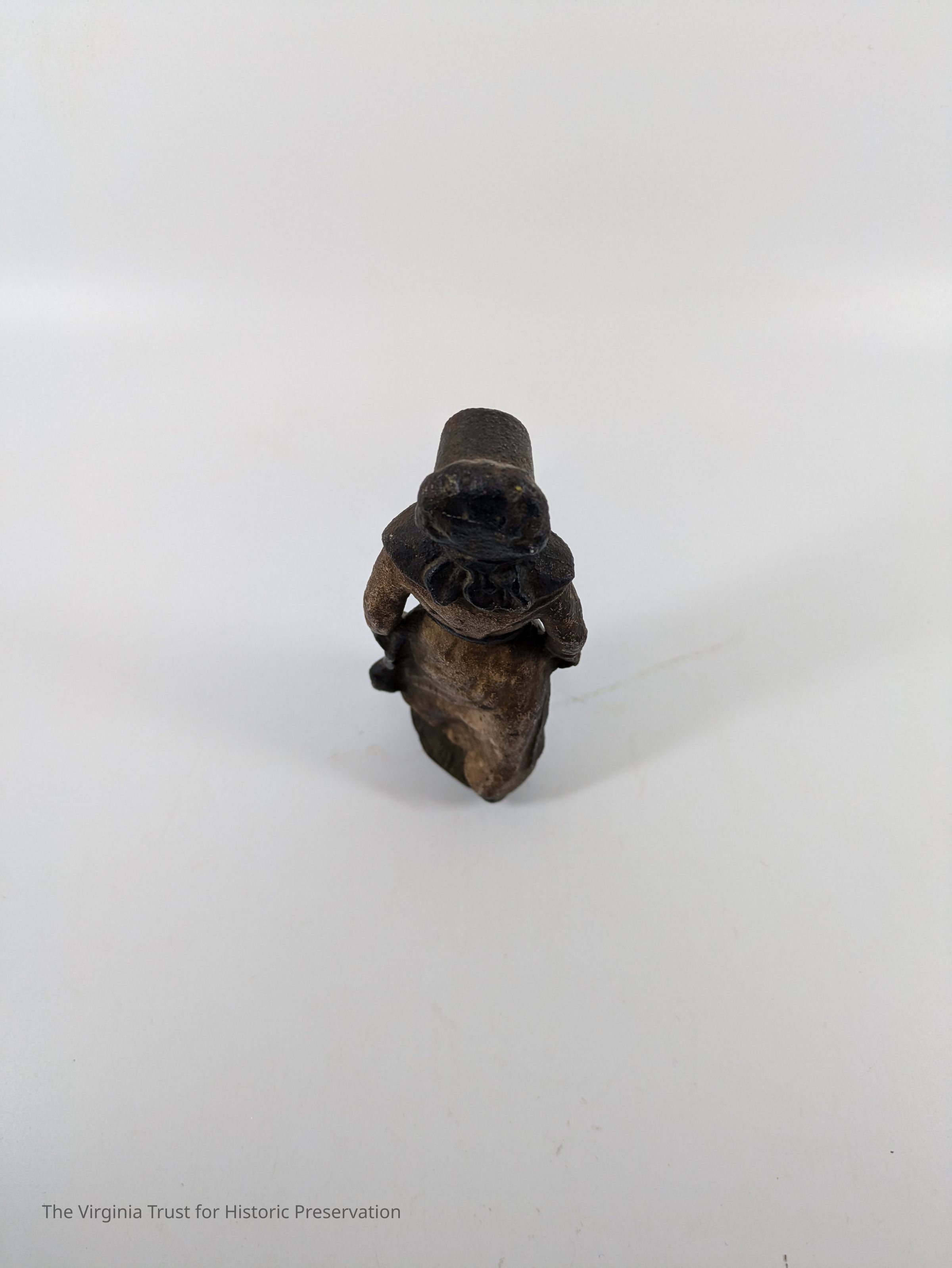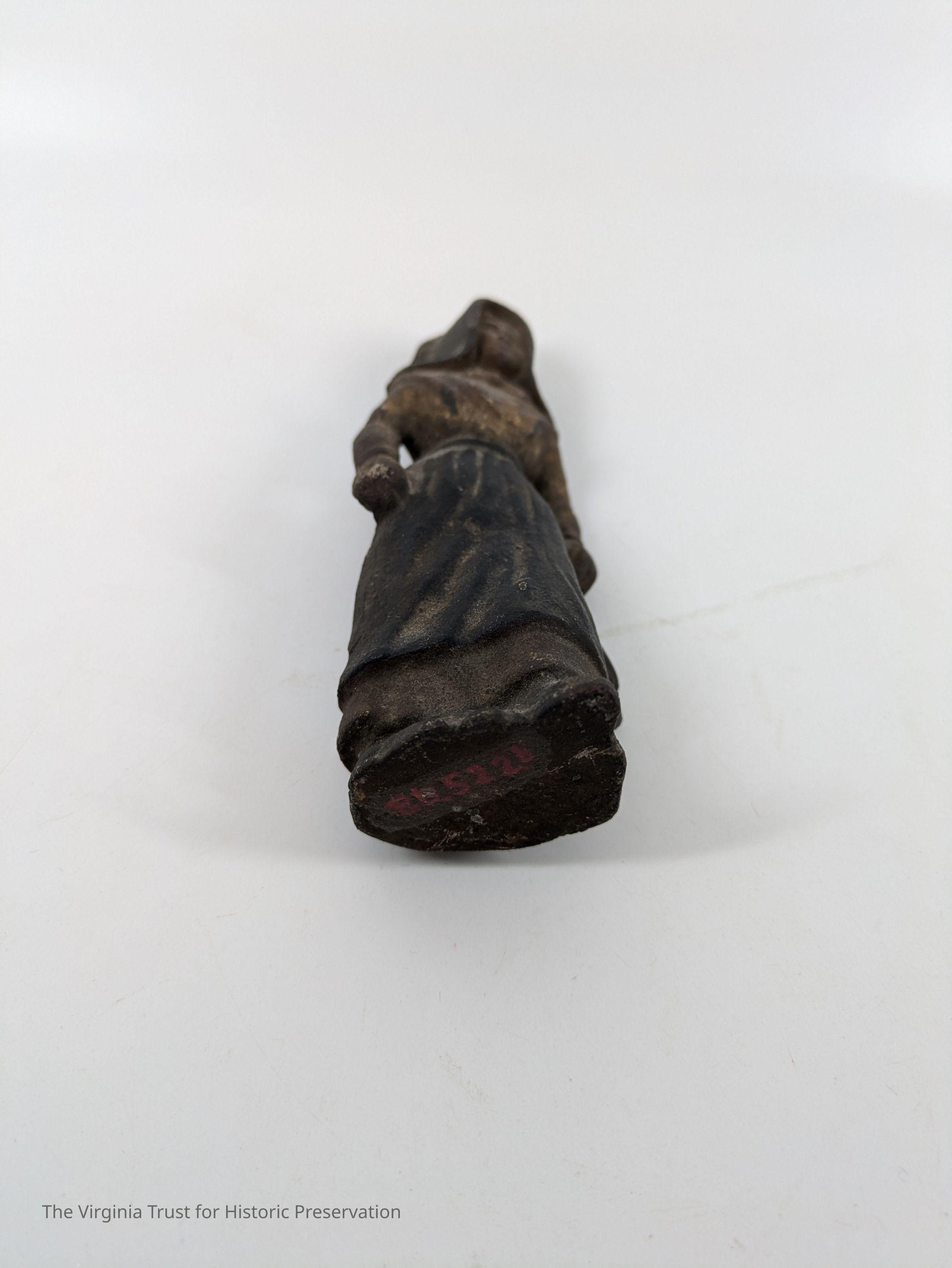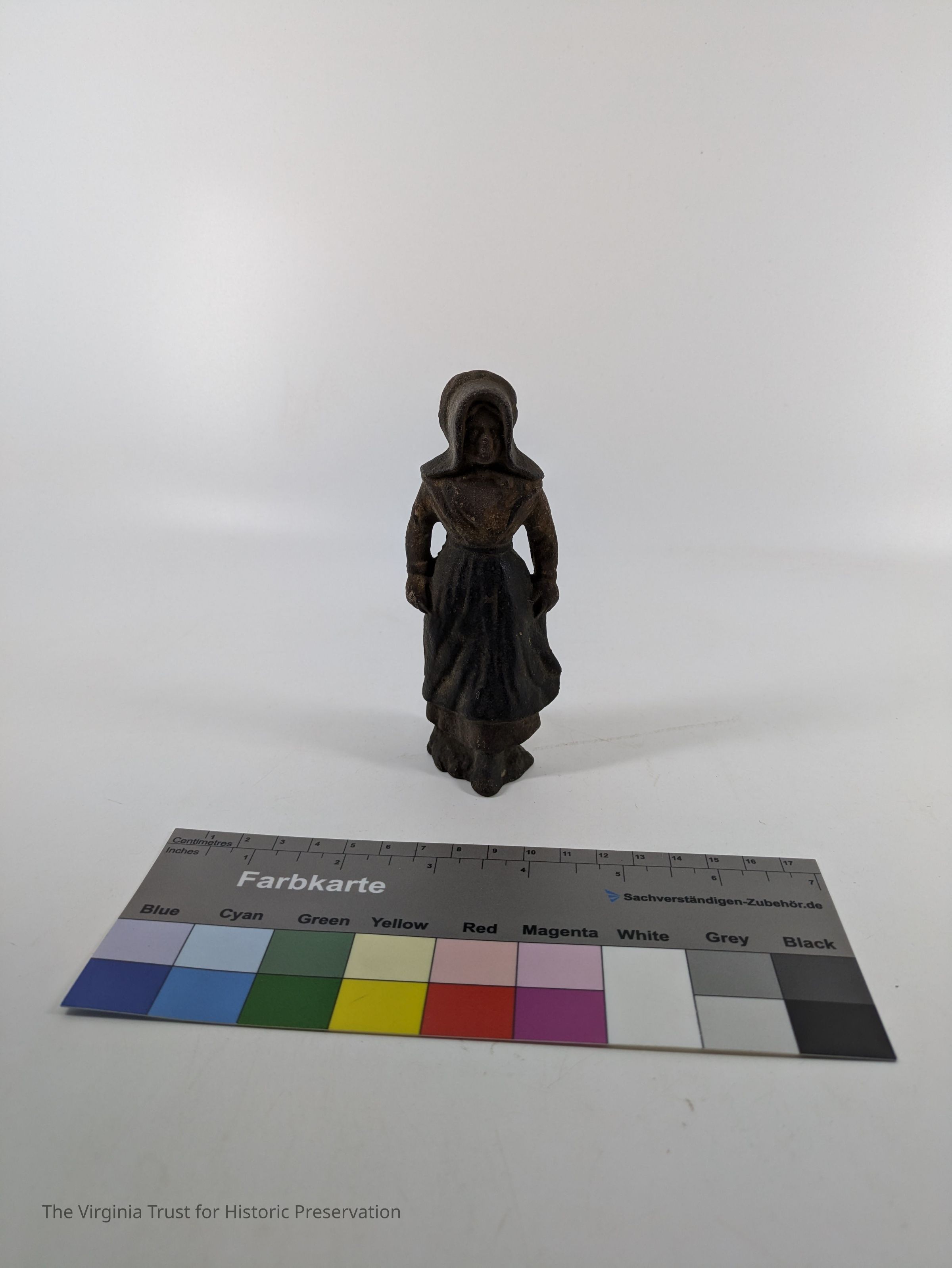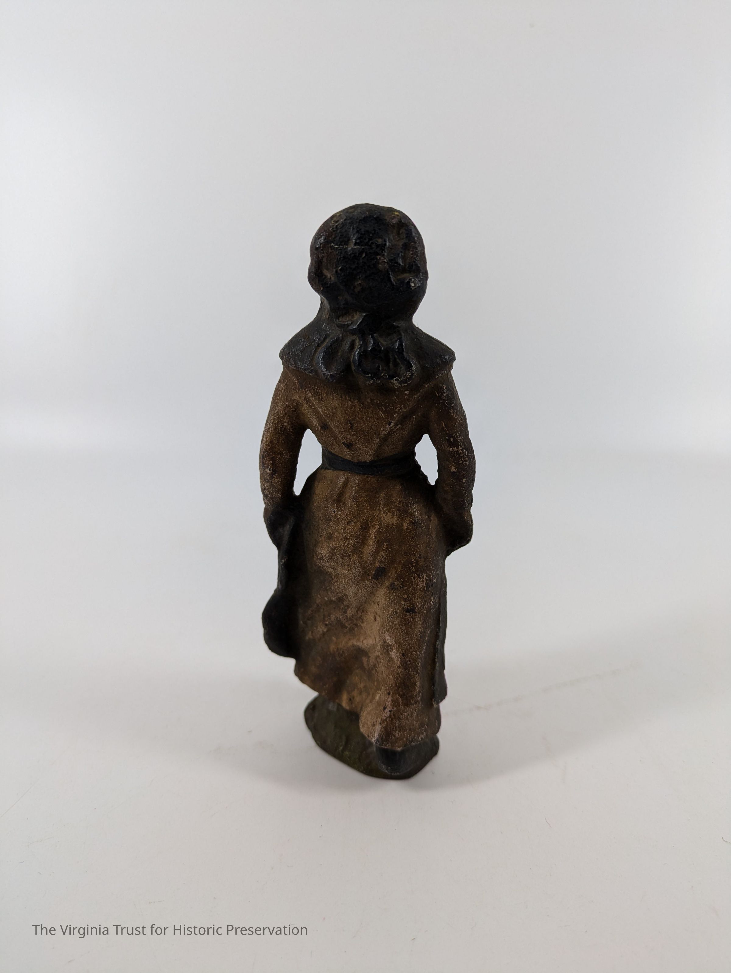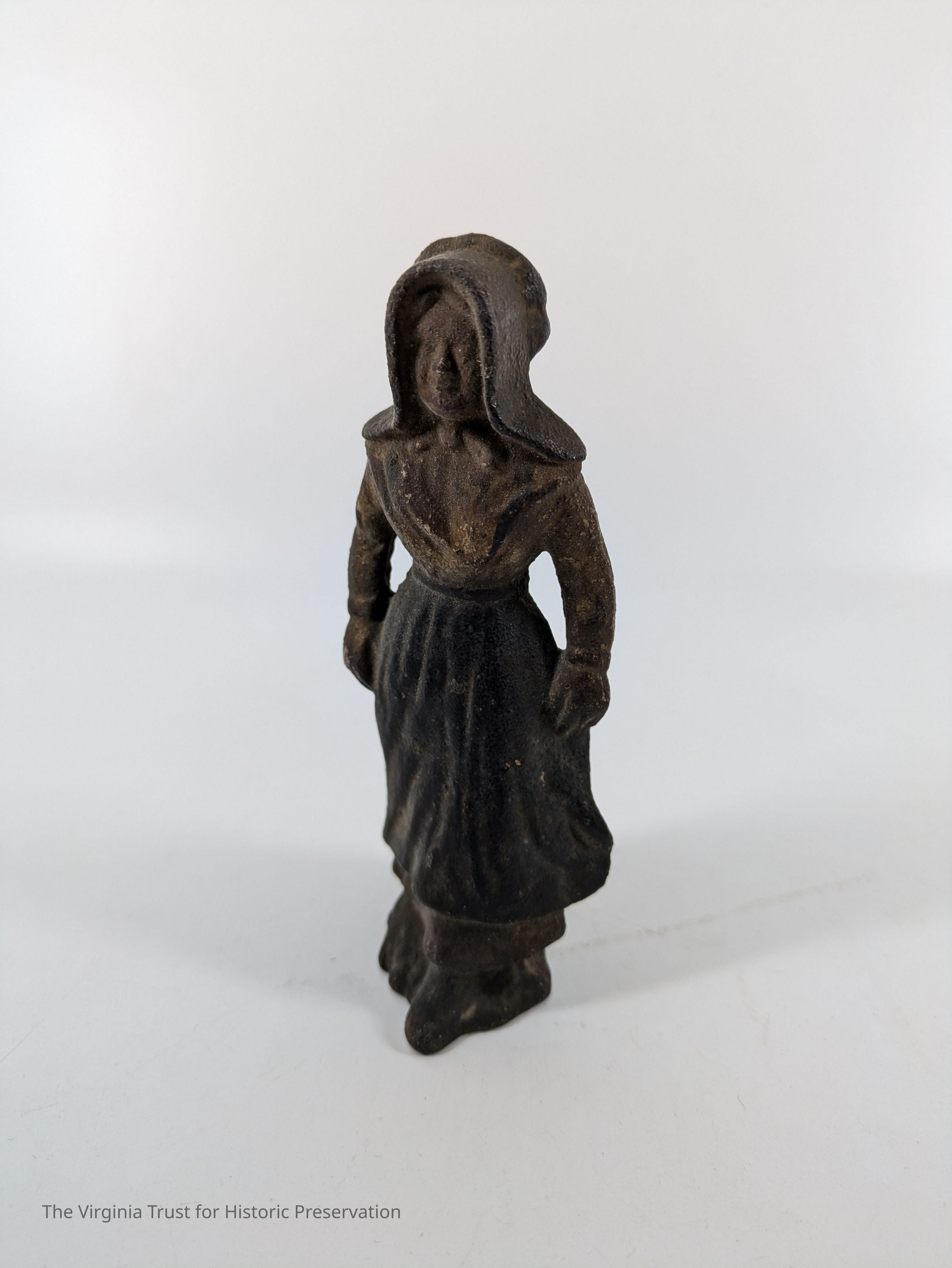 Metal (iron) figurine of an Amish woman. Part of a set of two figurines depicting an Amish couple.
