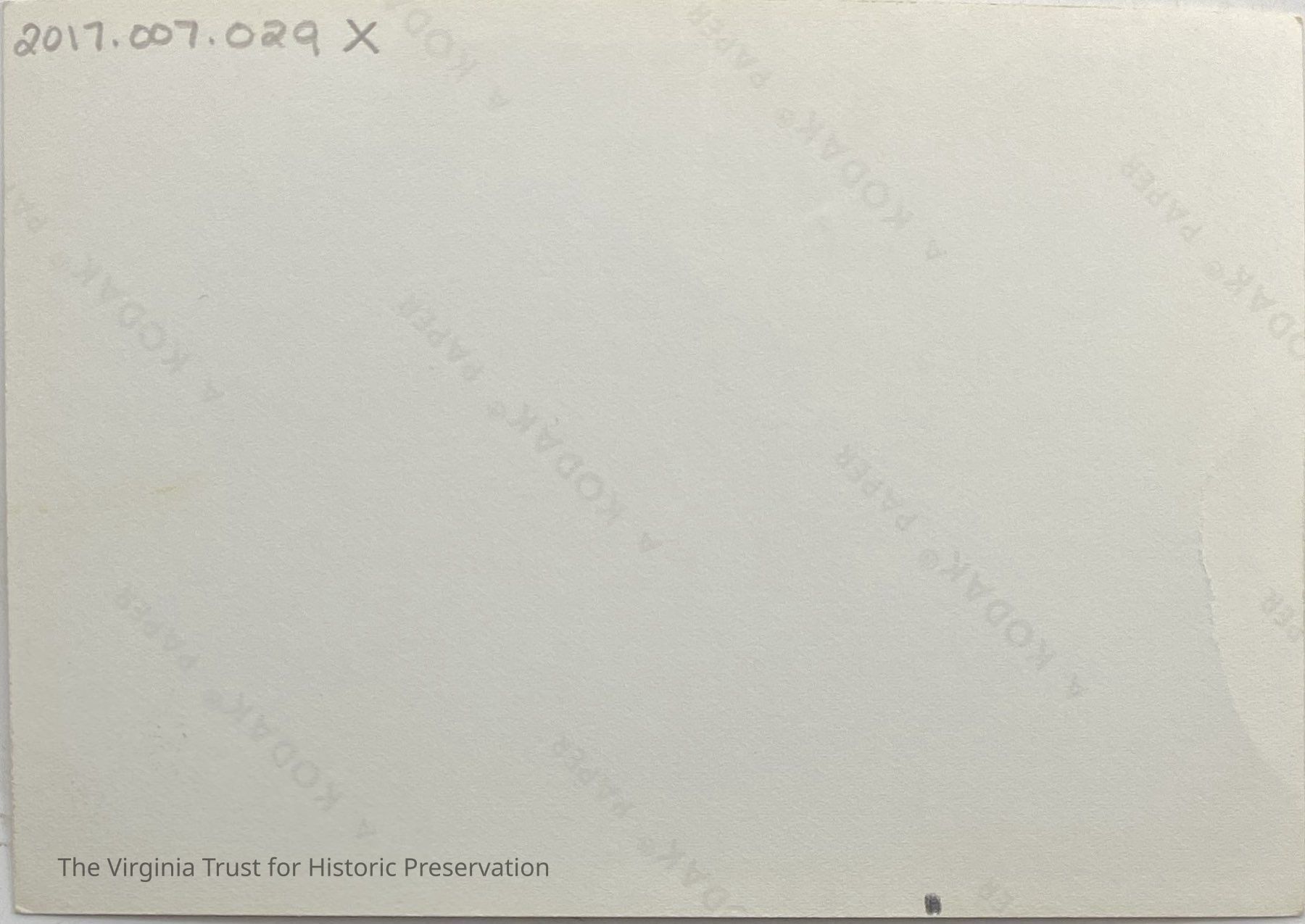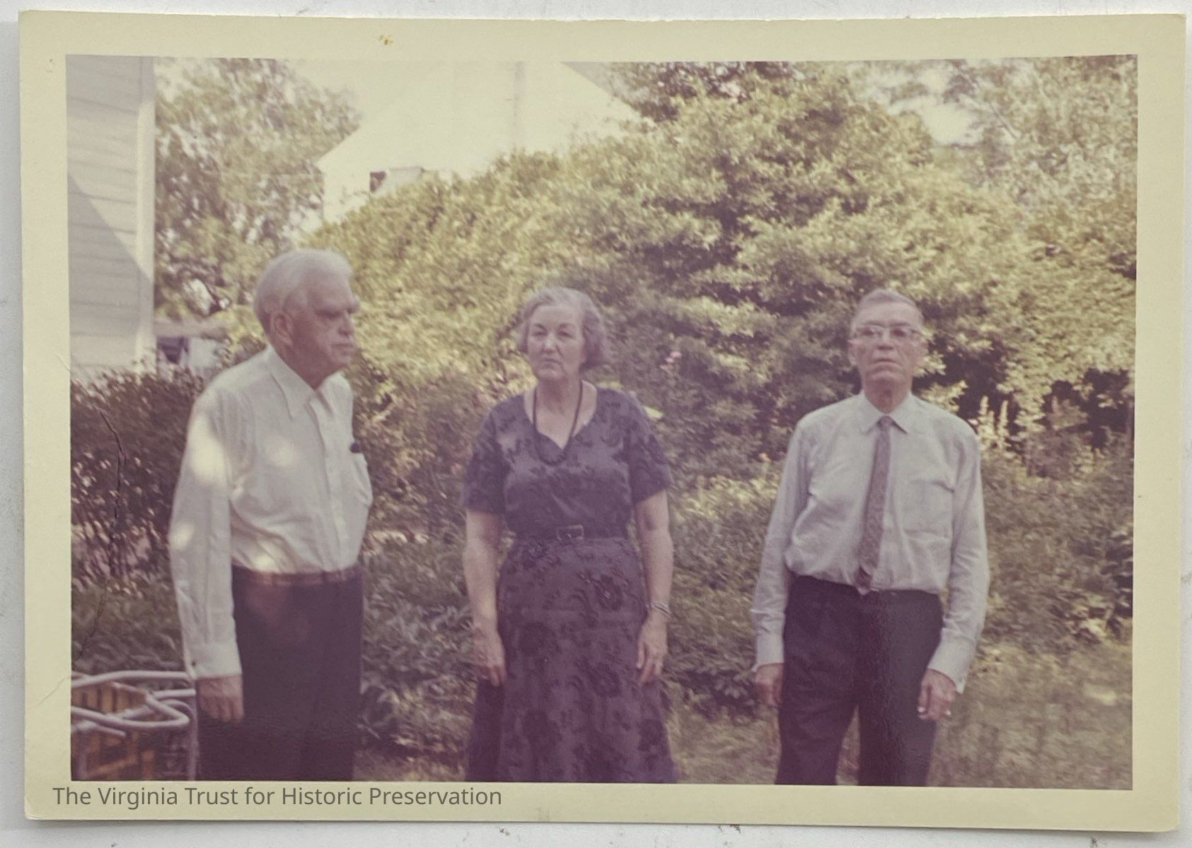 Color photograph of John L. Lewis standing with a woman (likely Ms Edith C) and another man. Lewis stands to the left and looks/turns away from camera while woman and other man look at camera. Most likely in the Lee-Fendall garden during Lewis residence. Trees, edge of the Lee-Fendall House, and adjacent house in background. White border with straight edges.