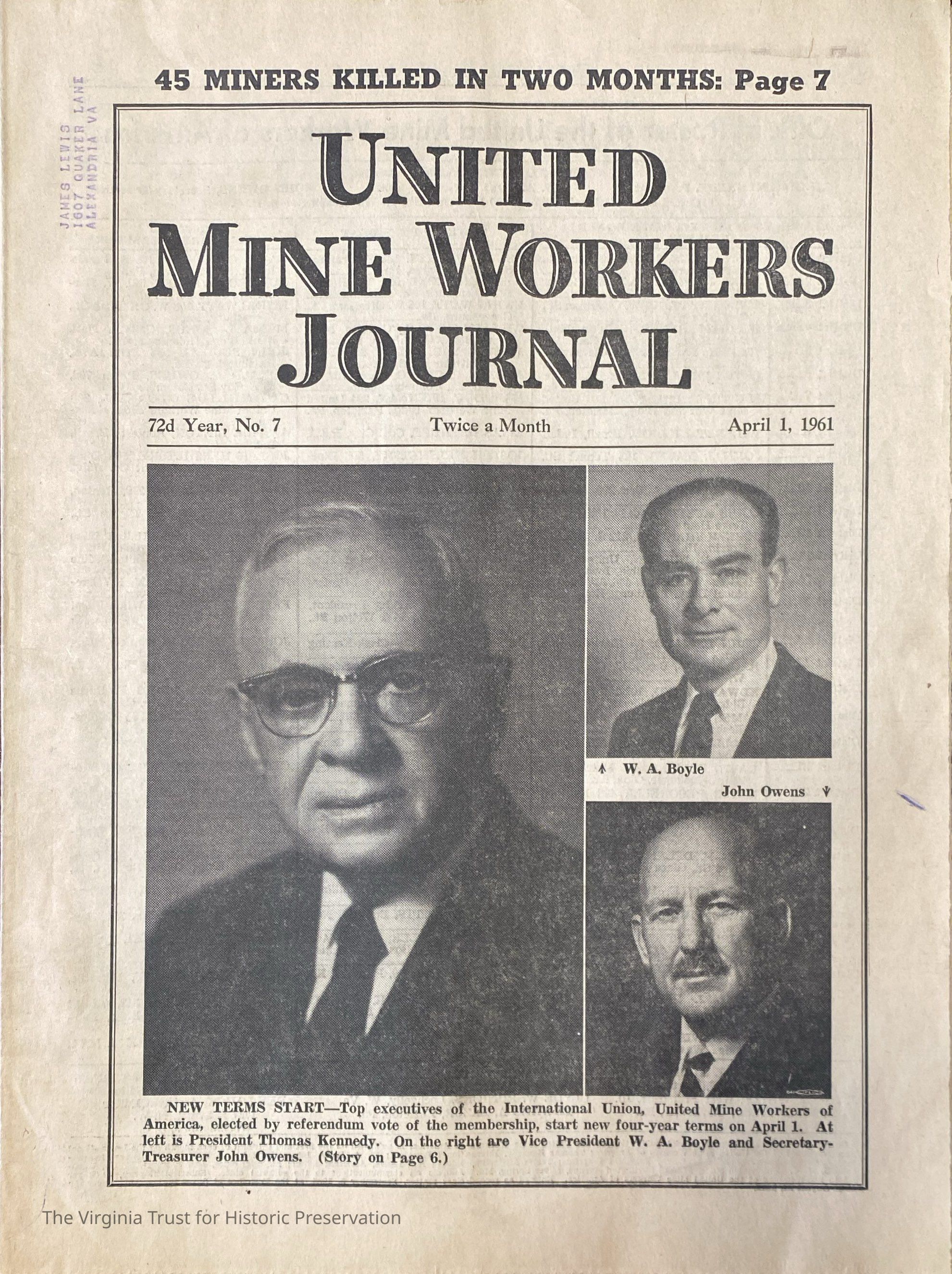 United Mine Workers of America Journal. Year 72, No. 7. April 1, 1961. Cover images are of newly elected UMWA International Union executives: President Thomas Kennedy, Vice President W.A. Boyle, Secretary-Treasurer John Owens. Stamp address to James Lewis at 1607 Quaker Lane, Alexandria, Virginia.Dimensions