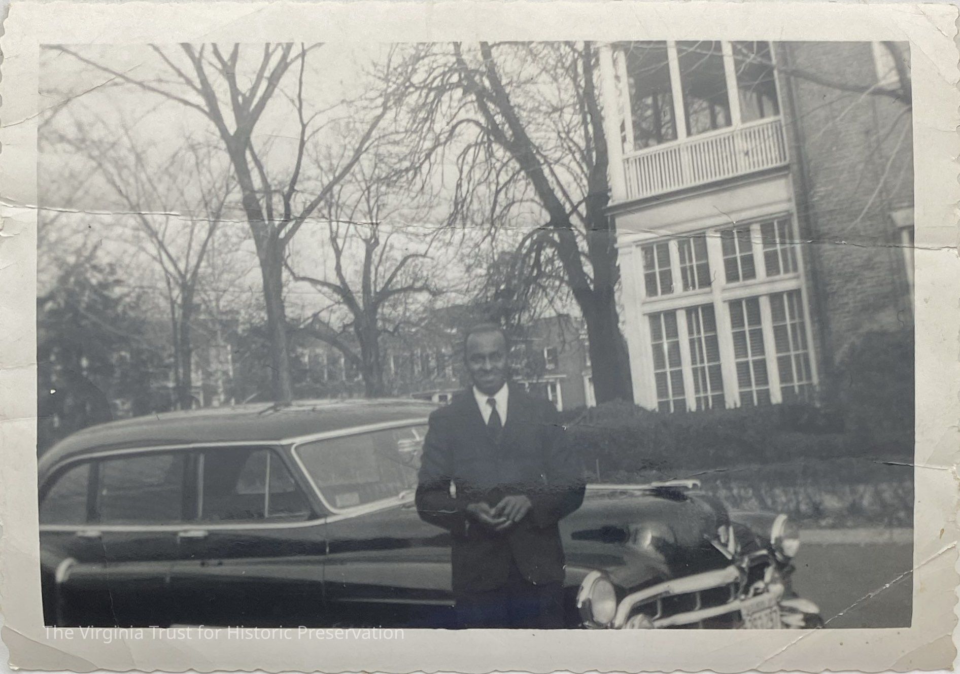 Black and white photograph of James Lewis Jr. standing in front of a Cadillac car. Most likely parked in front of the Lee-Fendall House along Oronoco Street. Background appears to be the house on opposite side of Oronoco.
