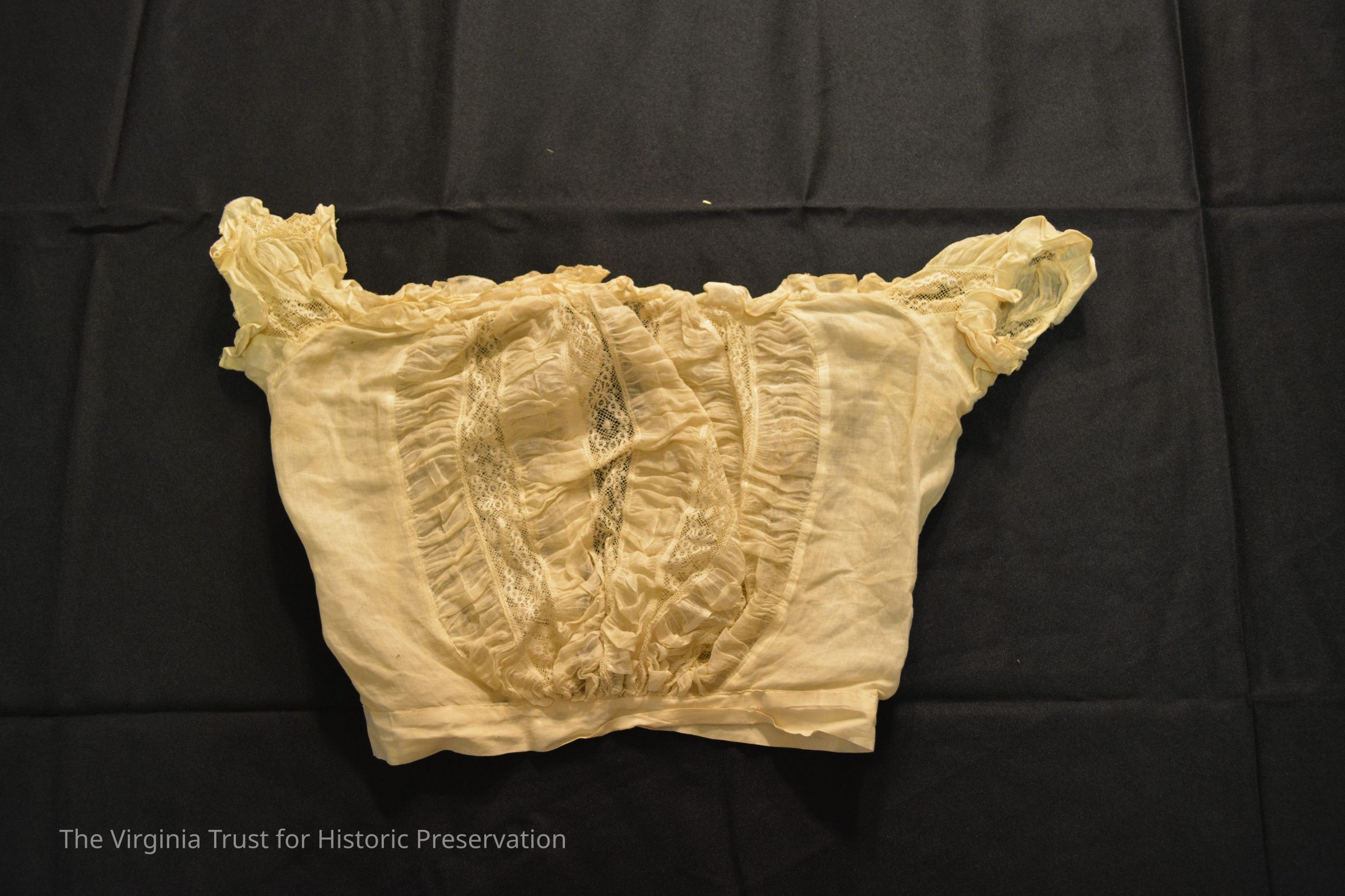 Off-white linen bodice with lace and ruffle trim detail. Short sleeve, low neckline.