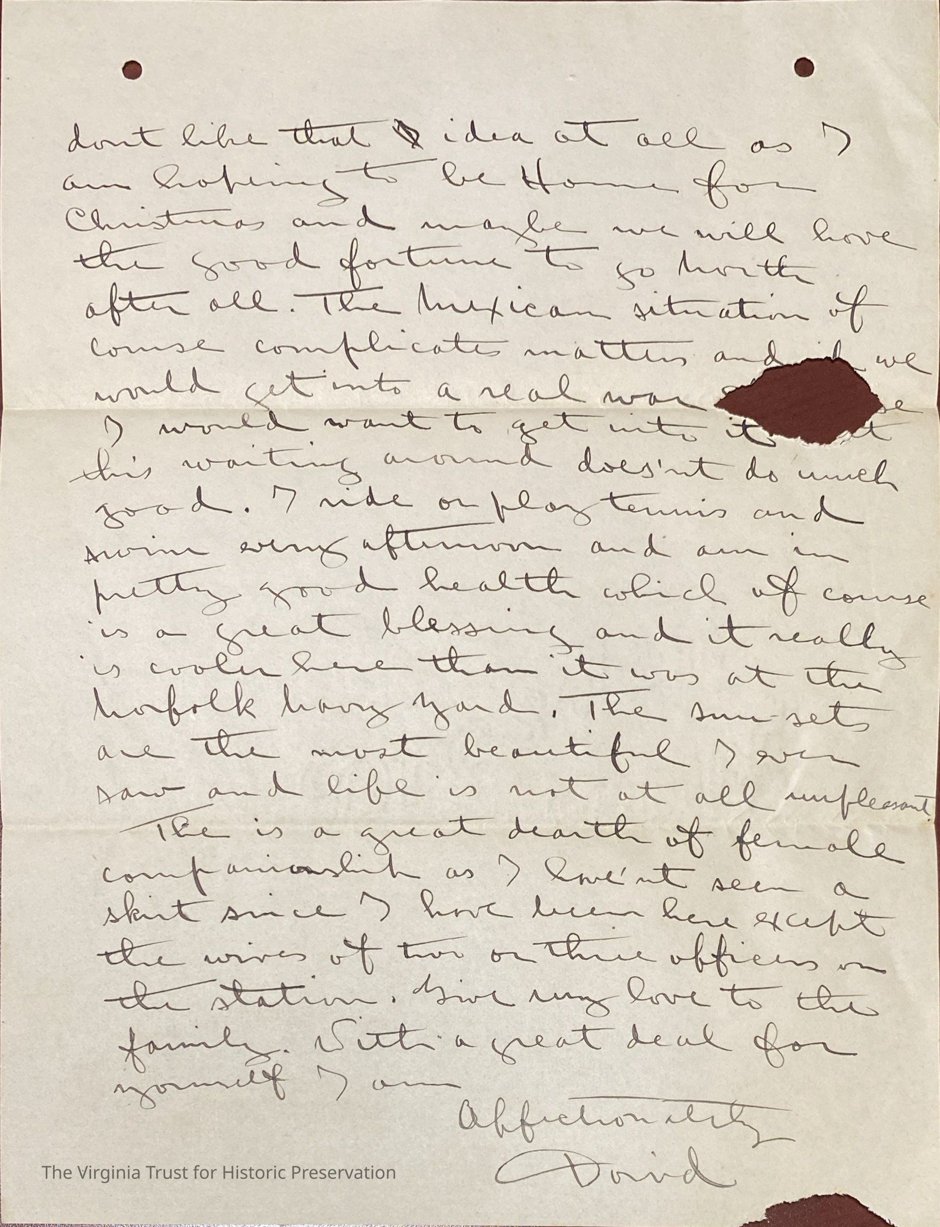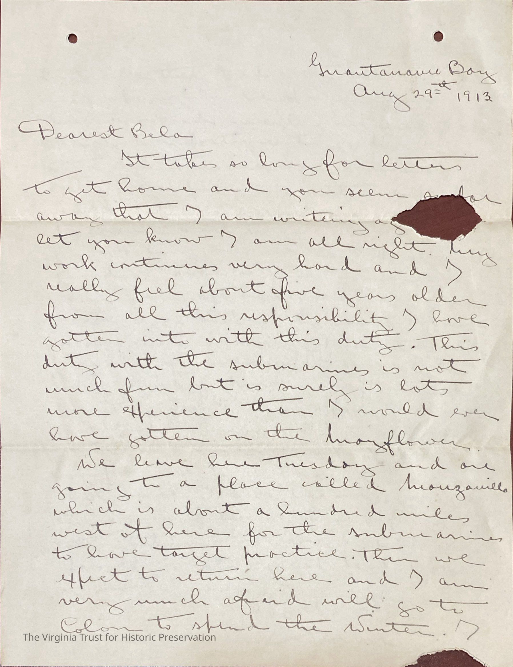 Two page letter from David Twigg Chalmers addressed "Dearest Bela" dated Aug. 29th 1913 from Guantanamo Bay