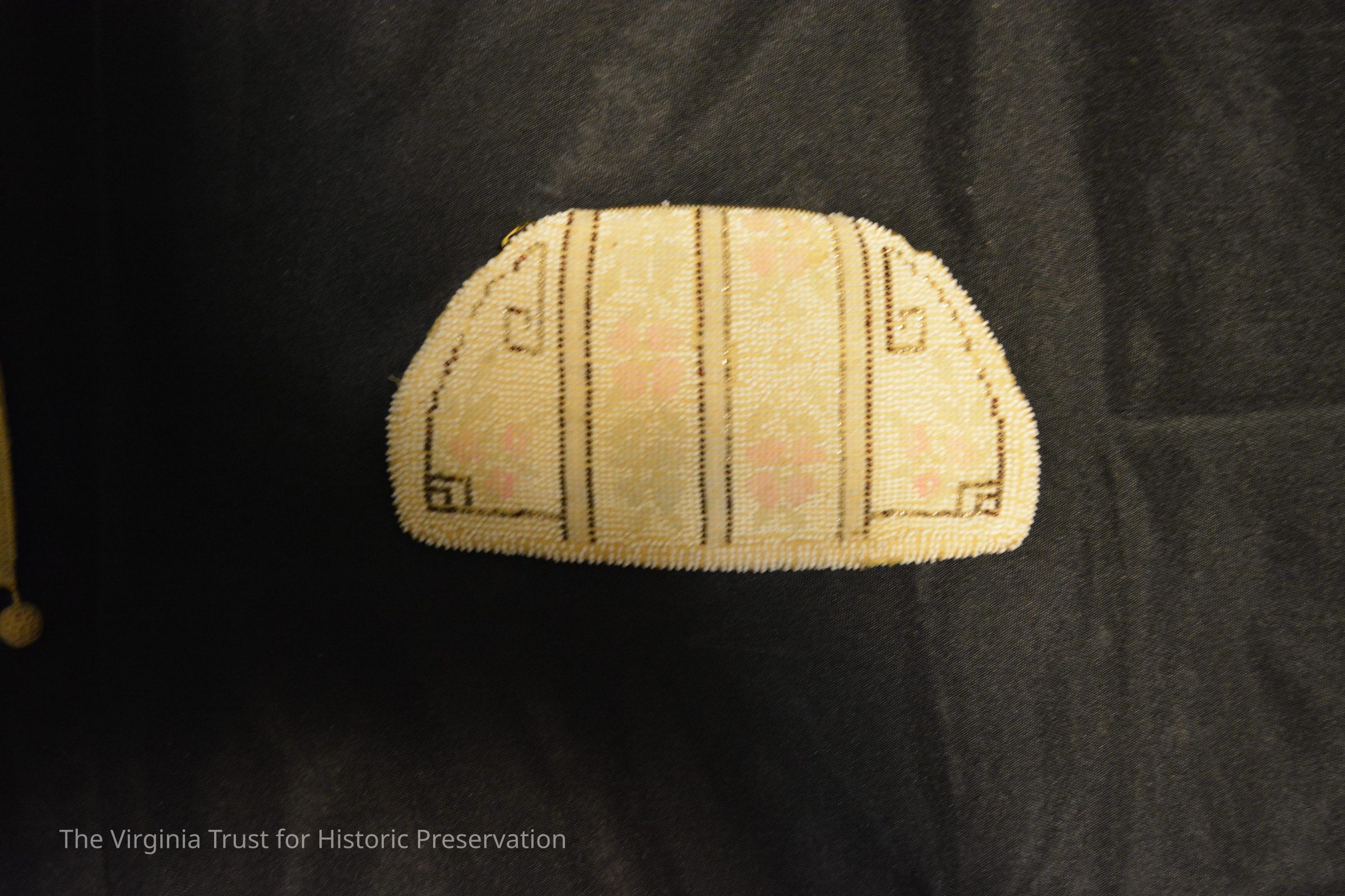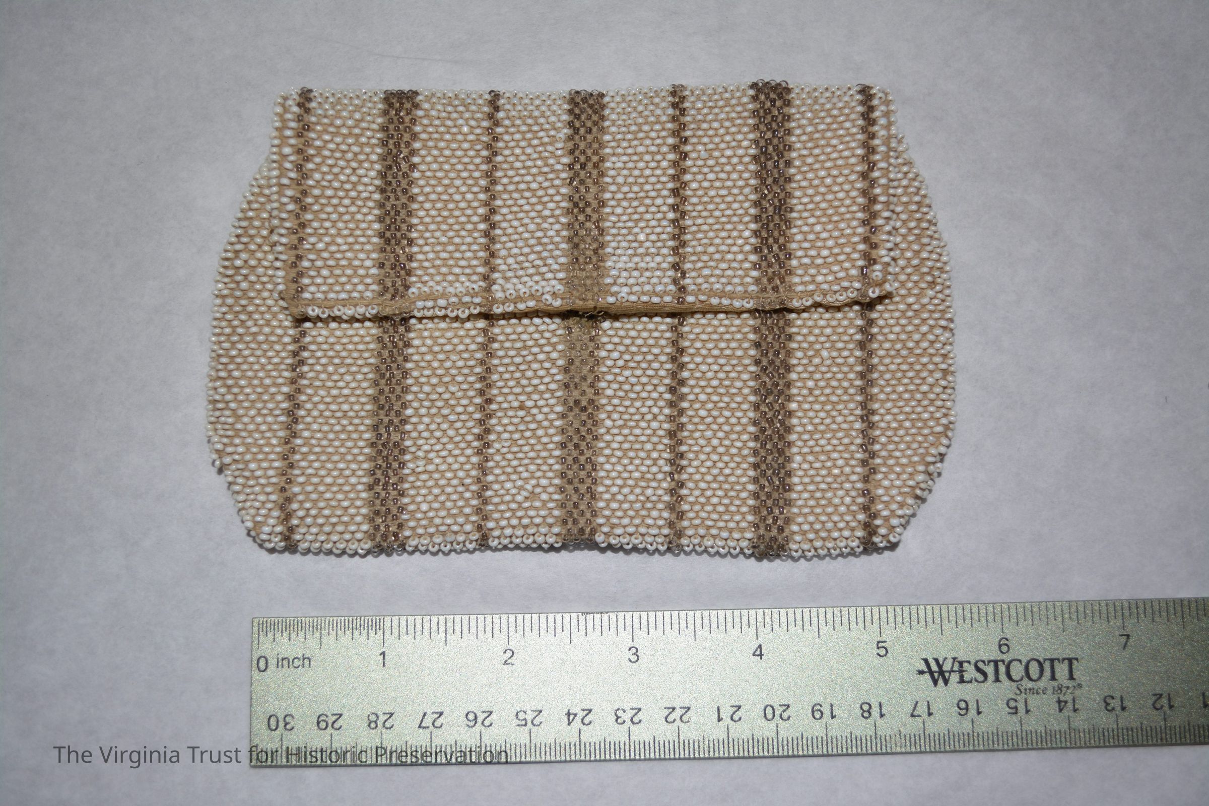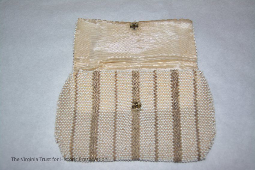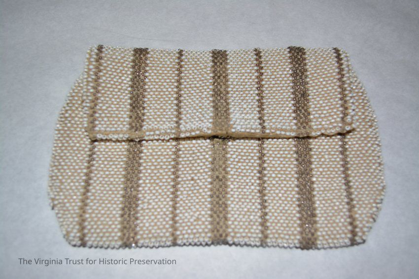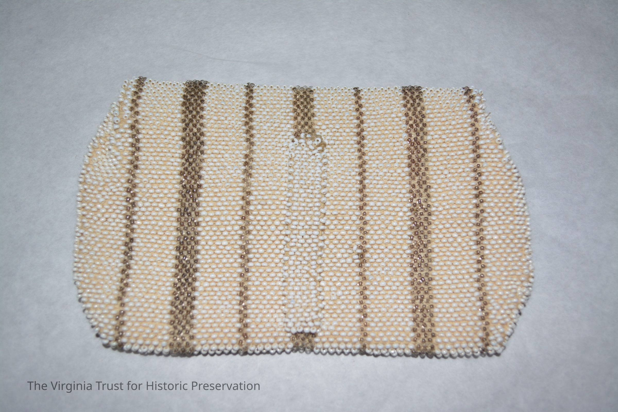 White and gold beaded accented by pink and black; handle strap on back; zipper closure.