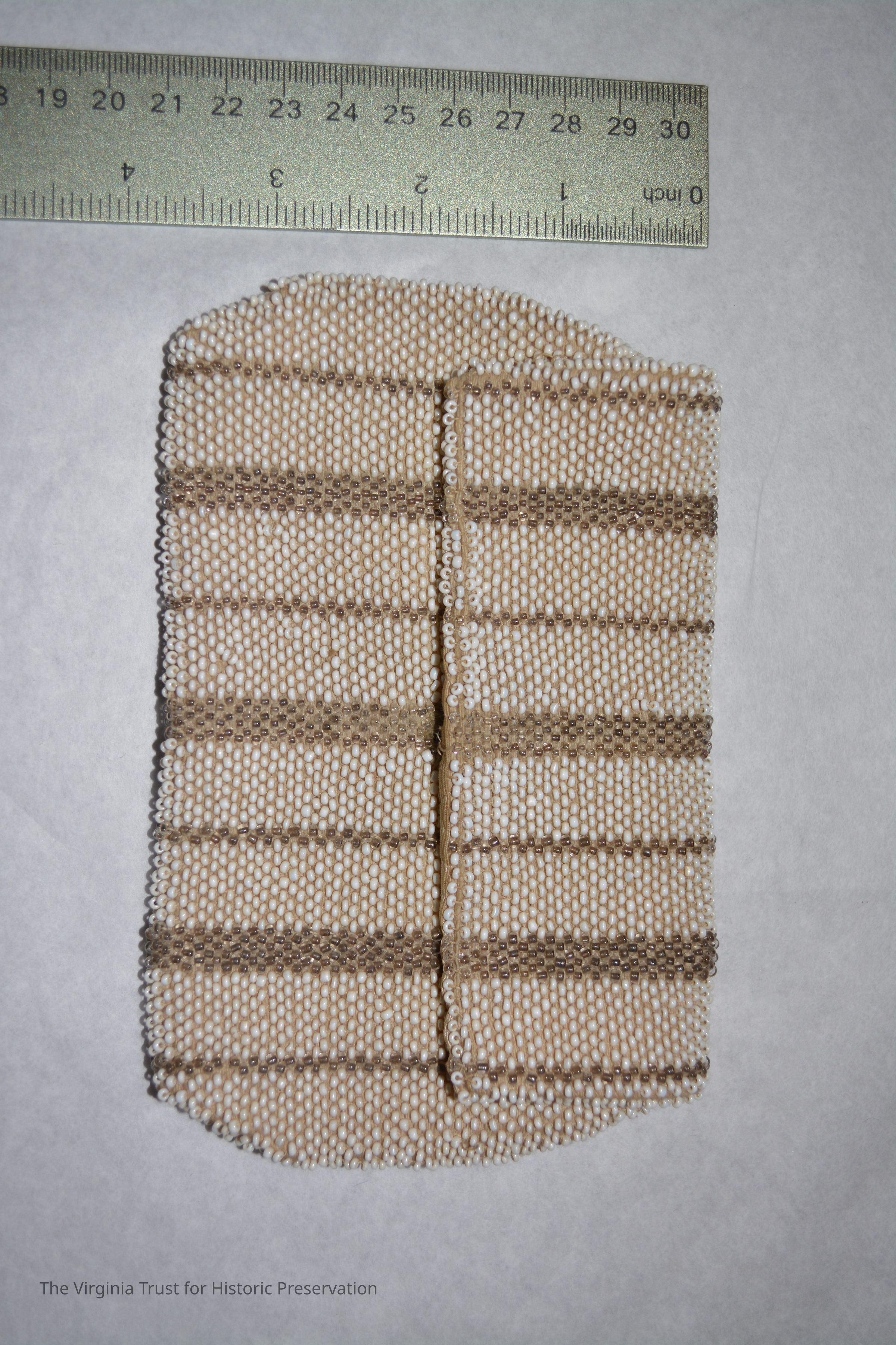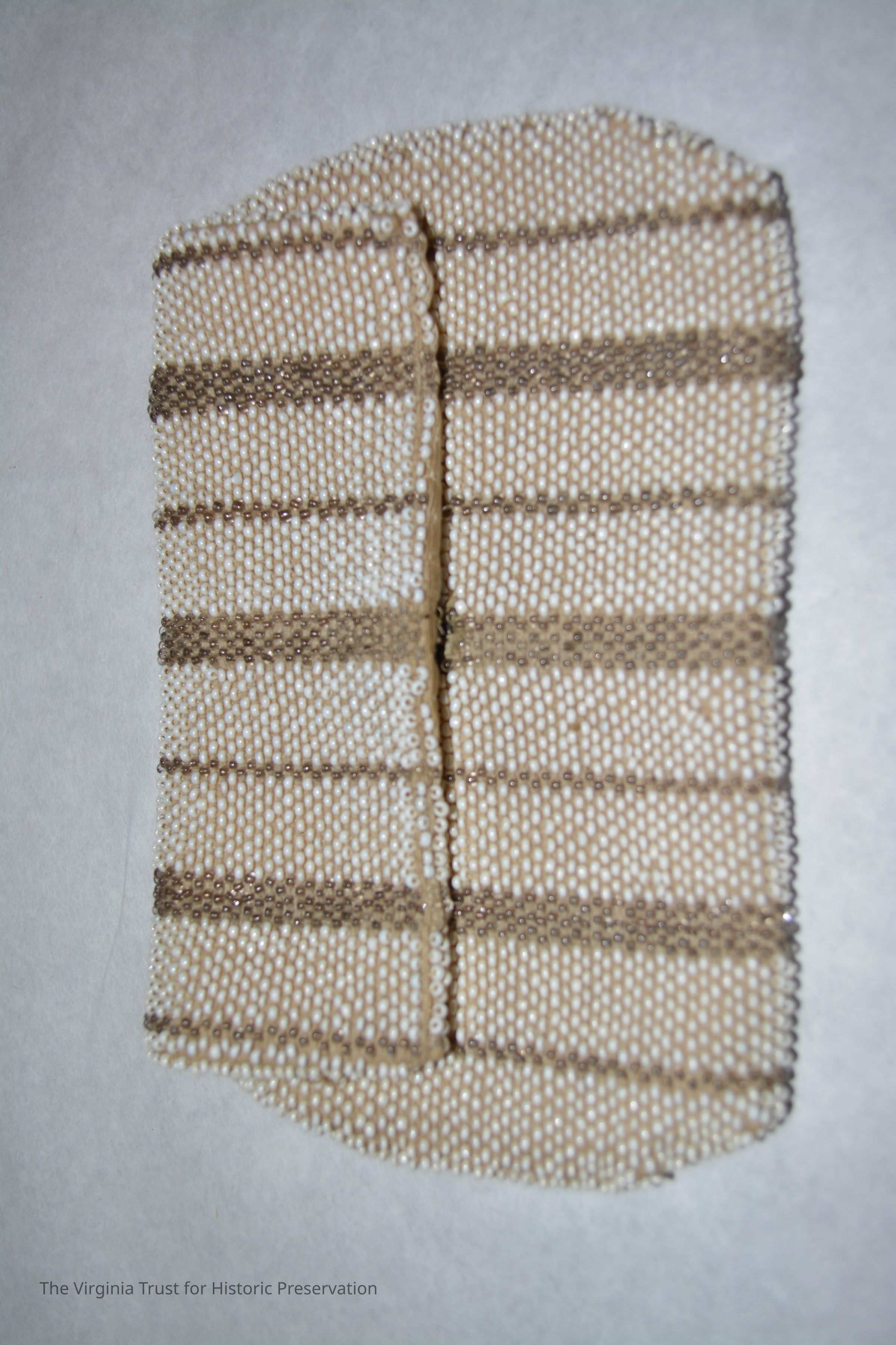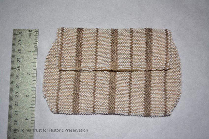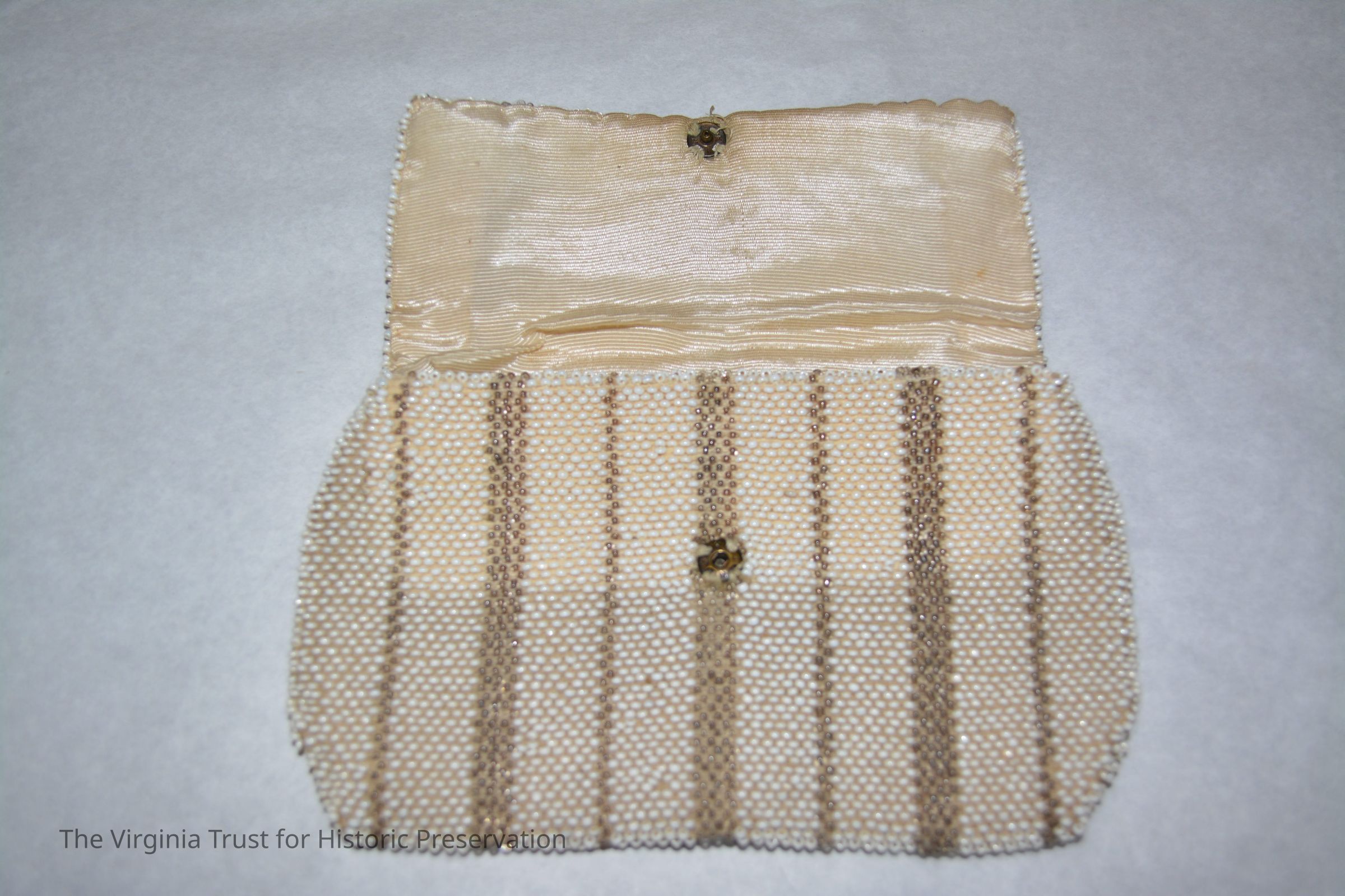 White and gold beaded accented by pink and black; handle strap on back; zipper closure.