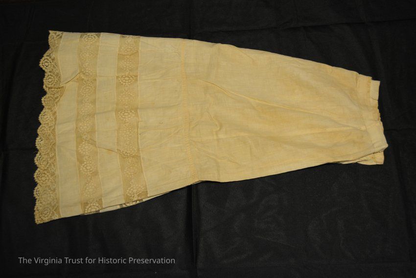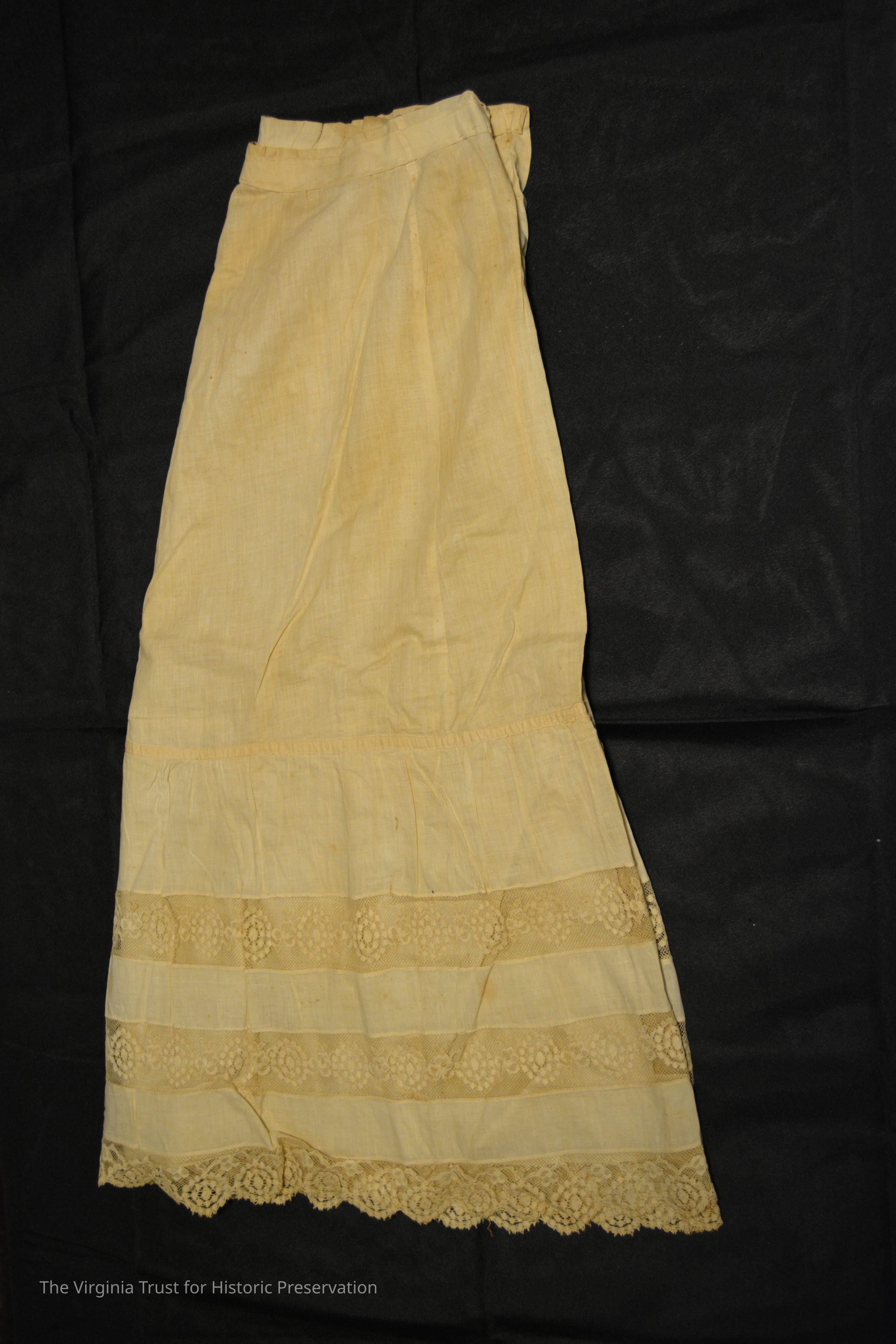 Linen skirt with lace detail and eyelet/embroidered scalloped trim at skirt hem edge.