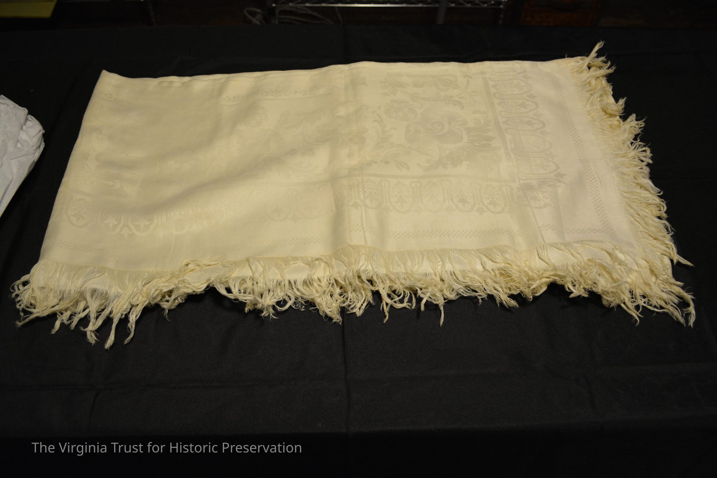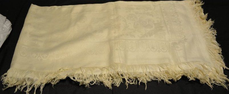 White linen tablecloth with fringed. Marked "EED" in ink at one corner.
