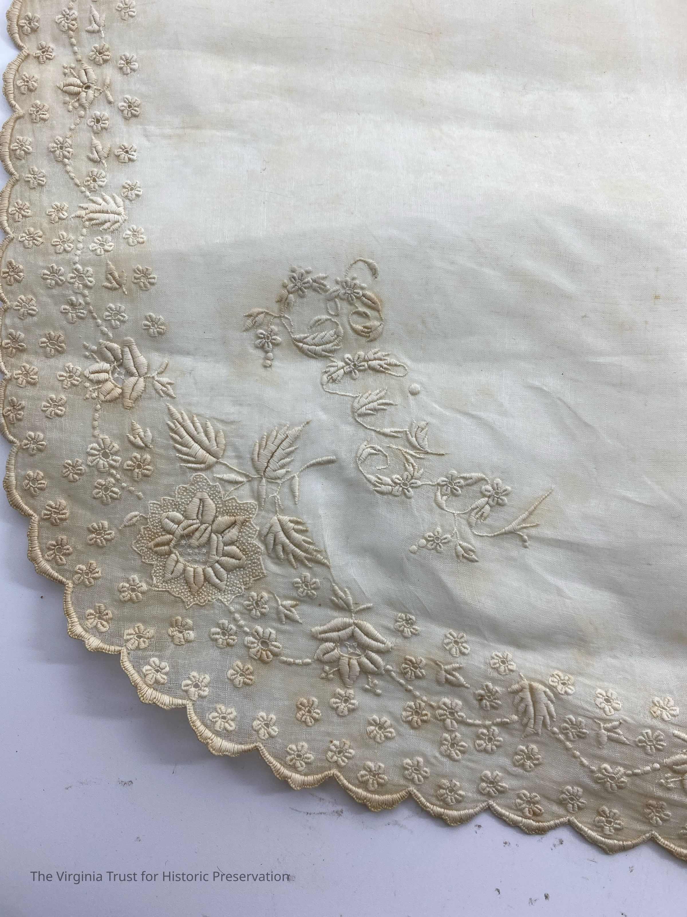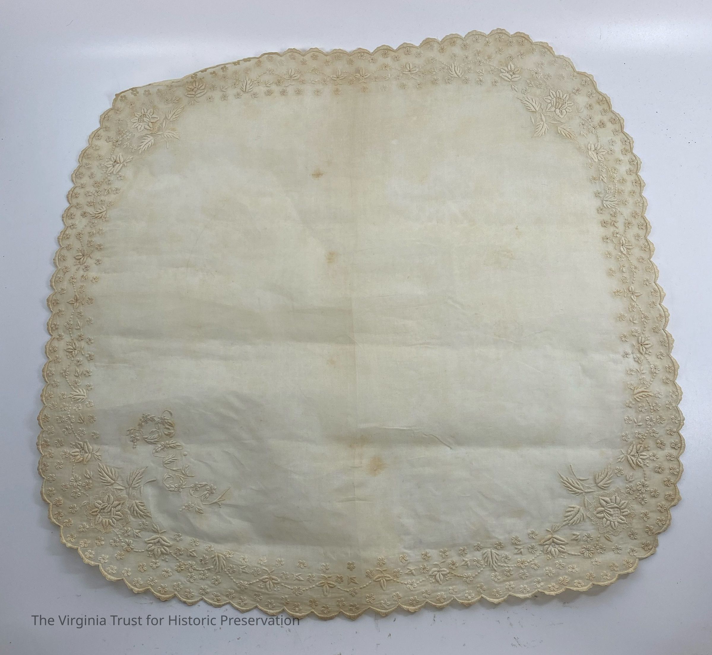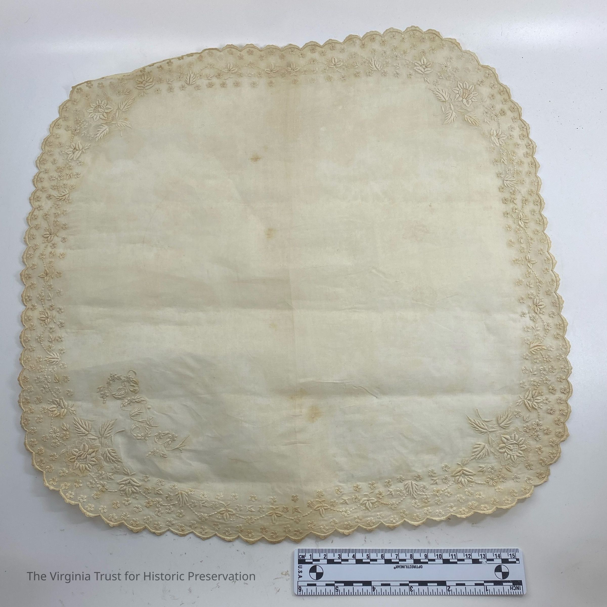 Handkerchief embroidered with the name "Eliza". Floral design along the edges. Object came with box.