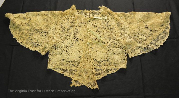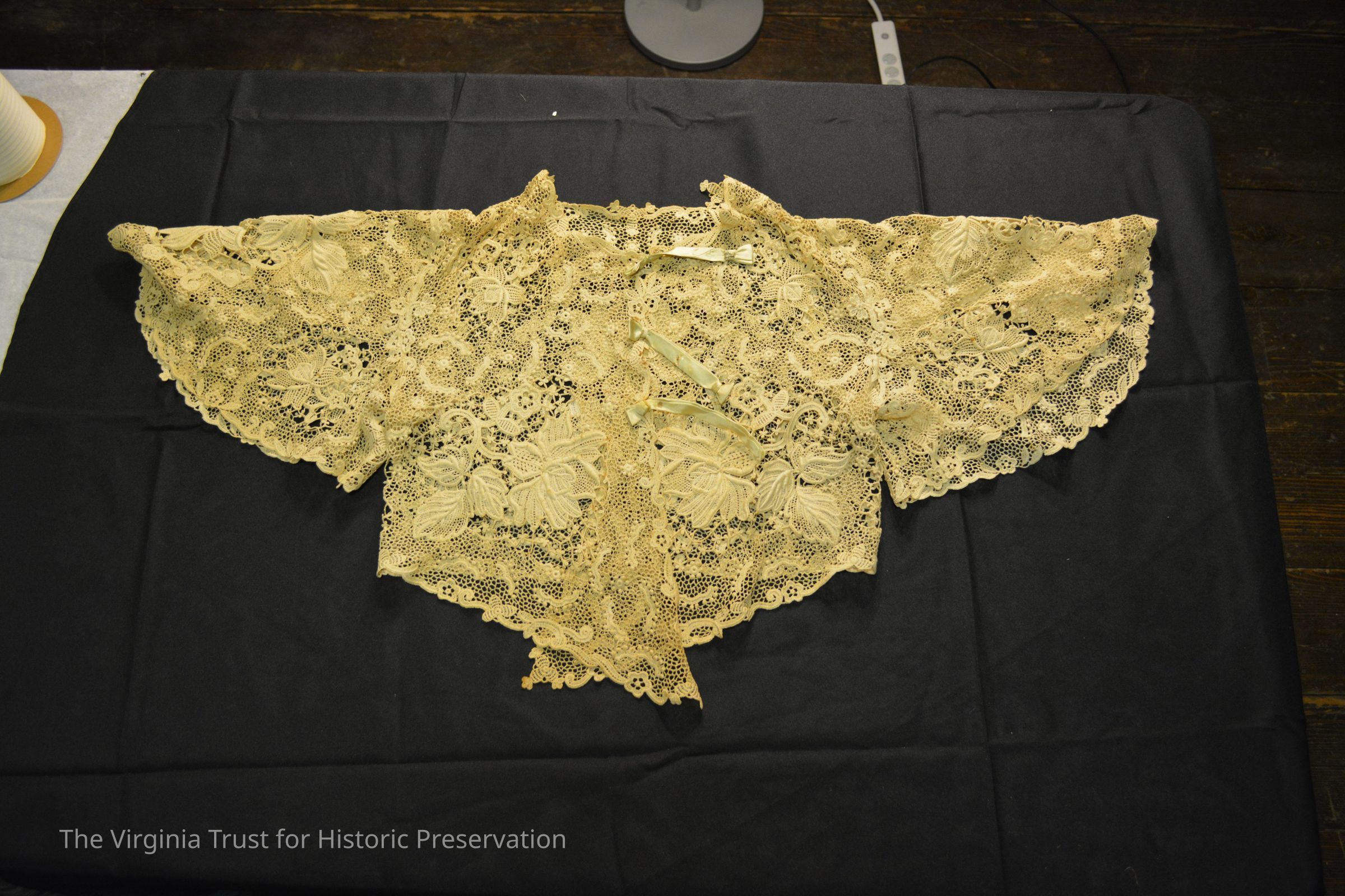 Off-white lace bolero jacket with light green ribbon ties.