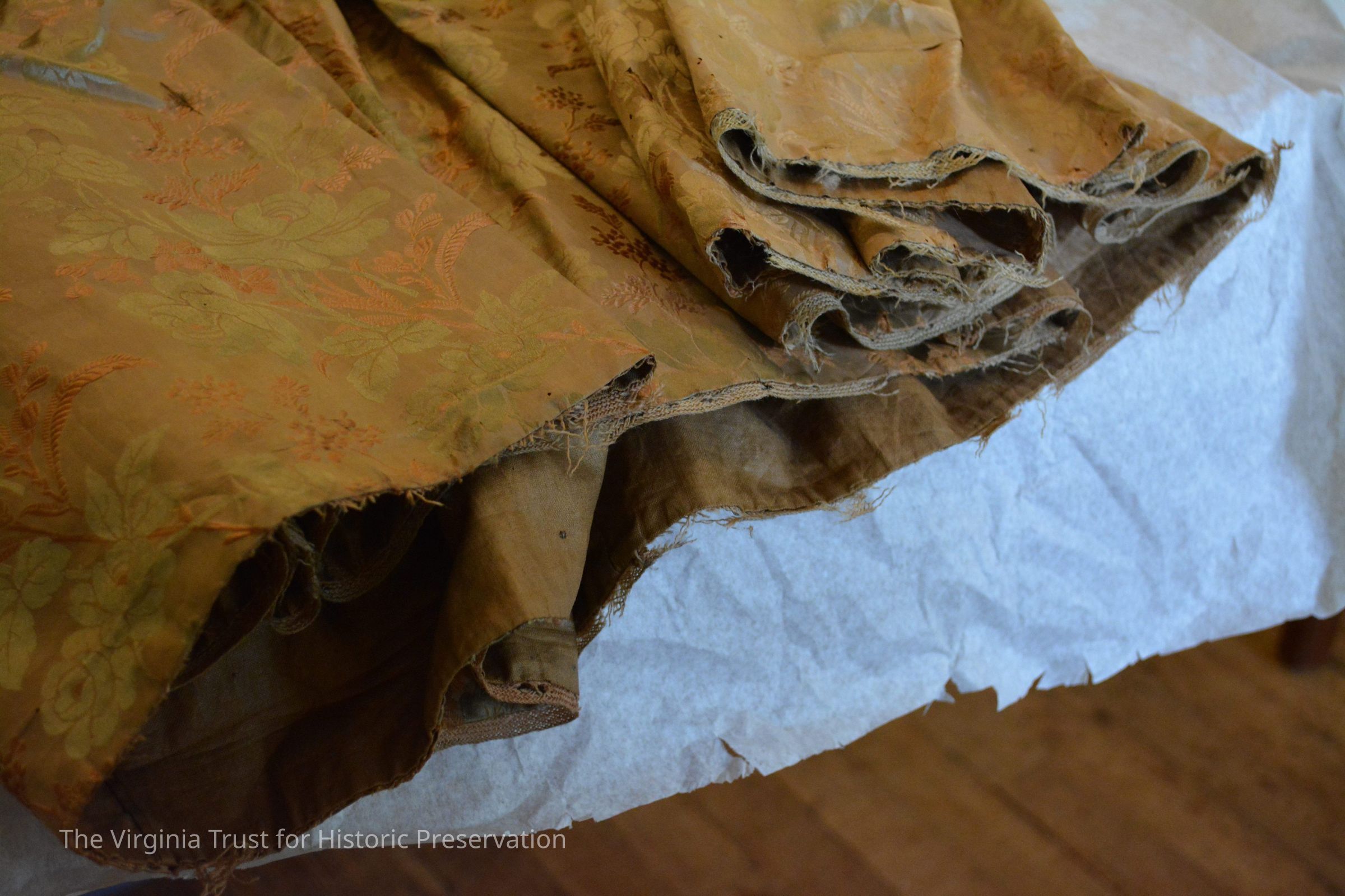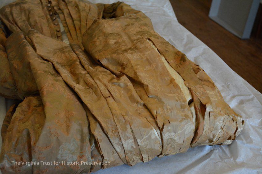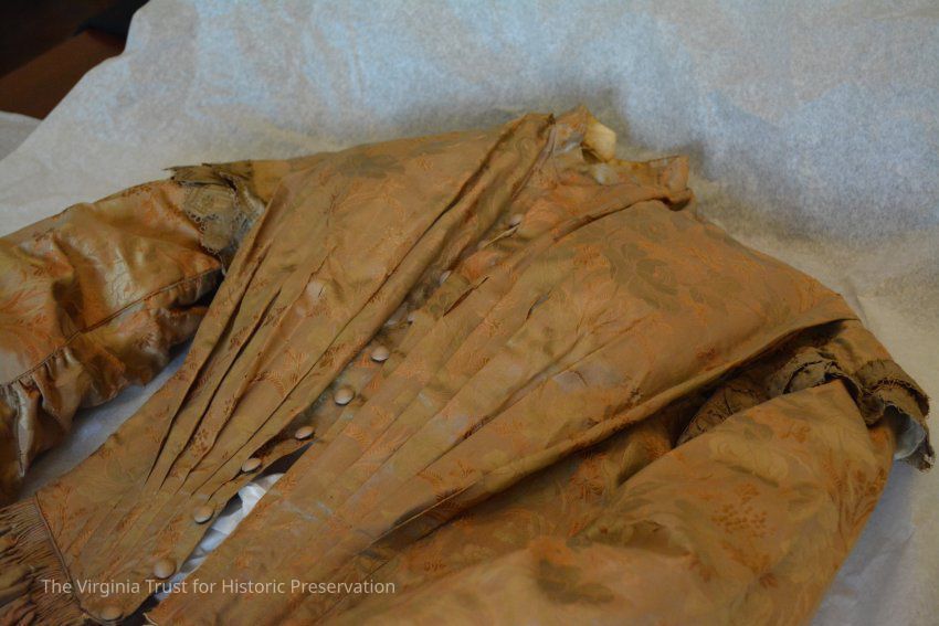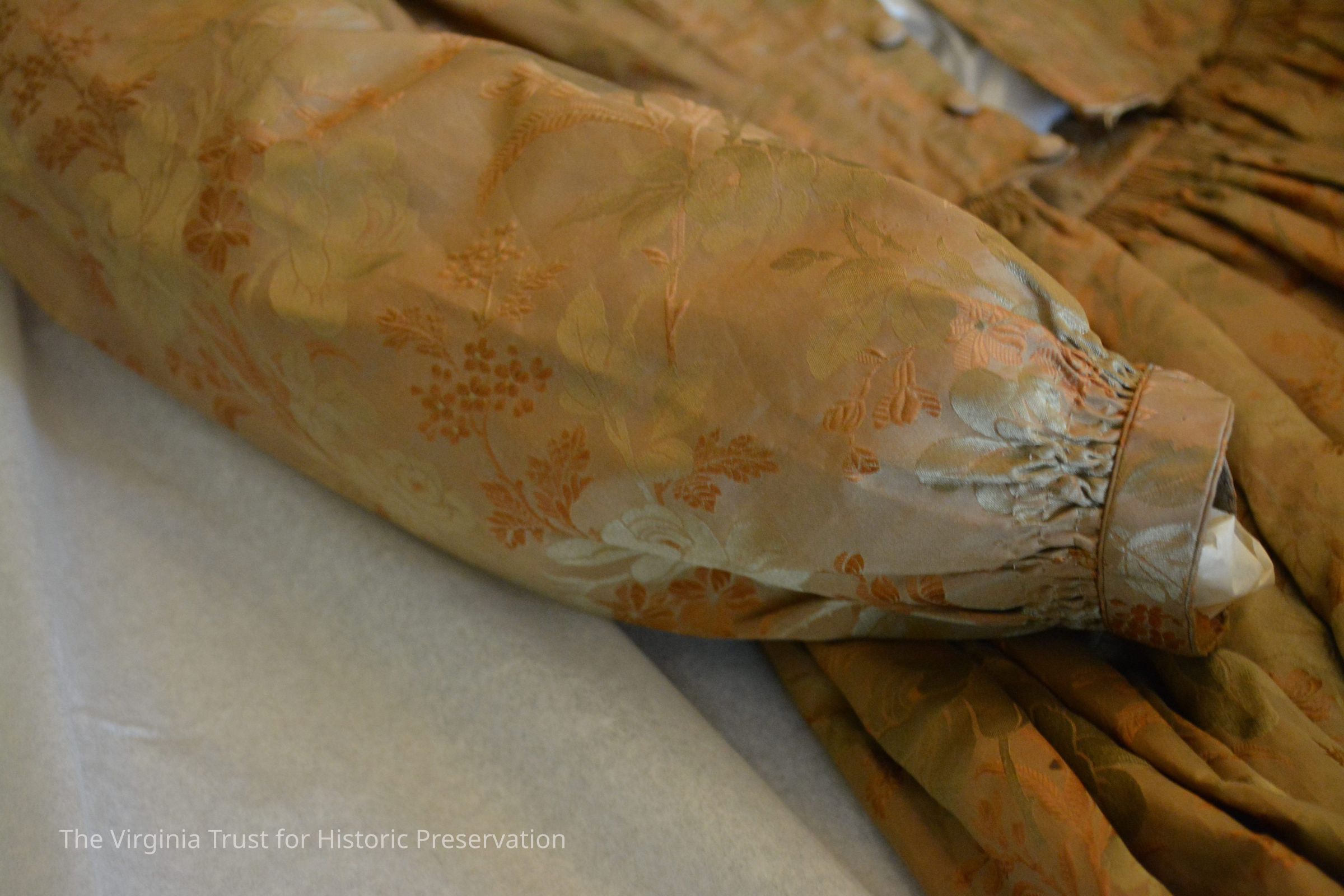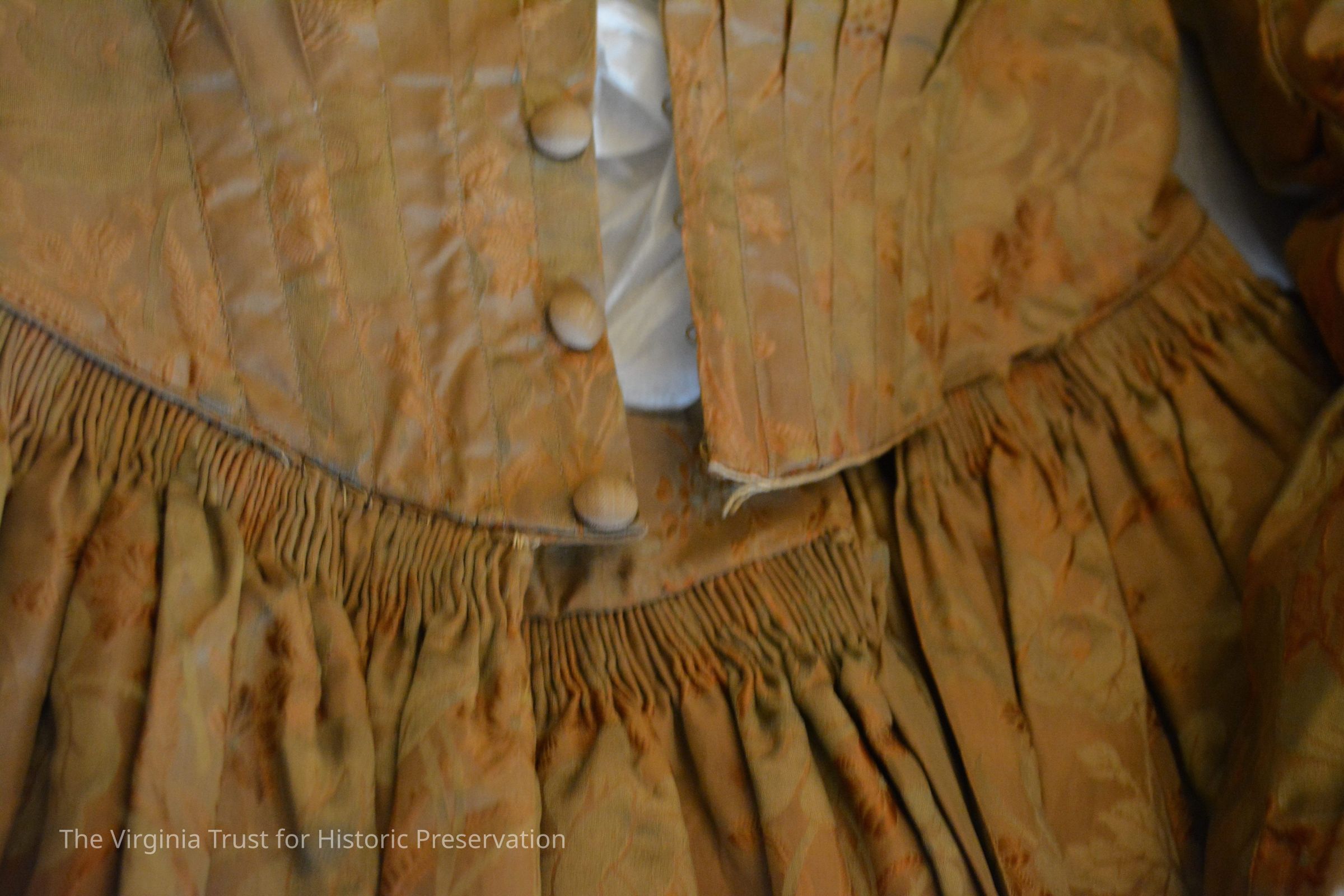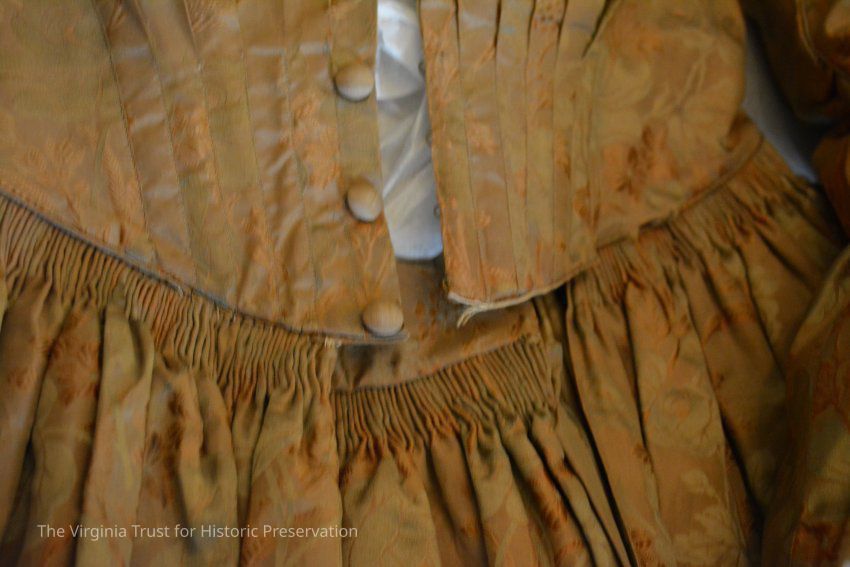 Silk taffeta dress with long sleeves. The fabric background is gold with embroidered flowers and leaves in same color. Dress belonged to Mary Muir Shinn (10/22/1806 - 8/5/1881) - wife of Stephen Shinn. She was the daughter of John and Mary Lang Muir. John came to Alexandria in 1795. In 1927 the dress was given to Pauline Shinn Calbert, who is the great-granddaughter of Mary and Stephen Shinn. Donated by Mrs. Calbert.