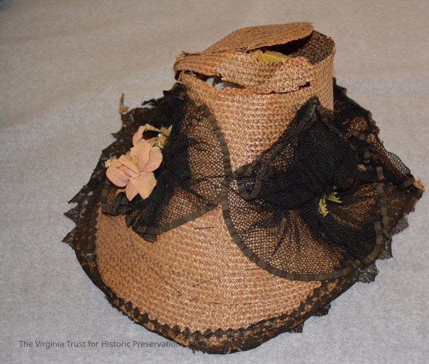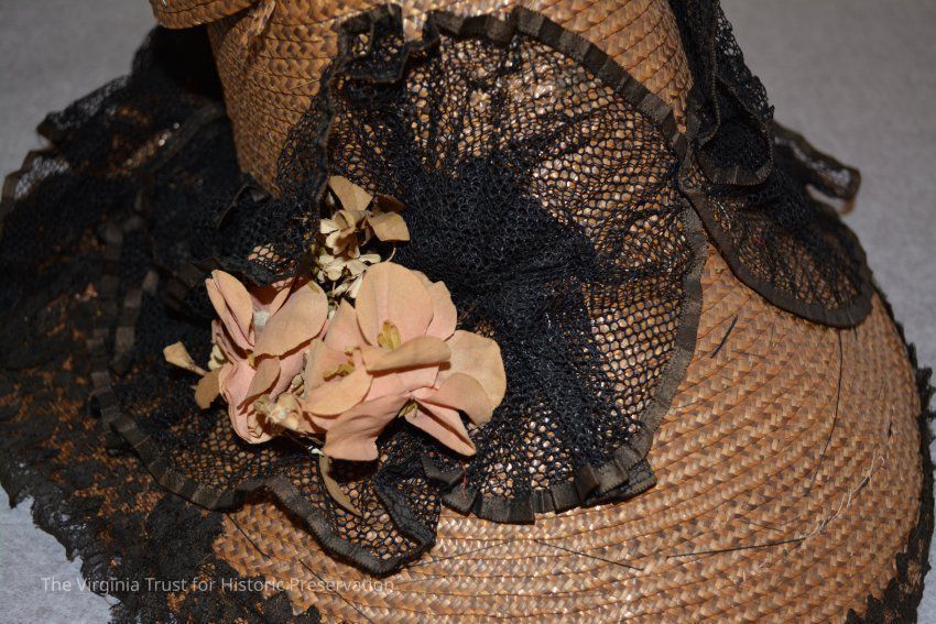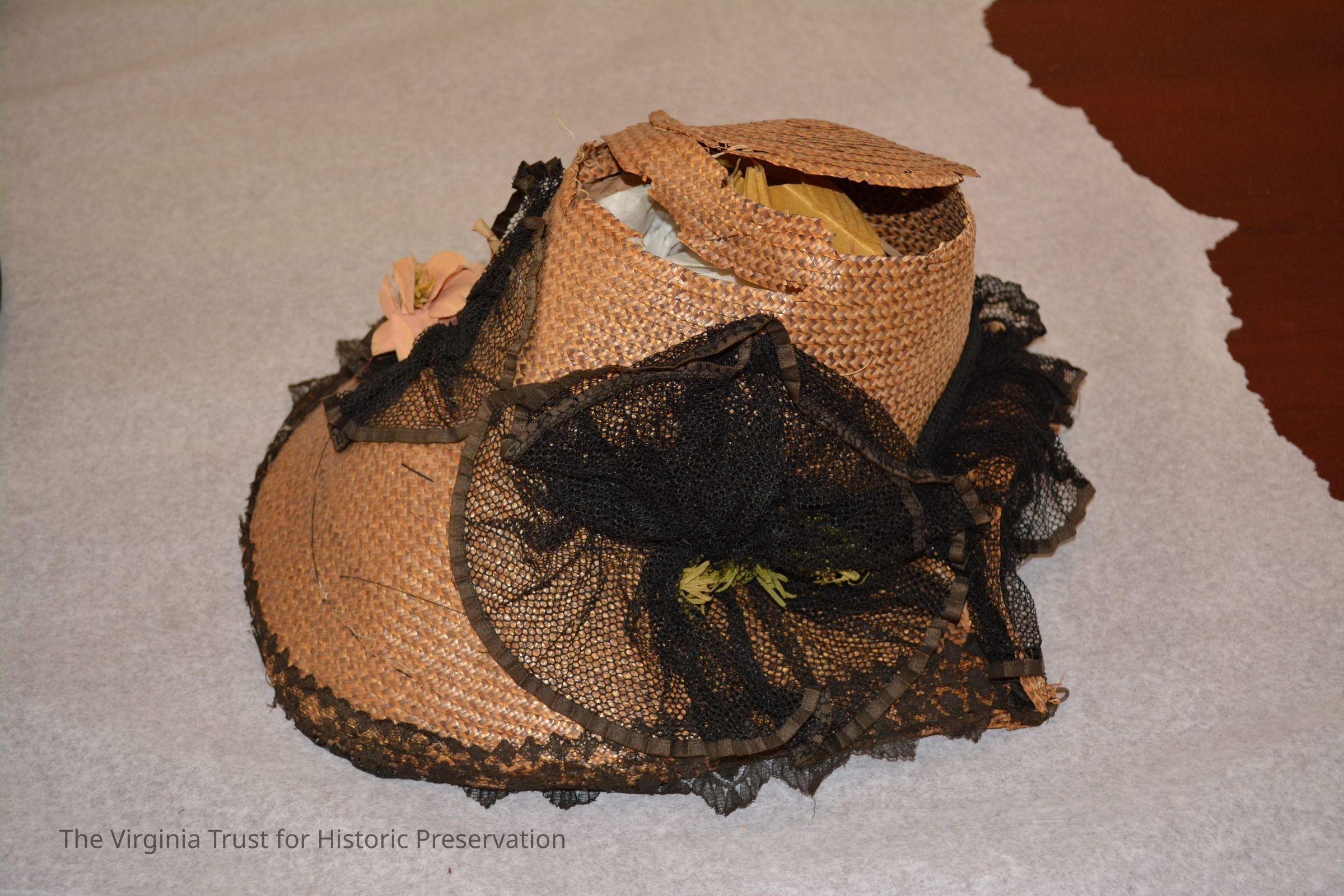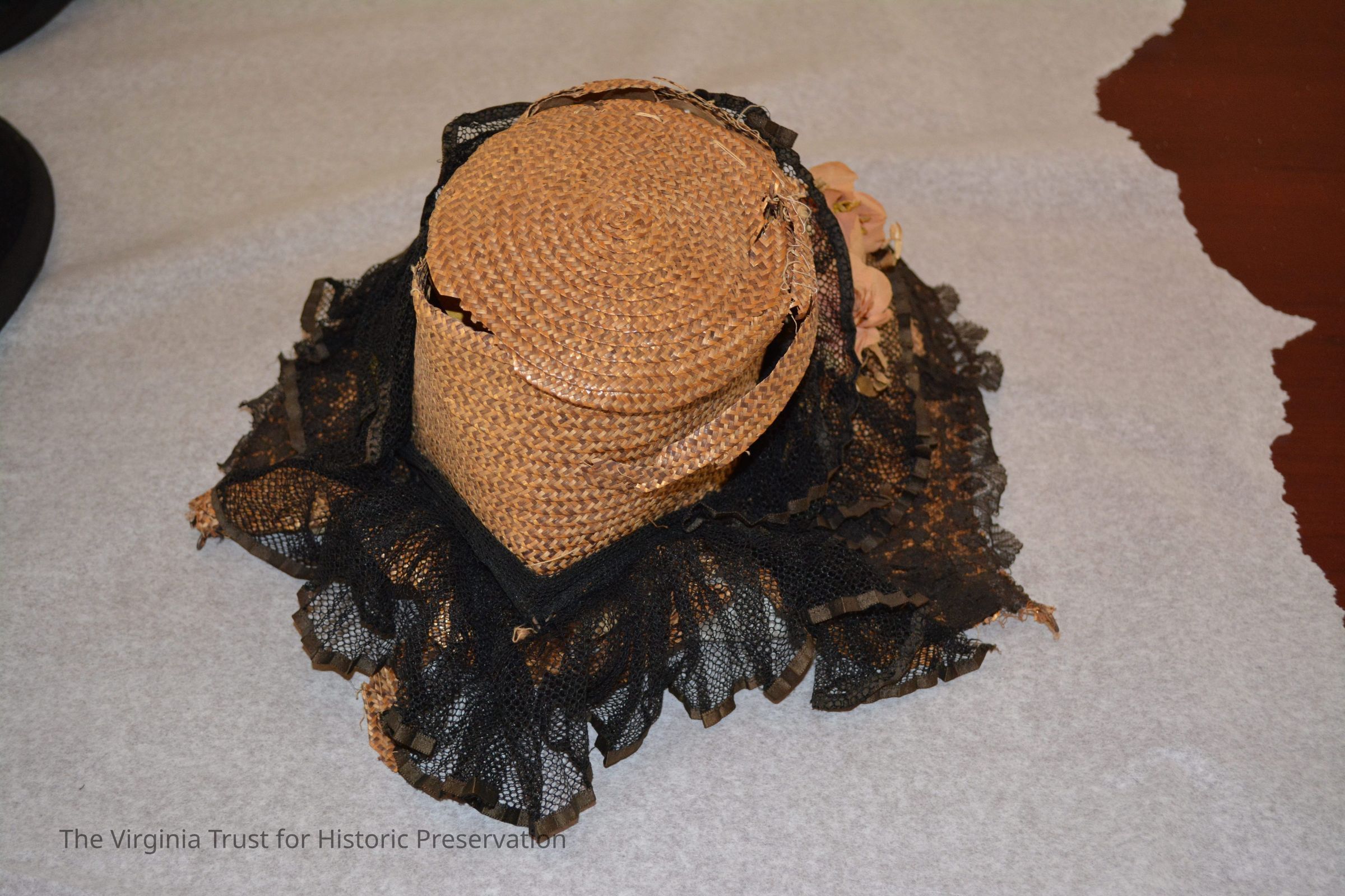 Straw bonnet, most likely hand made. Has black lace and black netting that is edged with black silk attached as decoration. Also has fake crepe flowers as decoration.