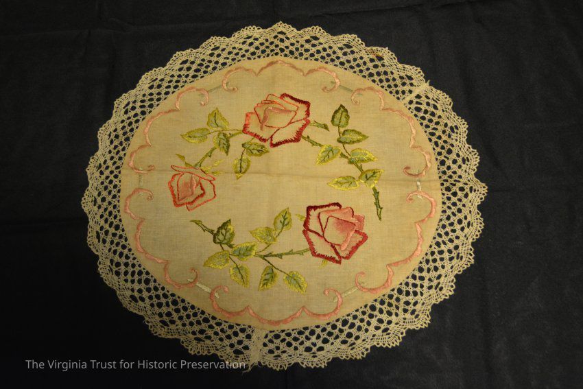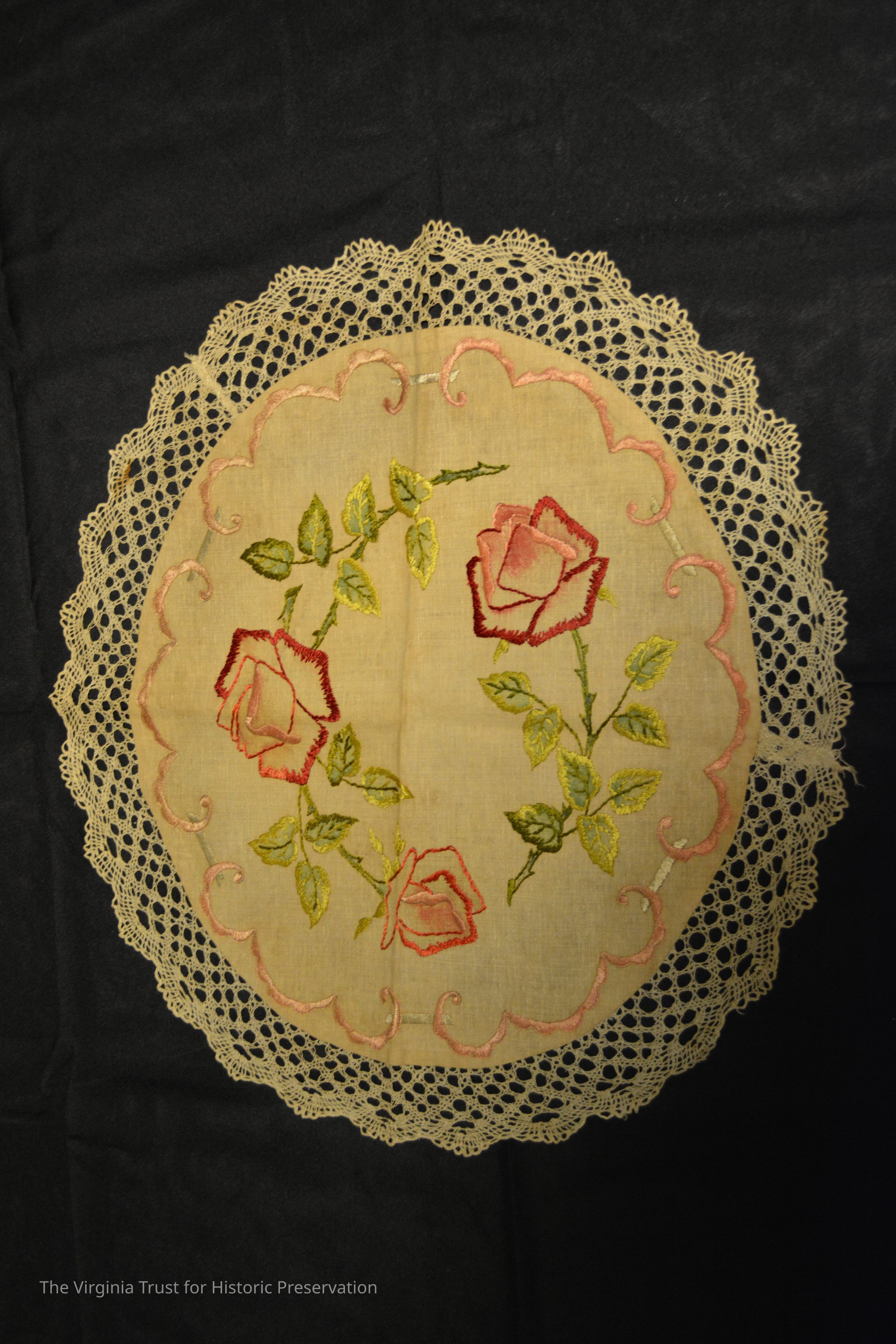 Beige linen table doily with lace trim and red/pink/green floral embroidery.