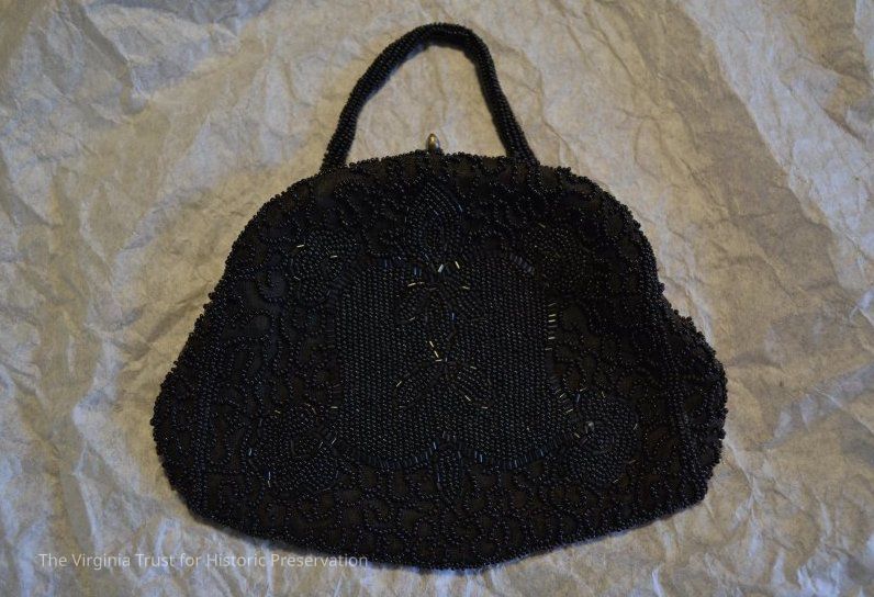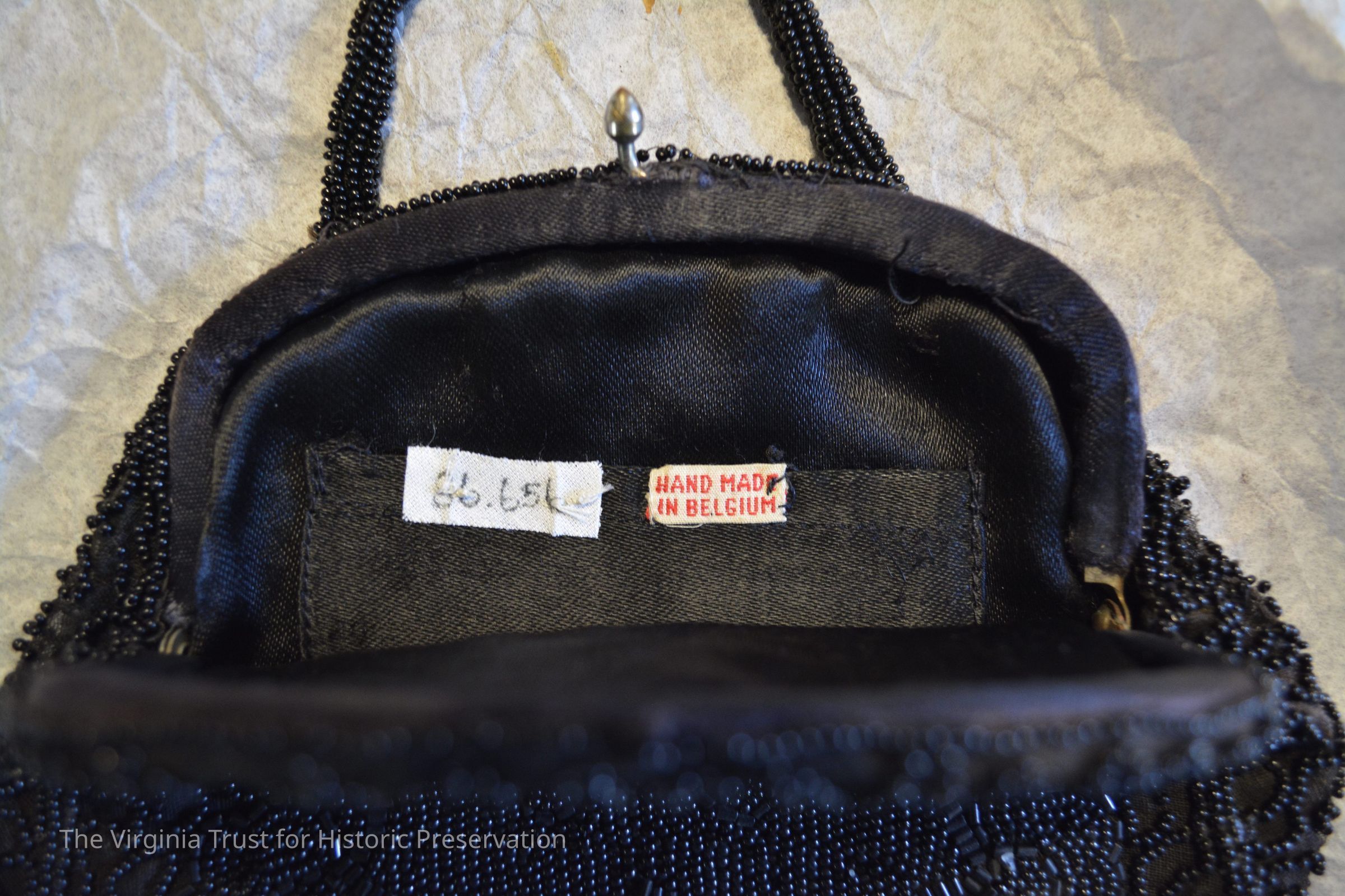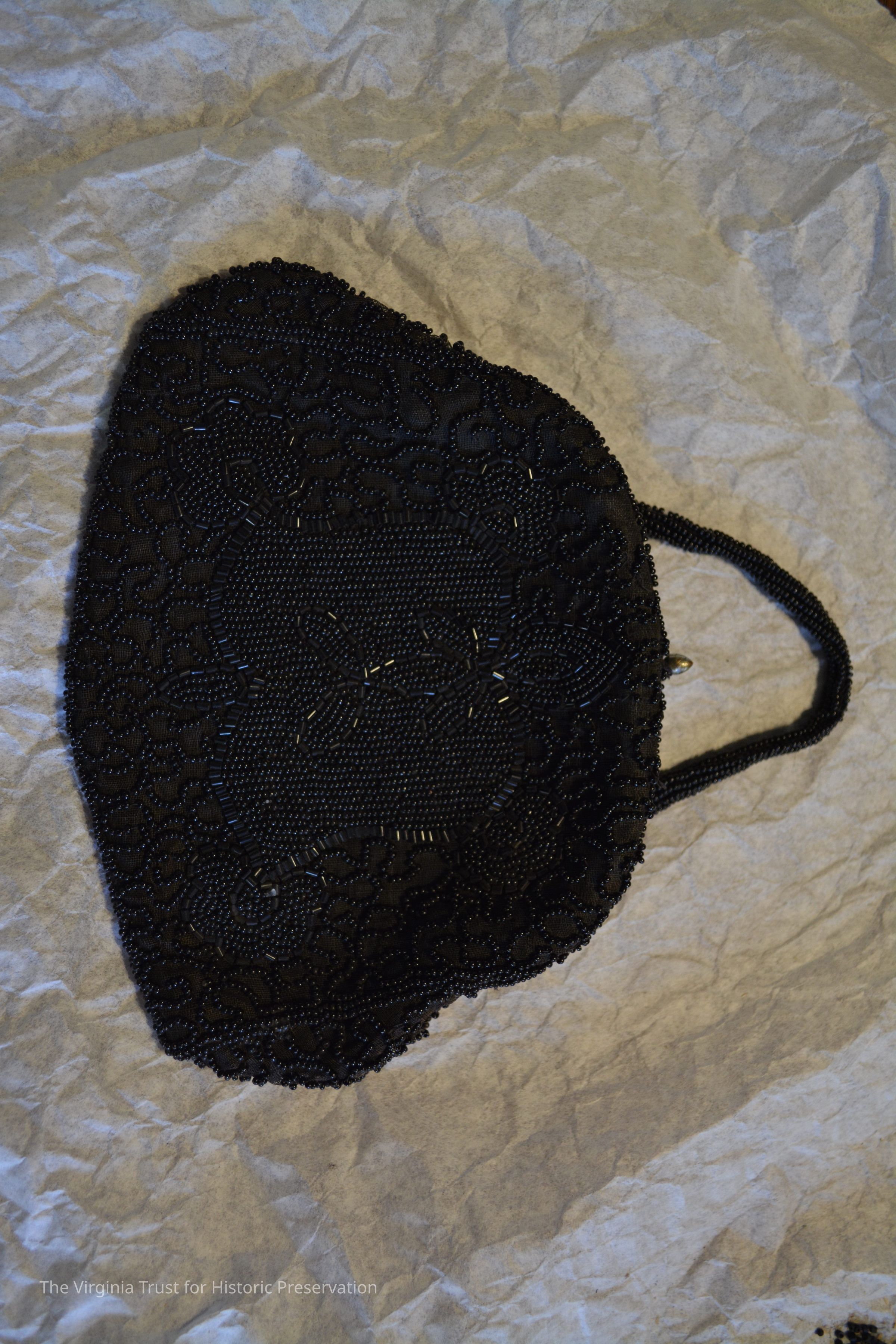 Black beaded purse with short beaded strap. Metal clasp and silk lined interior.