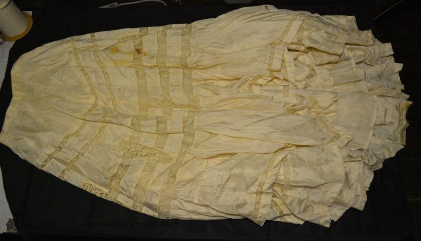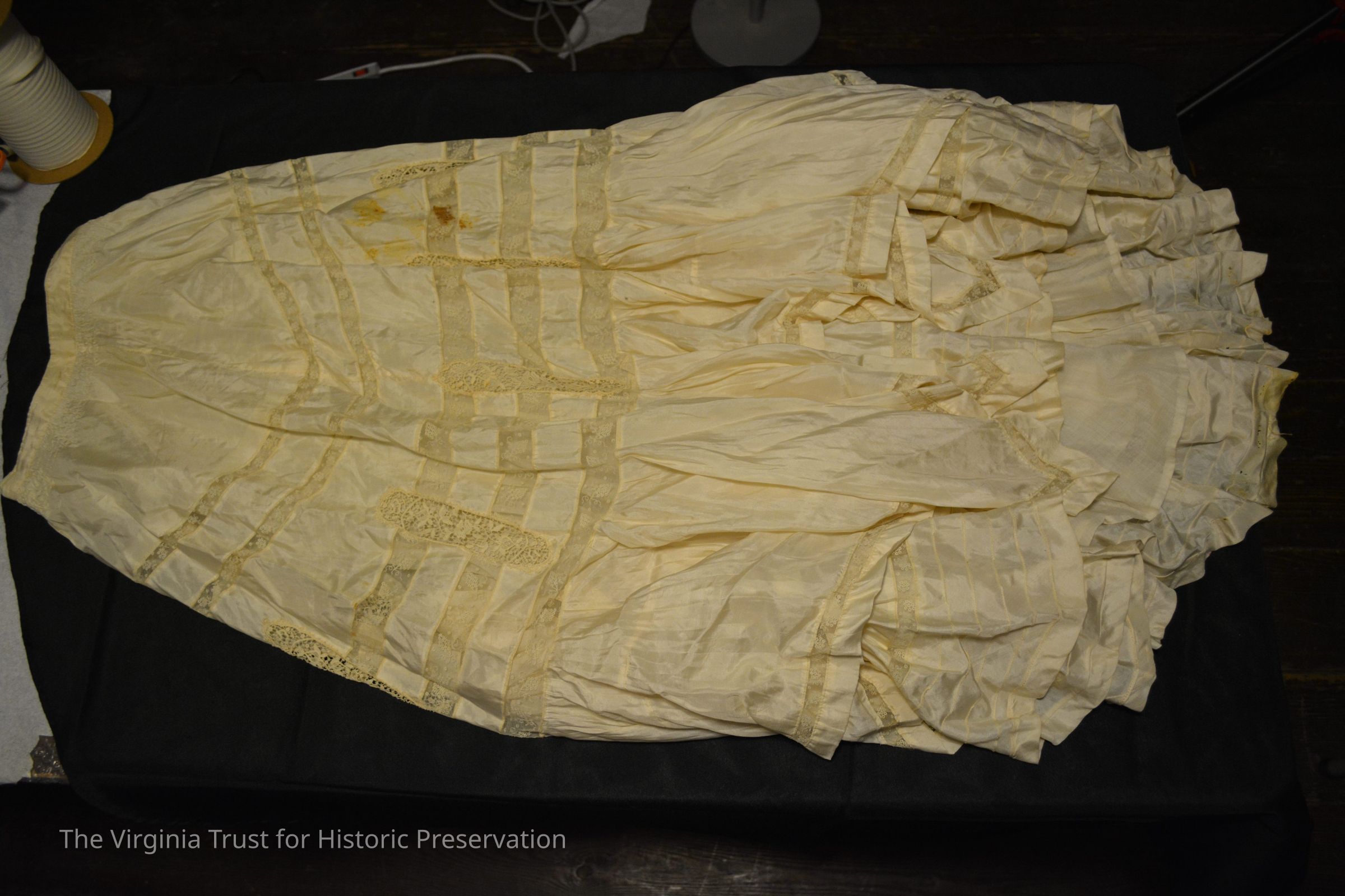 Cream silk skirt with ruffles and lace trim. Some rust staining on skirt.