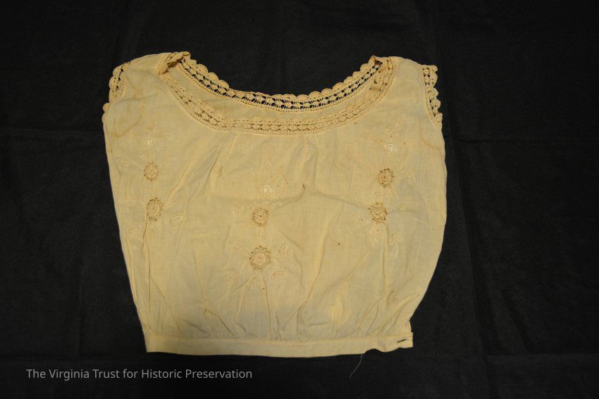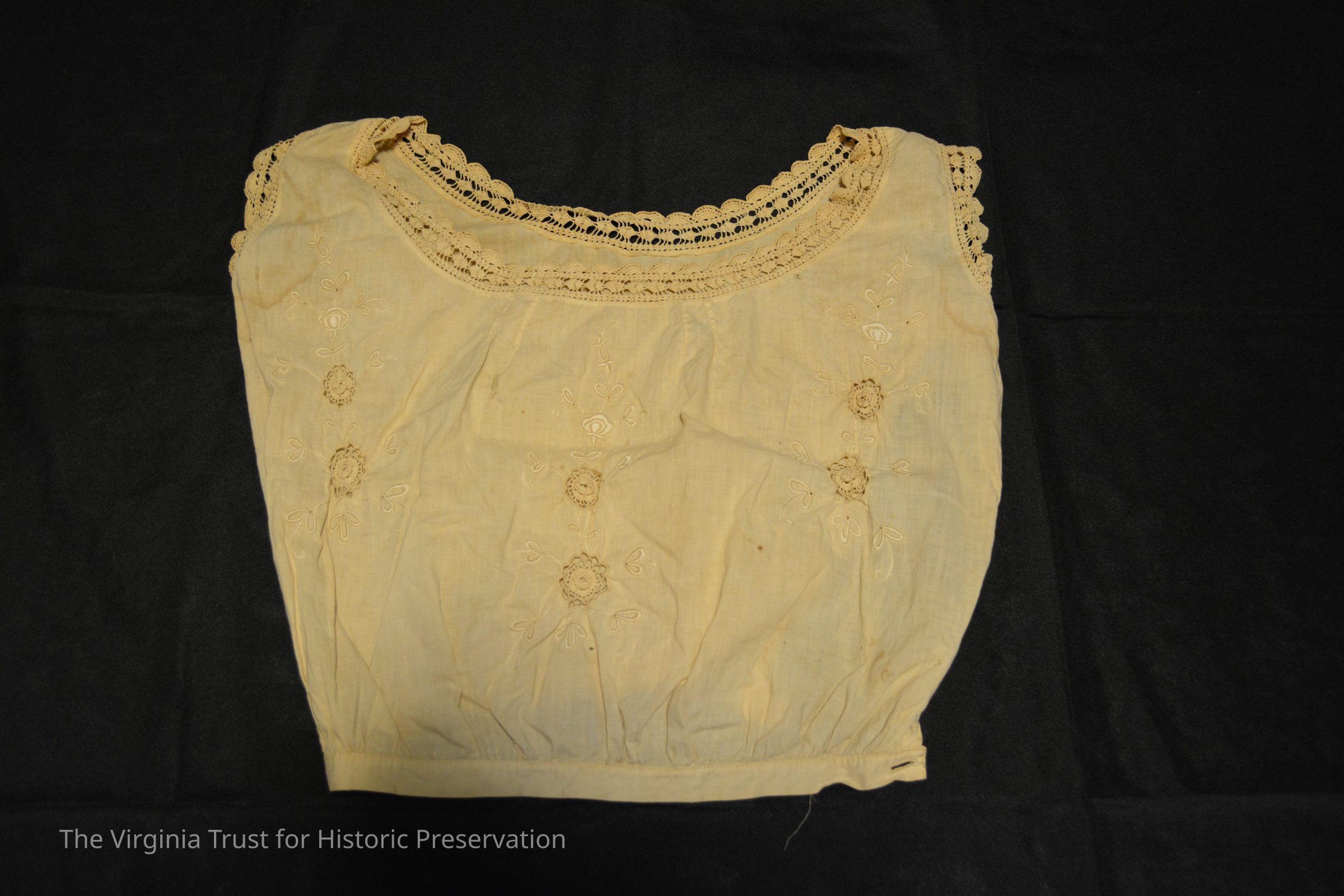 Lightweight white camisole. Open-word embroidery with chrocheted edging. Matches petticoat.