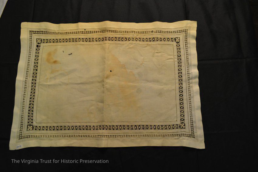 Rectangular linen table cover. Two bands of lace around outer edges. Significant staining and holes. White linen, hand drawn delicate design. "Came from Mount Vernon".