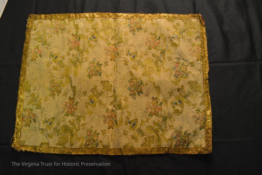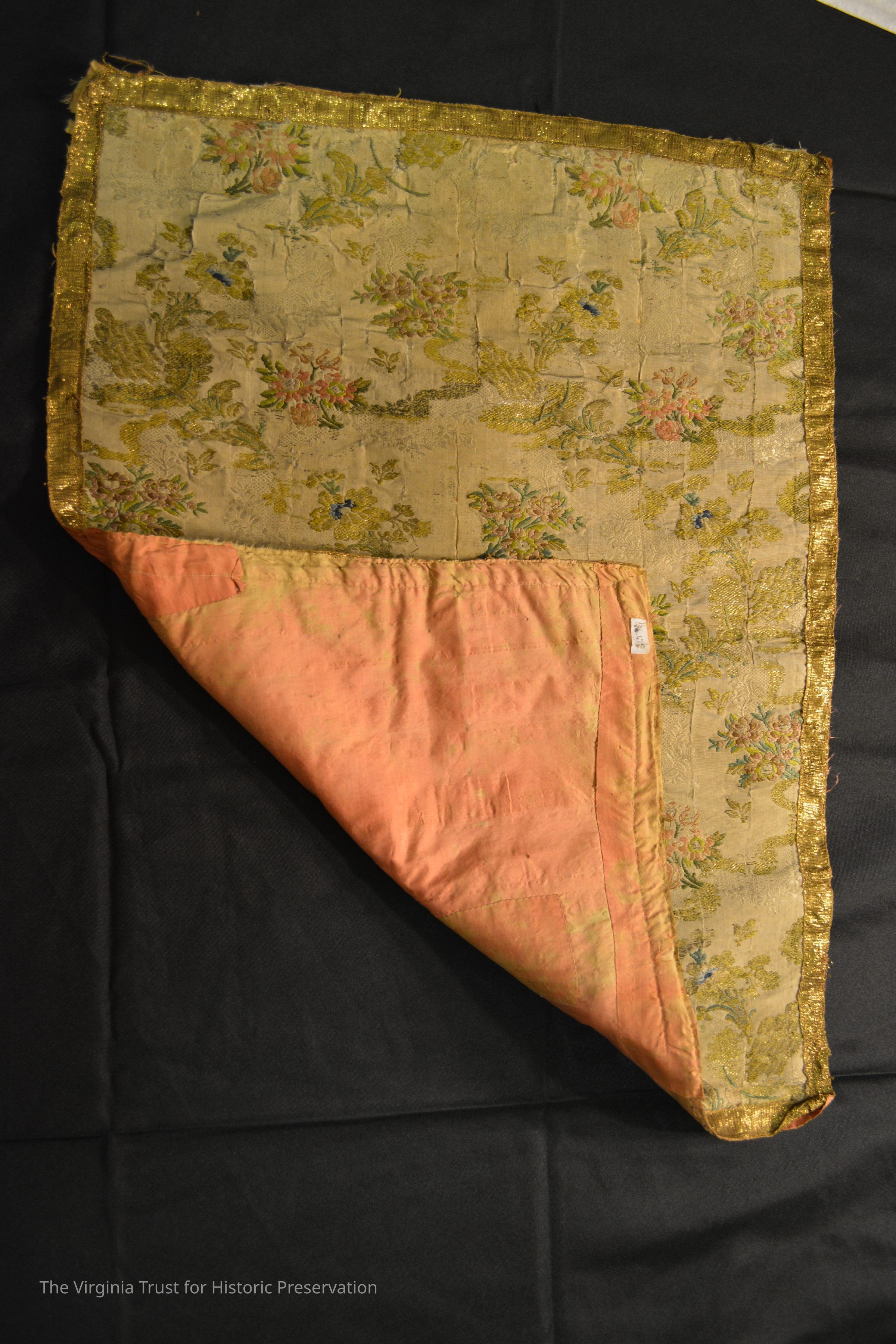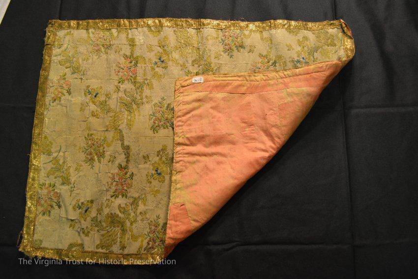 Roman church brocade lined with pink silk. Attached note dated 1903: "Church brocade brought from Rome by Mildred Lee, daughter of Gen. R.E.Lee." Silk woven fabric with metallic detail backed with faded red silk. Brocade fabric trimmed in metallic ribbon along edge. Silk appears to have been of fine high quality fabric but has deteriorated over time. Embroidered floral motif.