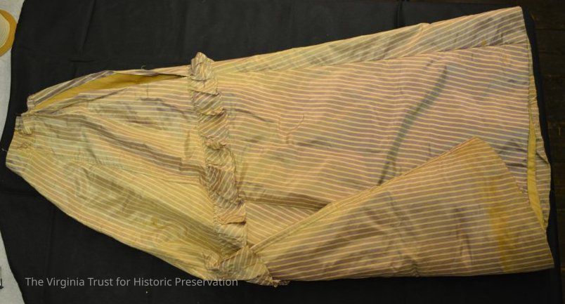 Silk skirt in lavender and white verticle stripe pattern silk. Decorative ruffle from rear to front in downward diagonal.