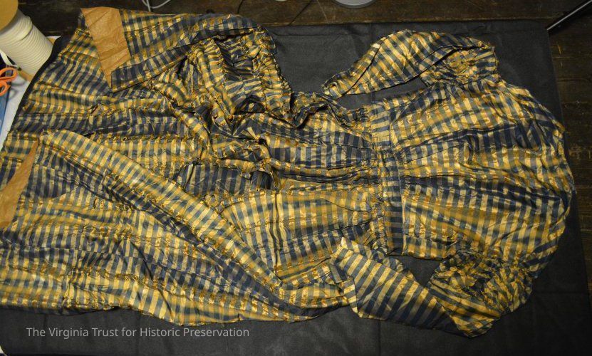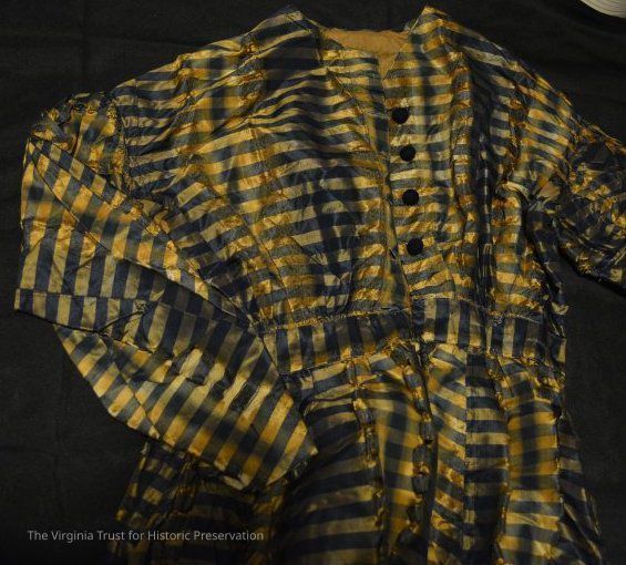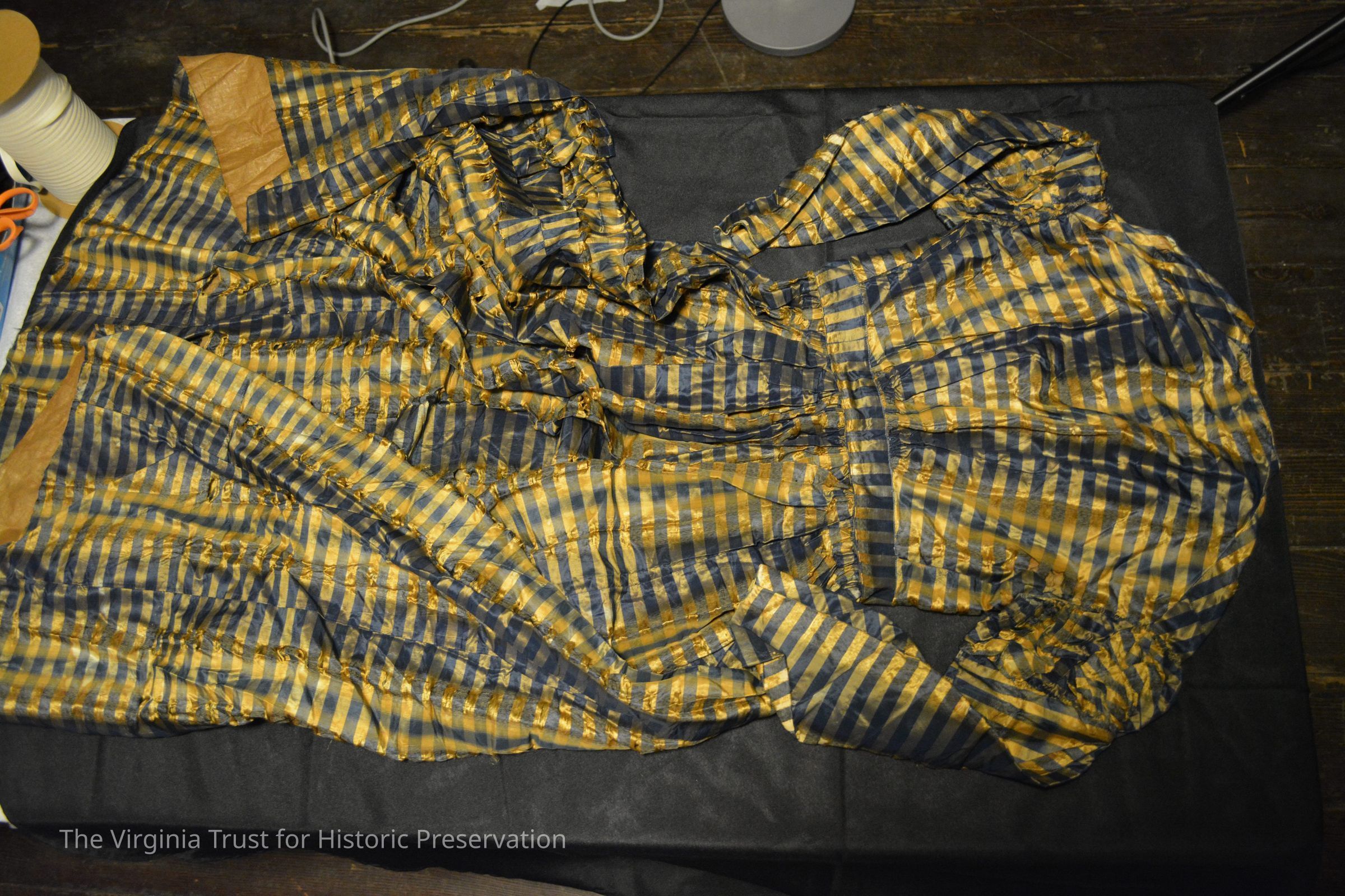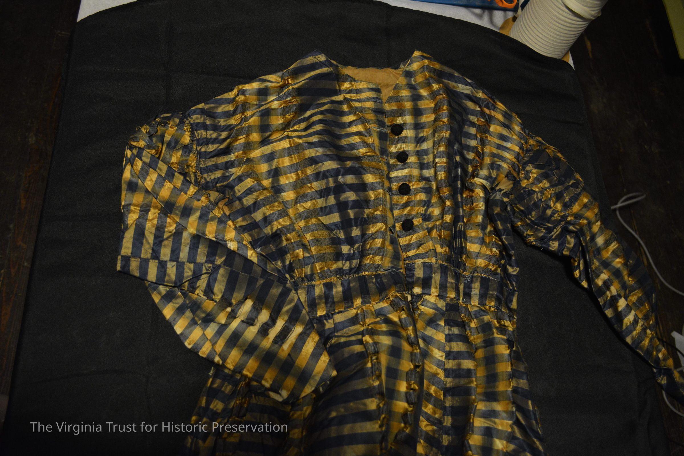 Dress of silk taffeta with alternating blue and gold horizontal and vertical stripes. The bodice has a high rounded neckline and closes with 6 buttonholes - 4 black, knotted thread covered buttons are extant. The sewn in waistband goes straight across between the bodice and skirt and closed with at least one hook and eye, but only one eye remains. The sleeves are long, narrowing toward the wrist. The shoulders of the dress are emphasized with additional tucked fabric. The skirt is full and pleated. The bodice is lined with a plain fabric -either cotton or linen - and the skirt is hemmed with a band of approximately 8 inches of the same fabric.