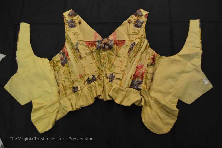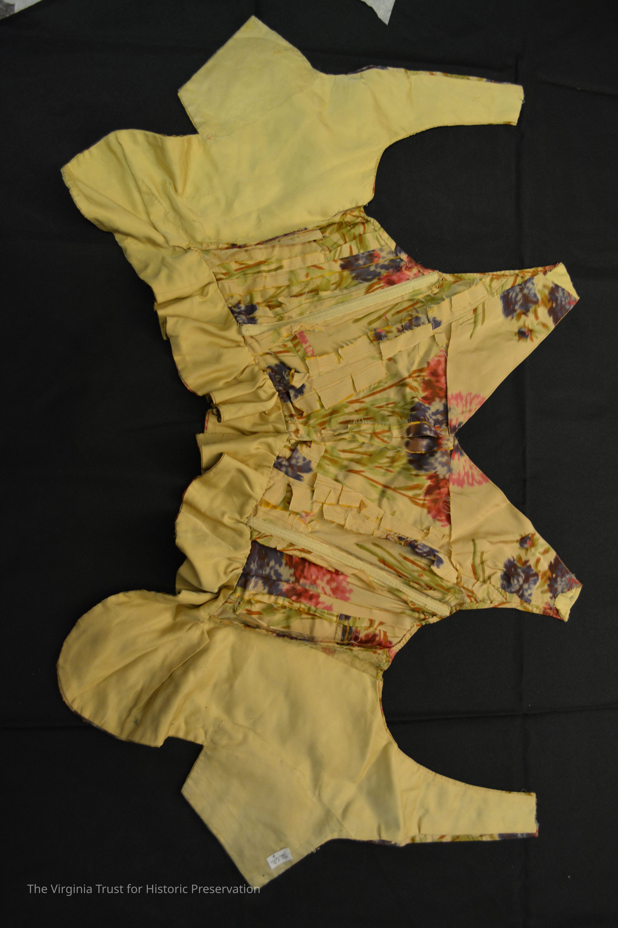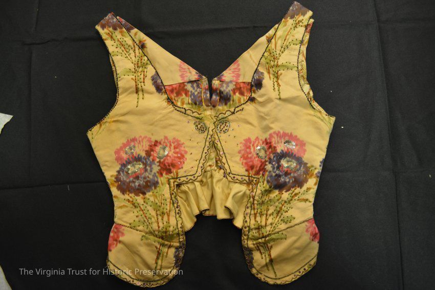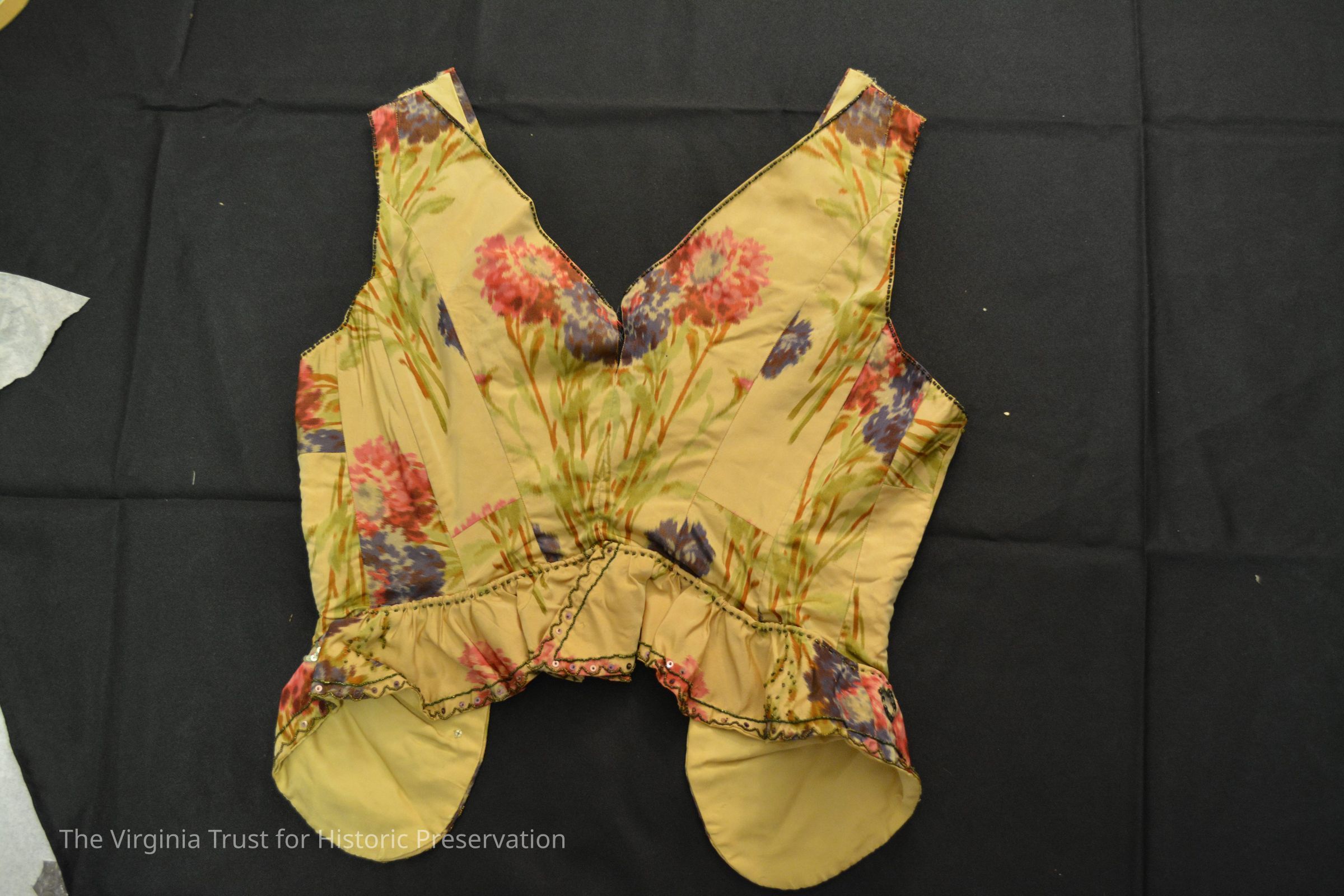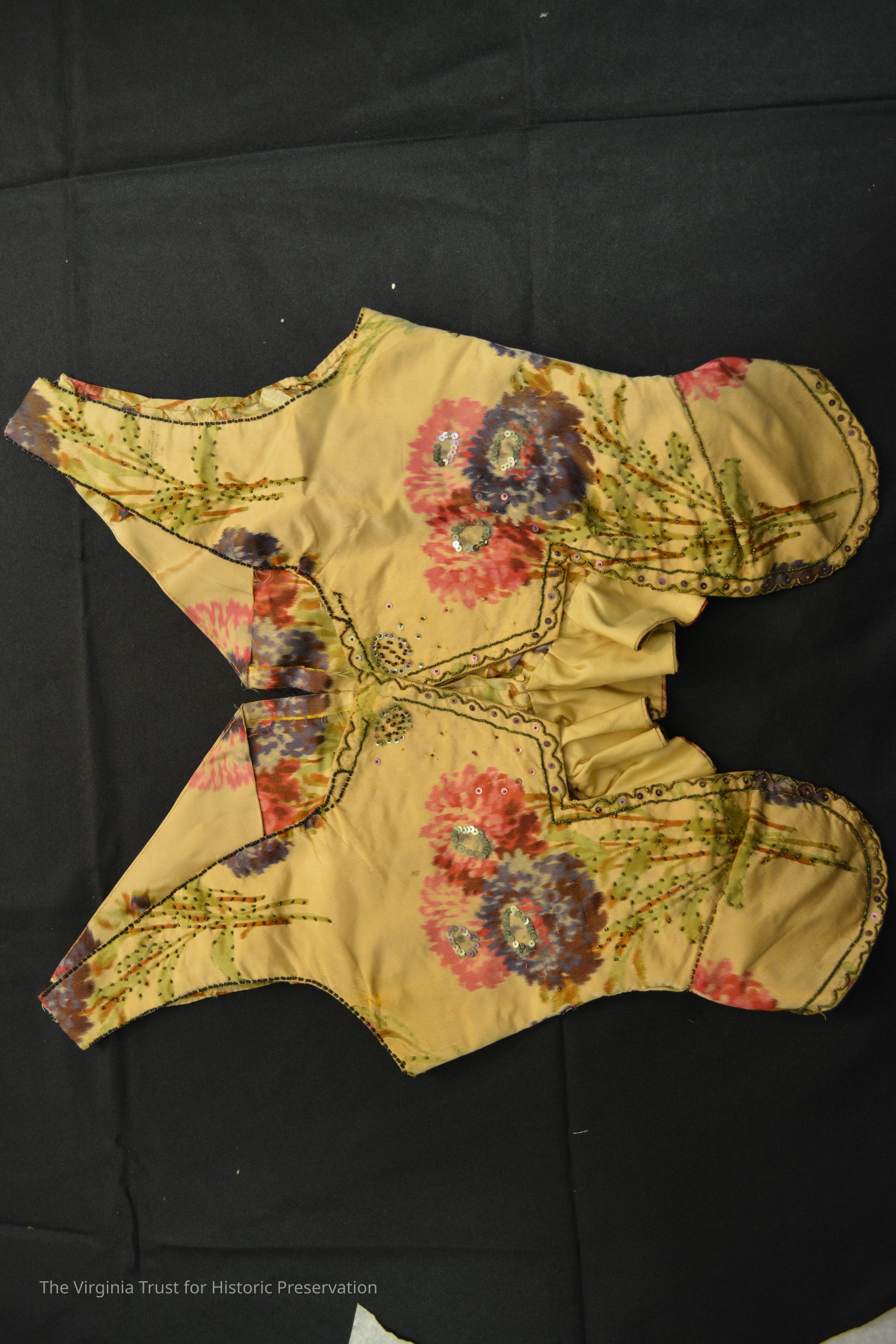 Bodice of printed silk. Deconstructed, possibly a pageant outfit. Bead and sequin embellishment on pattern. Does not appear to have had sleeves but is possibly missing a stomacher.