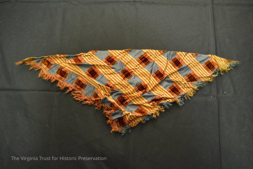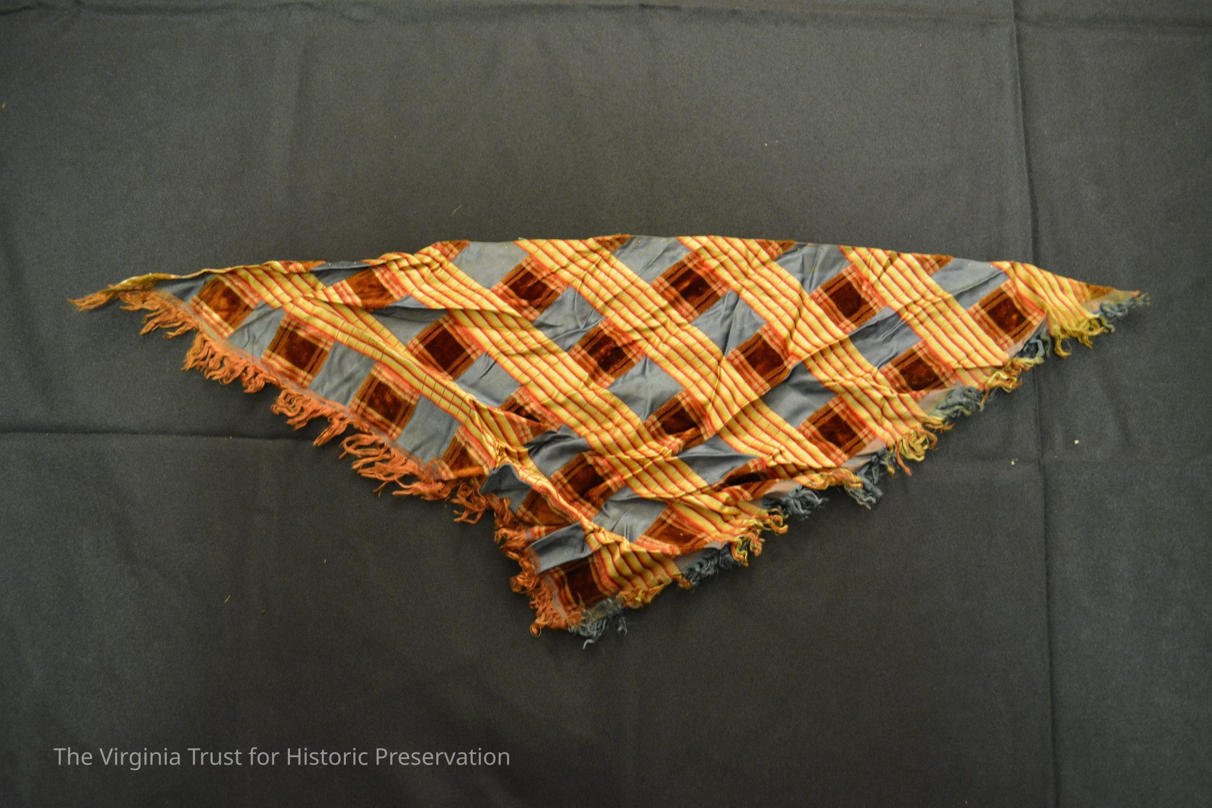 Triangular fabric kerchief with fringed edge. Blue, brown, and gold plaid fabric.
