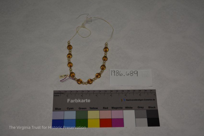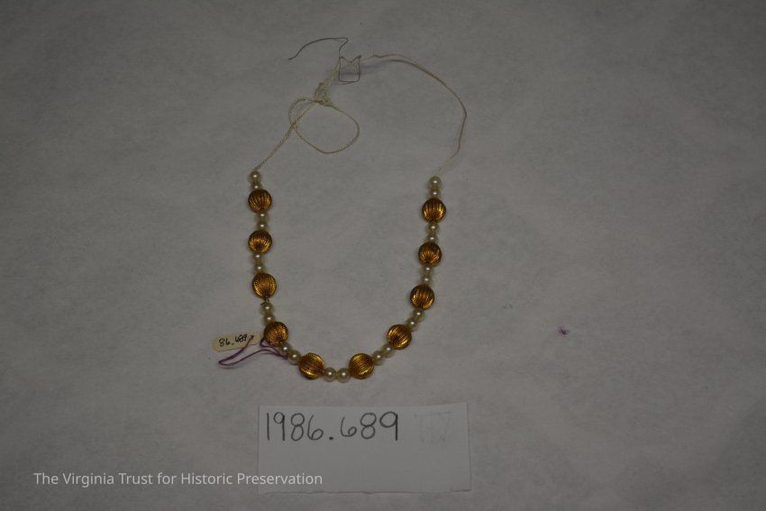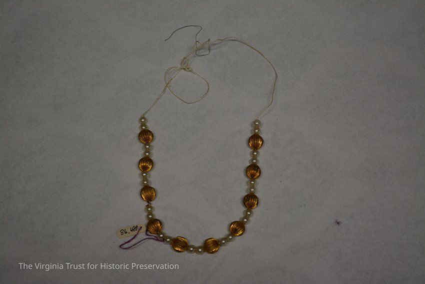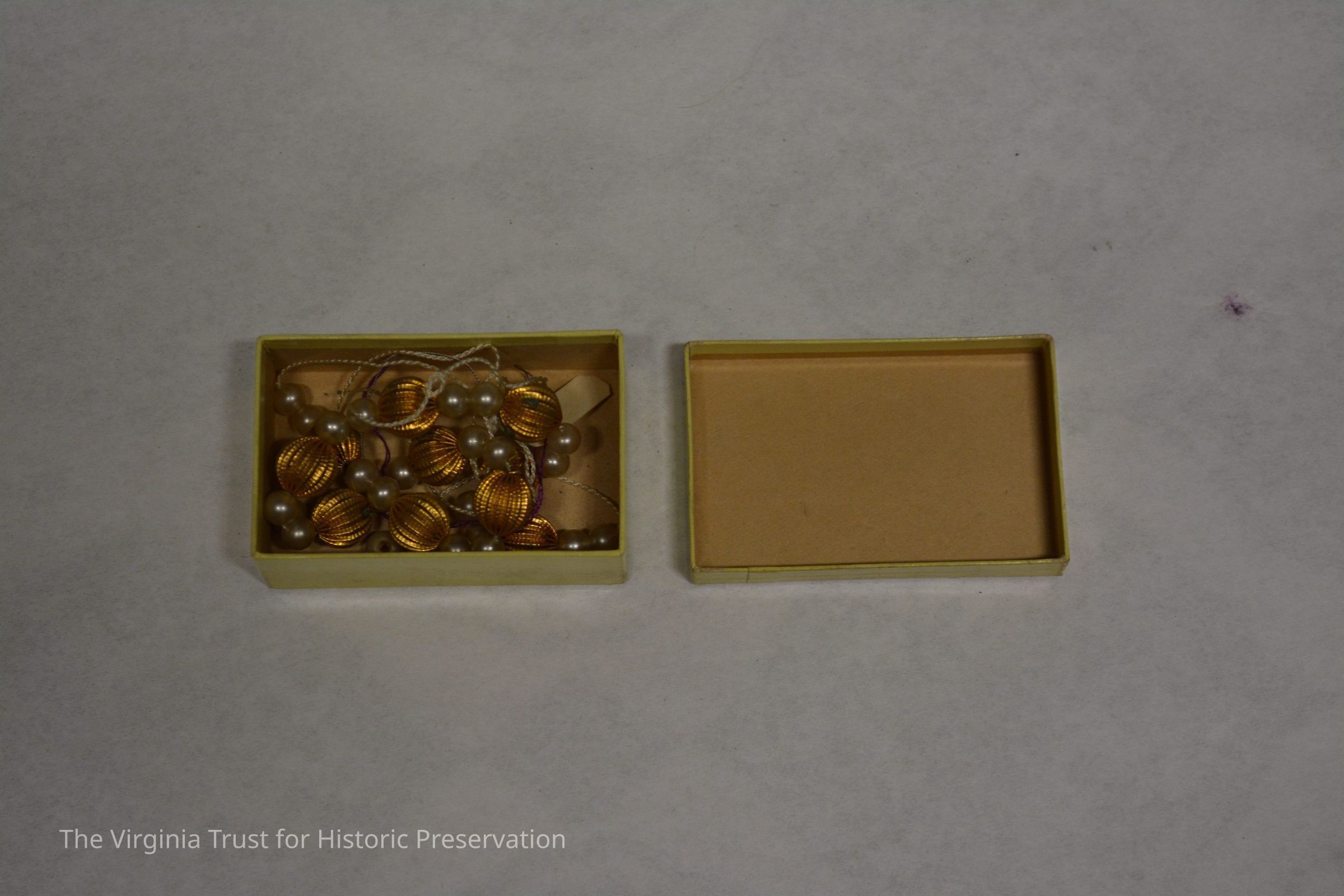 Metal string imitation pearls for doll. Placed in doll trunk (1986.688 U) within a box labelled "A. Stowell & Co. Jewelers, 24 Winter Street, Boston".Dimensions