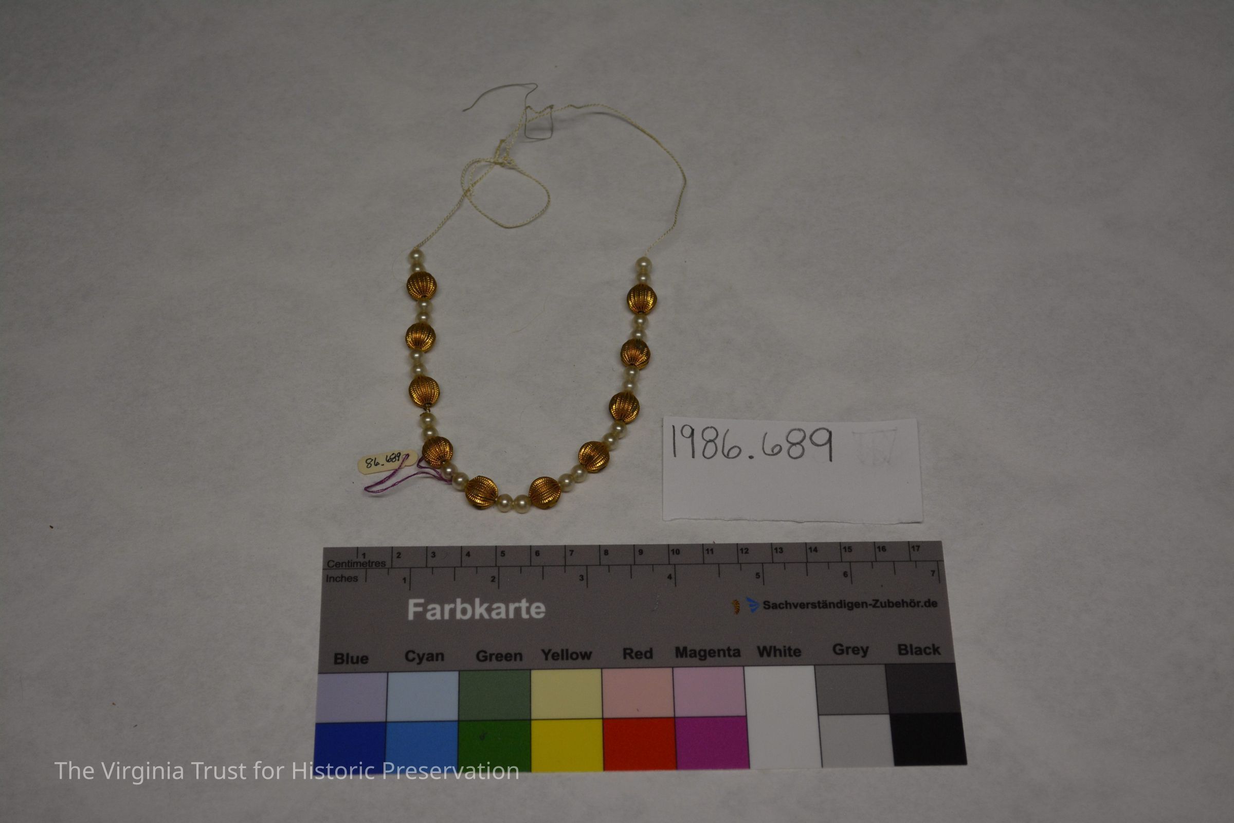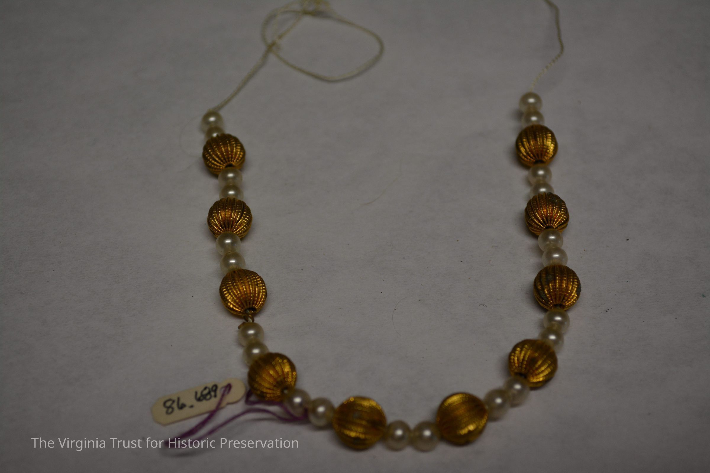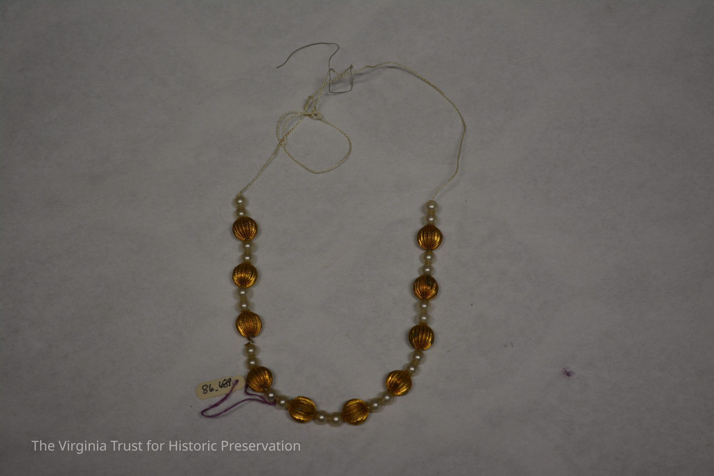 Metal string imitation pearls for doll. Placed in doll trunk (1986.688 U) within a box labelled "A. Stowell & Co. Jewelers, 24 Winter Street, Boston".Dimensions