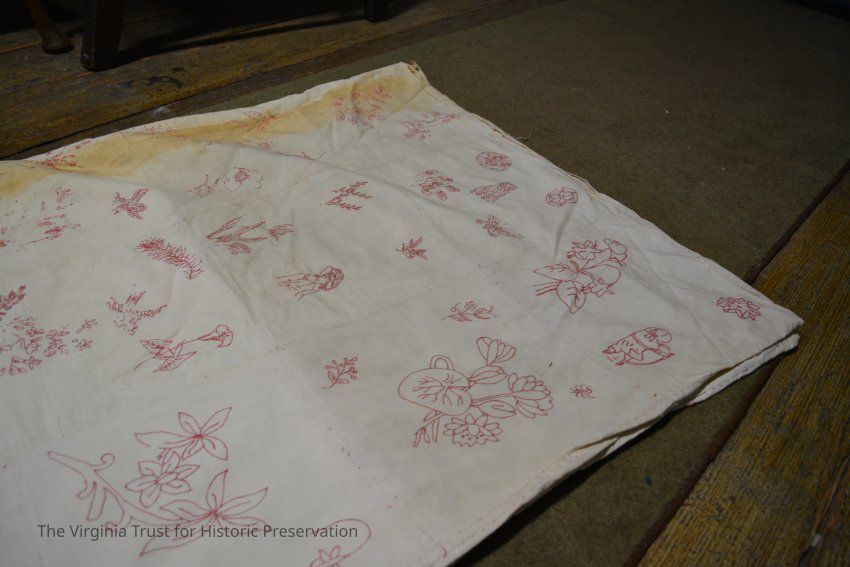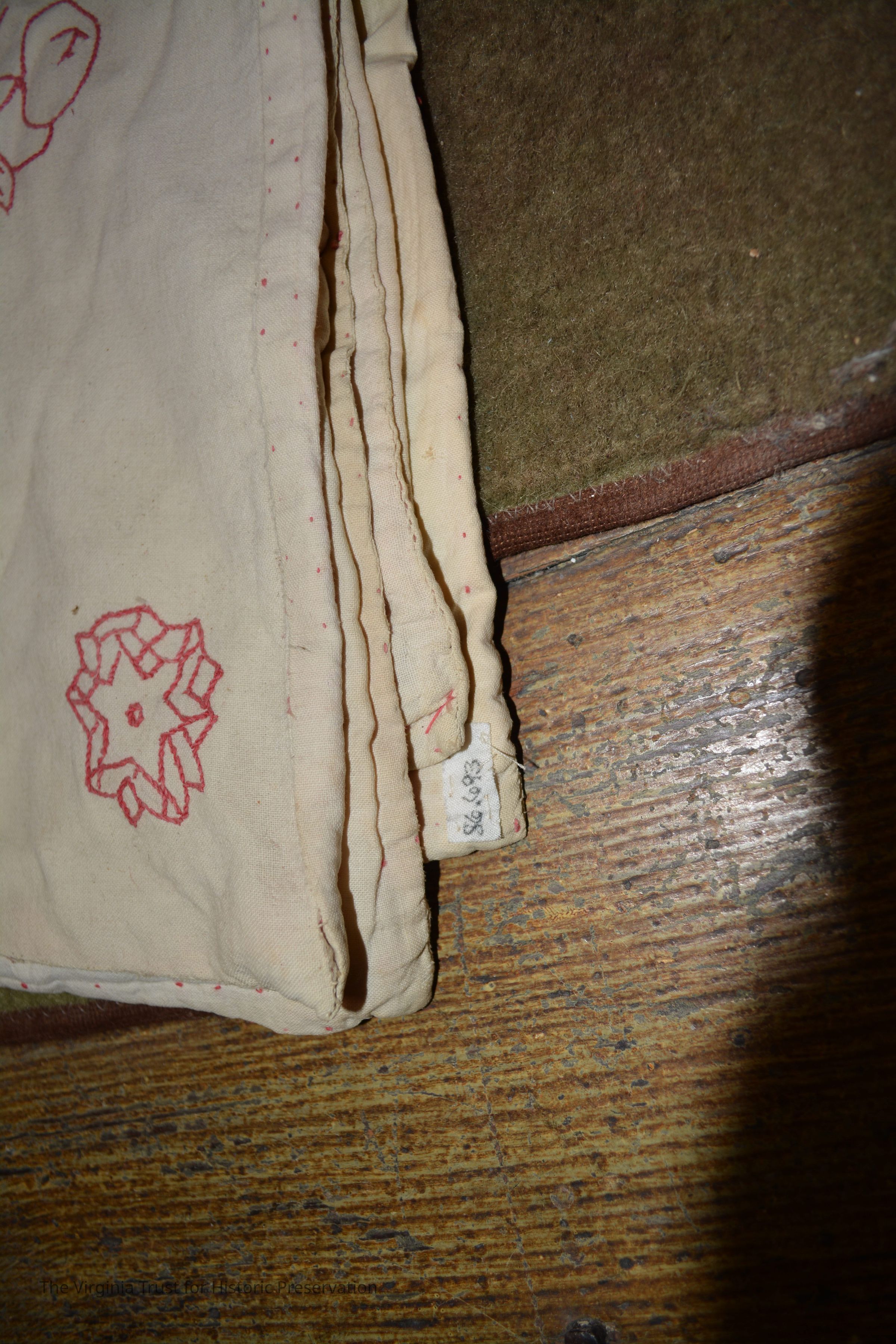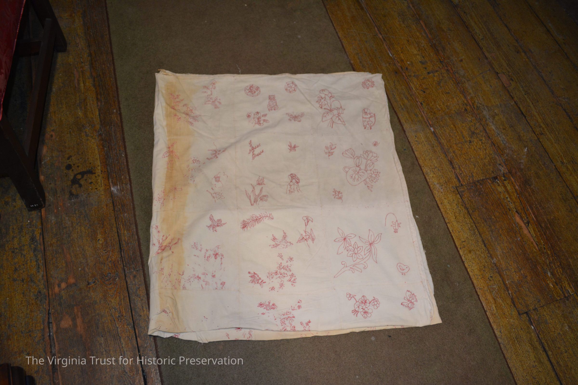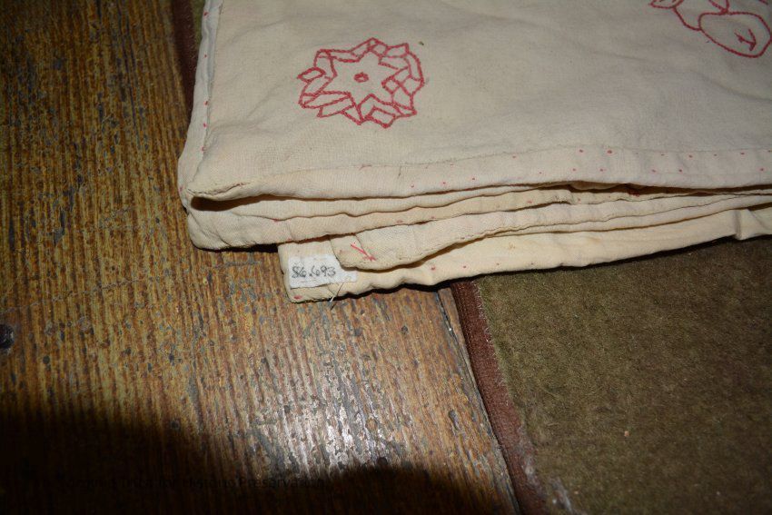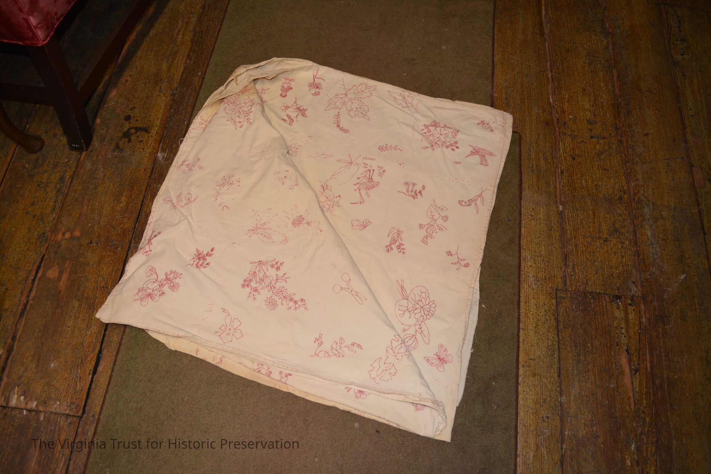 White with red floral embroidery of birds and flowers. Quilt top coverlet.