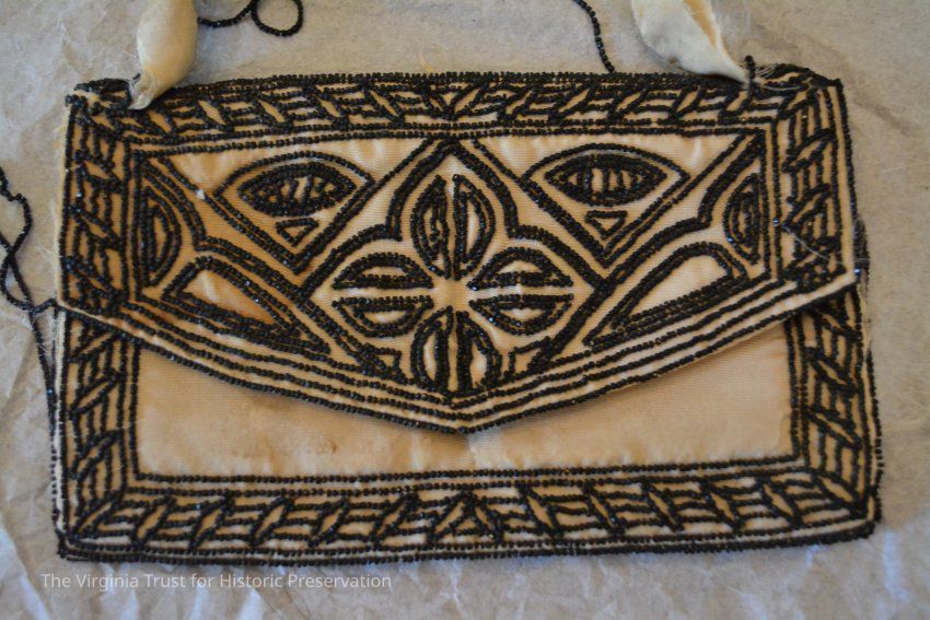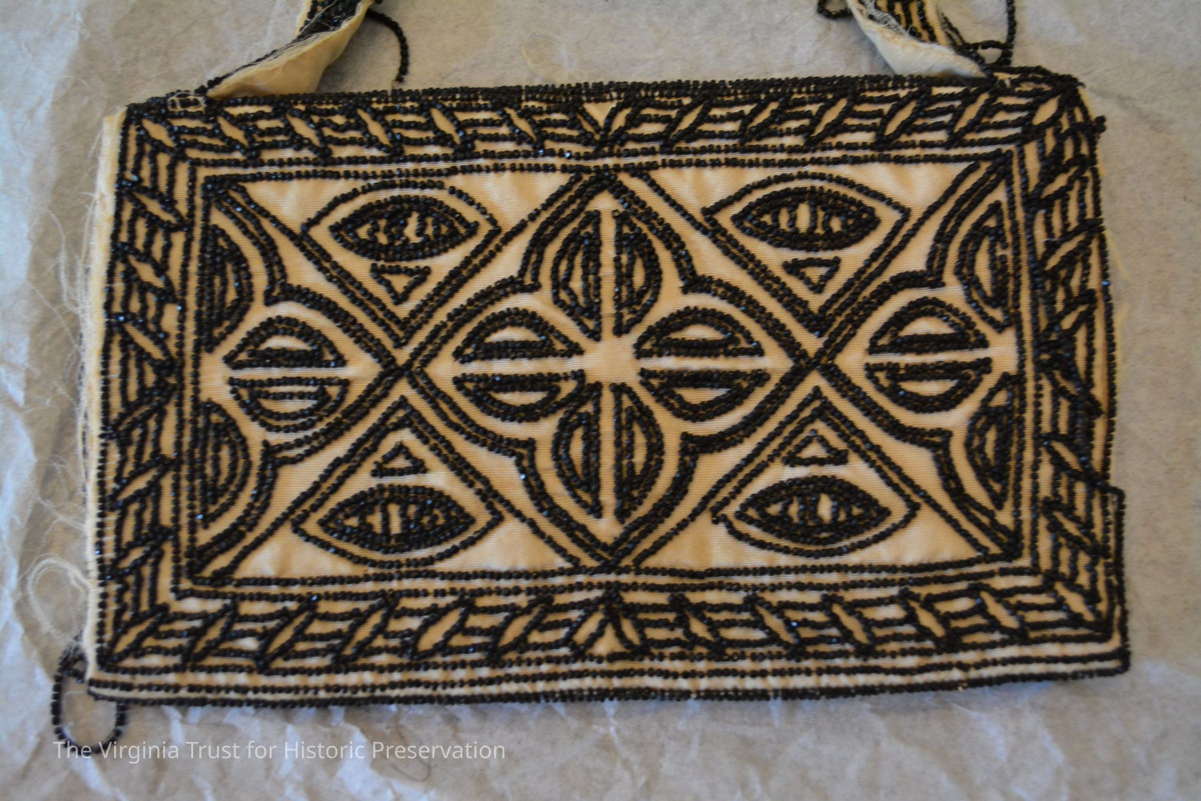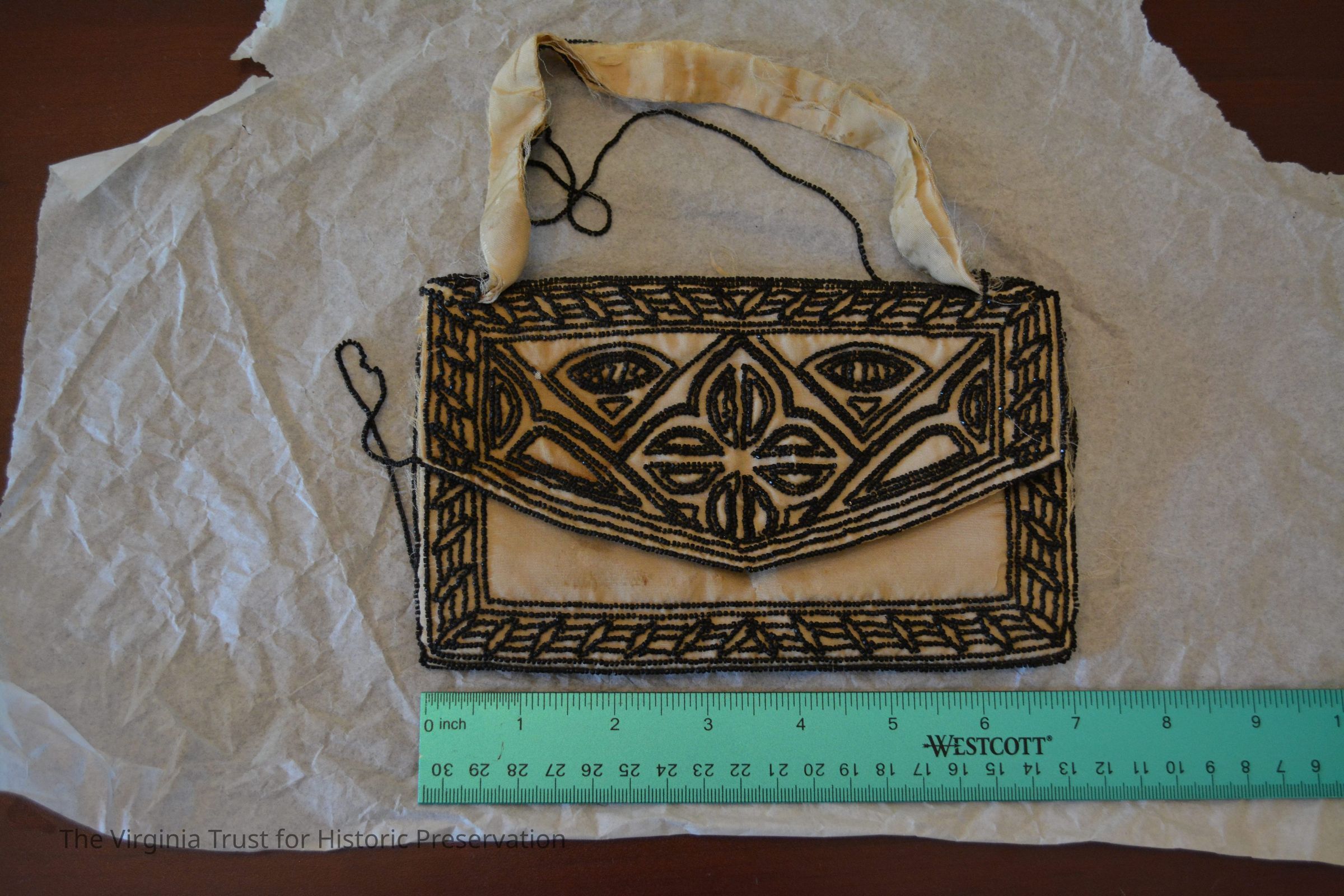 Cream handbag with black beading, some beading is detached. c.1920s.