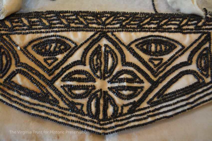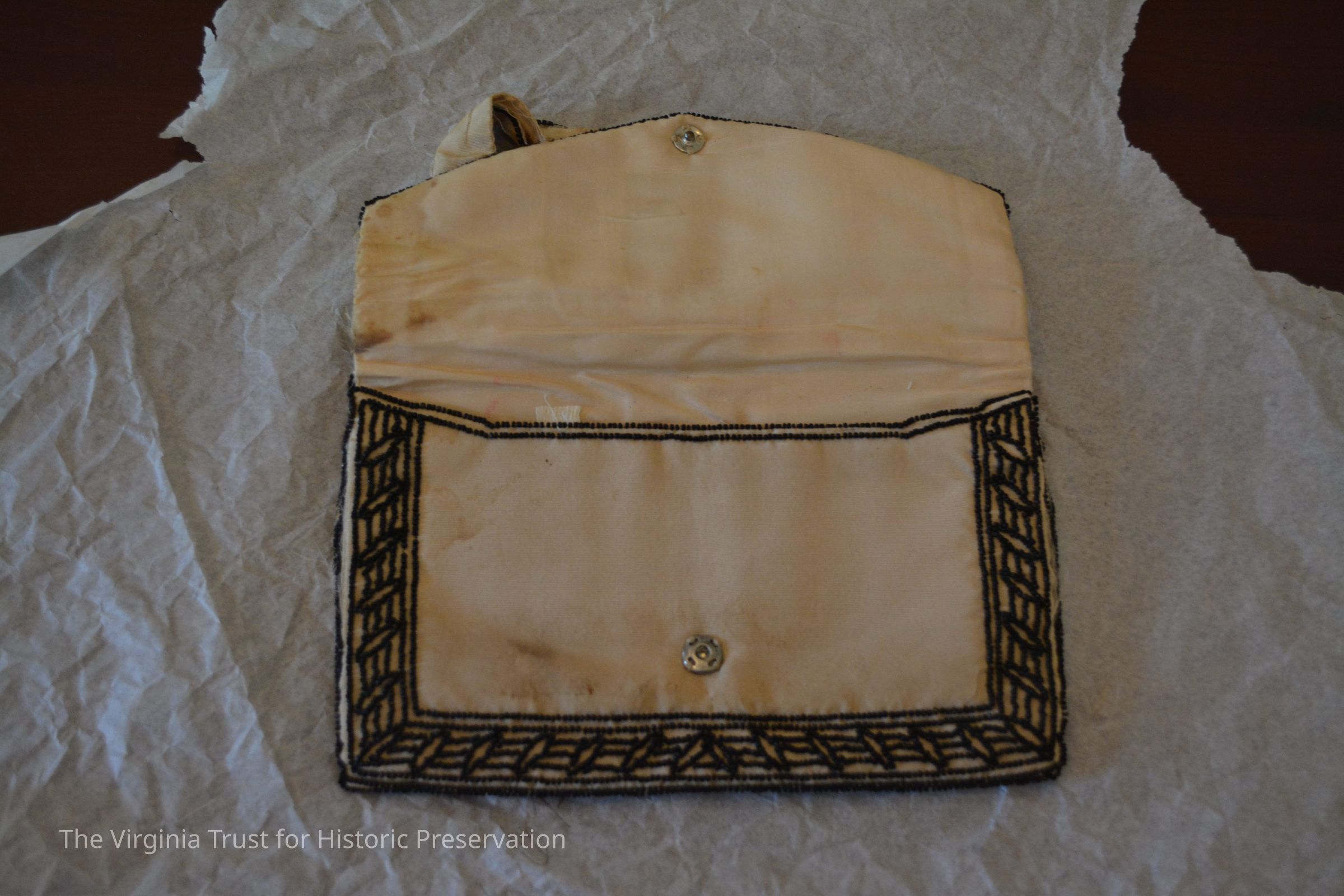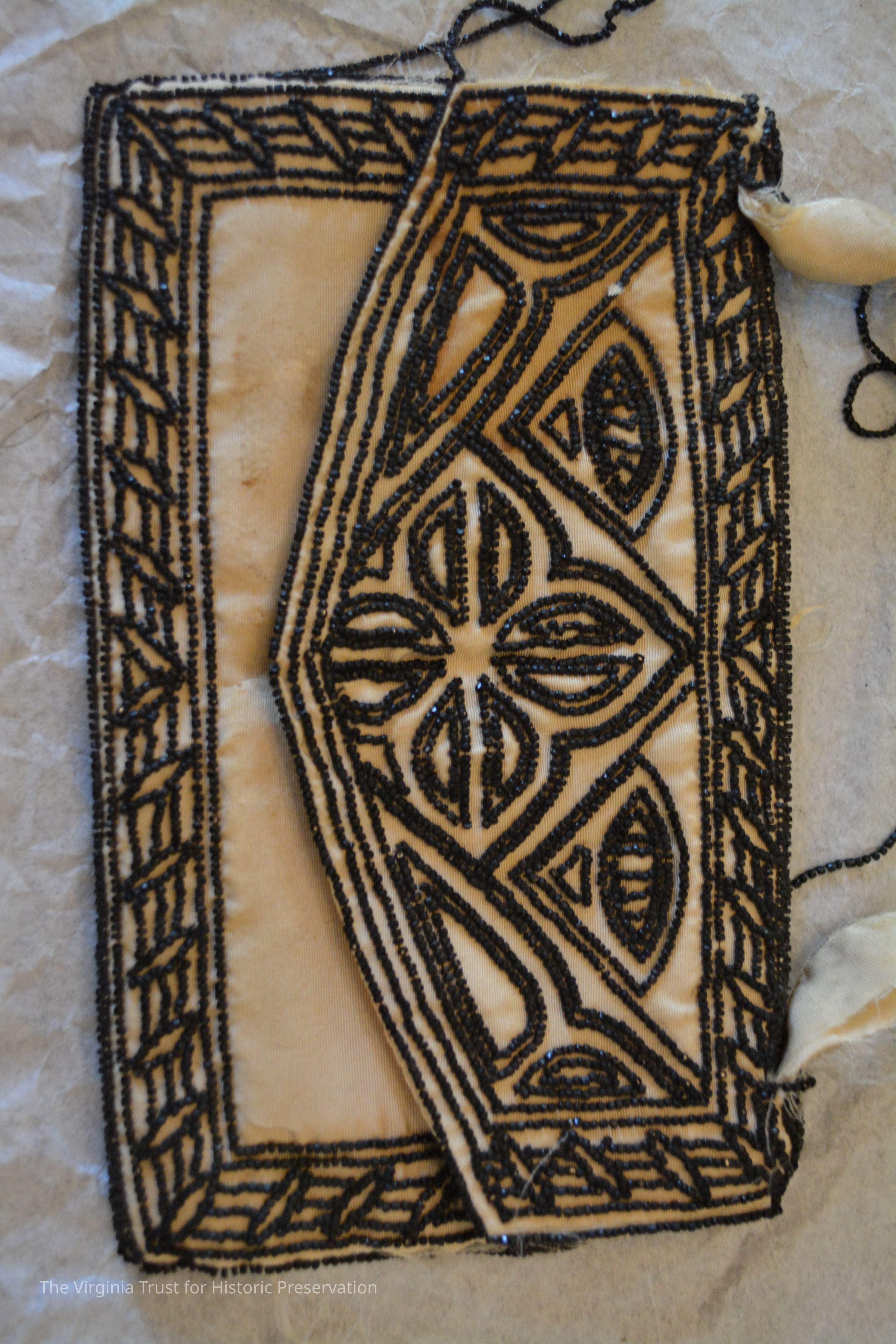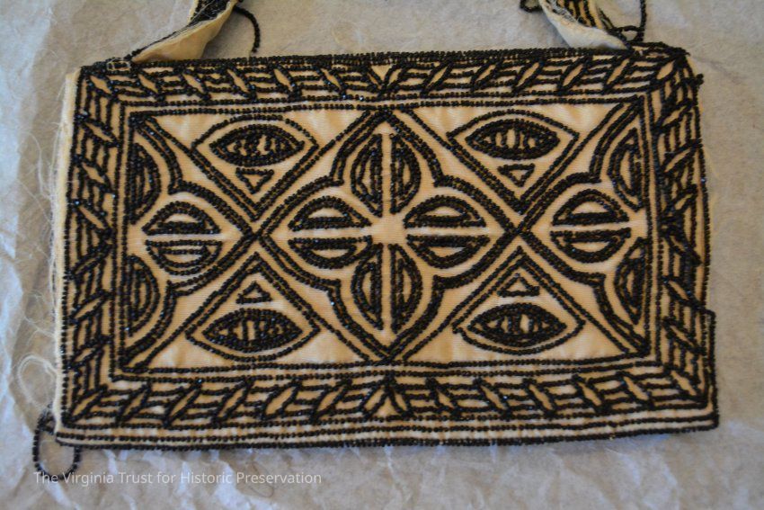 Cream handbag with black beading, some beading is detached. c.1920s.