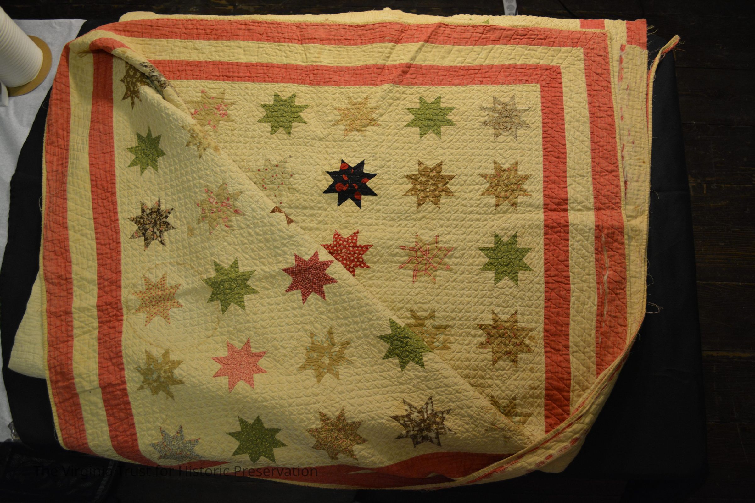 Patchwork quilt, star design on white background. double red striped border. made in 1870, hand patched and quilted. attached note and description. Made by widow of one of the first settlers of Fairfax Co., Va. The flowered calico used came from England. Each square sewer together by hand, and the grape and rose design was quilted by hand on quilting frames made in 1850. Used by 3 generations.