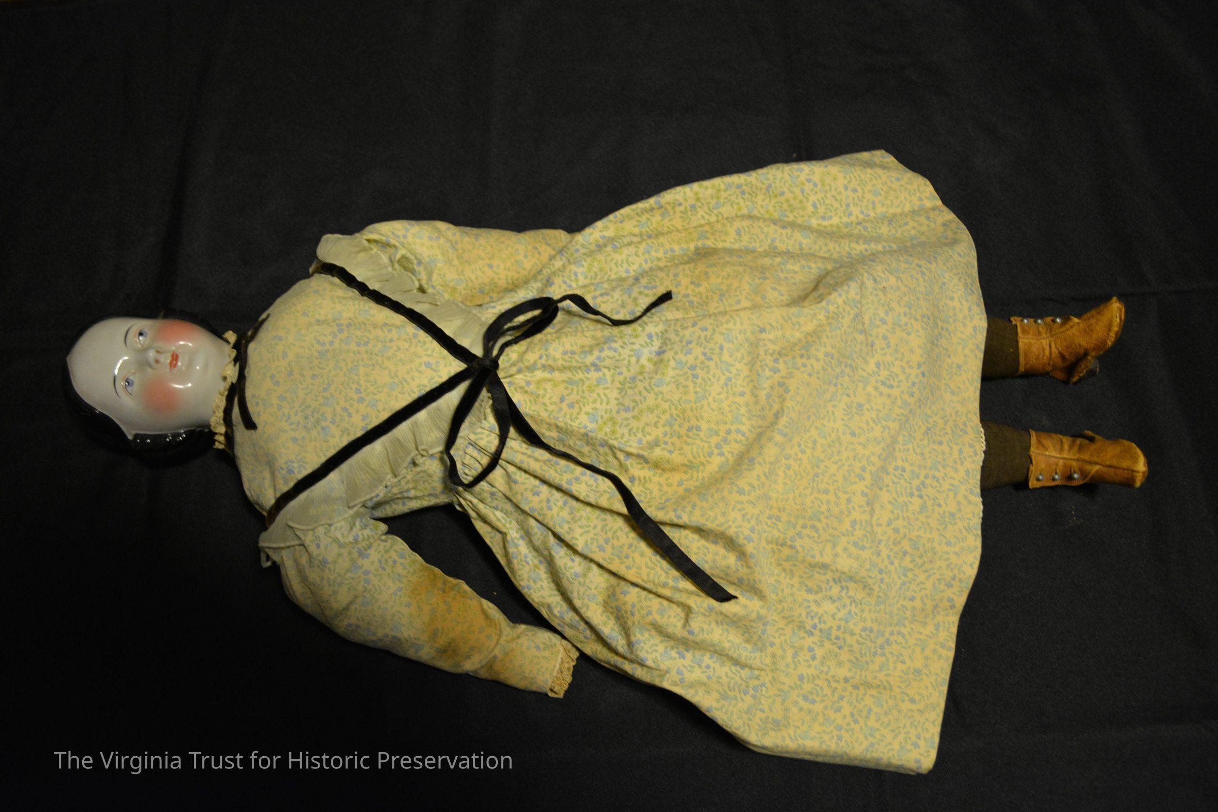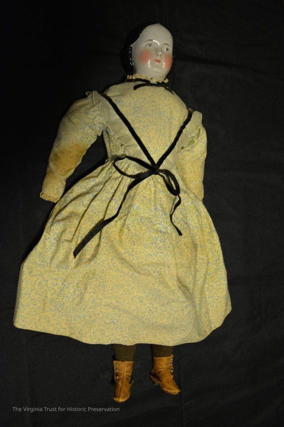 Antique china head doll with cloth body. Wearing a blue and white print dress with brown velvet and lace trim, white slip, white bloomers, 2 brown socks, and a pair of 3-button leather shoes.