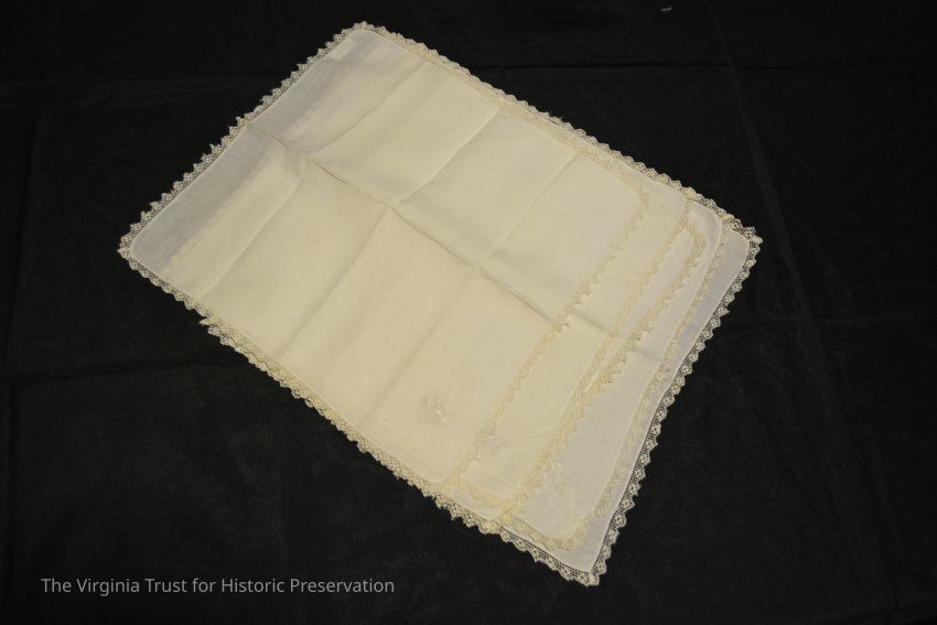 White cotton napkin/handkerchief. "LLB" monogram embroidered on corner, lace trim.
