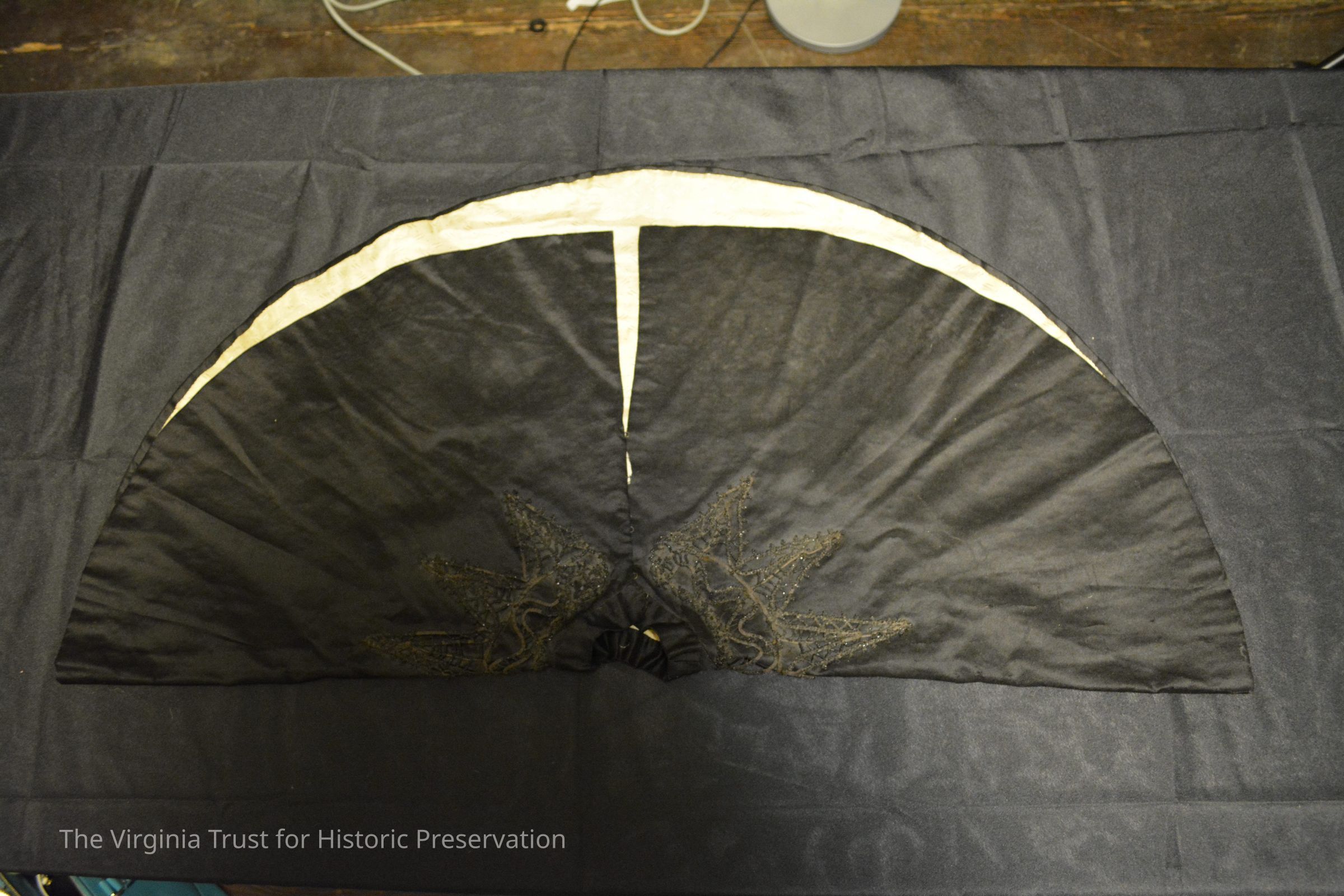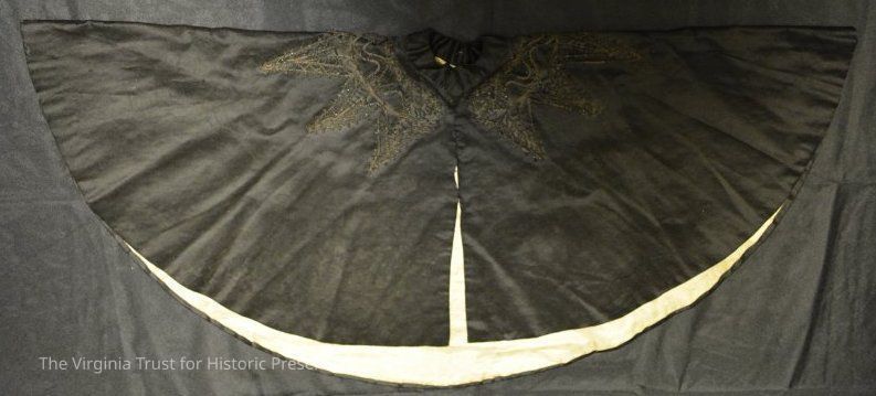 Black satin lady's evening cape lined with white fabric, jet beaded around the neck, belonged to Maude Downham. Hand stitched.