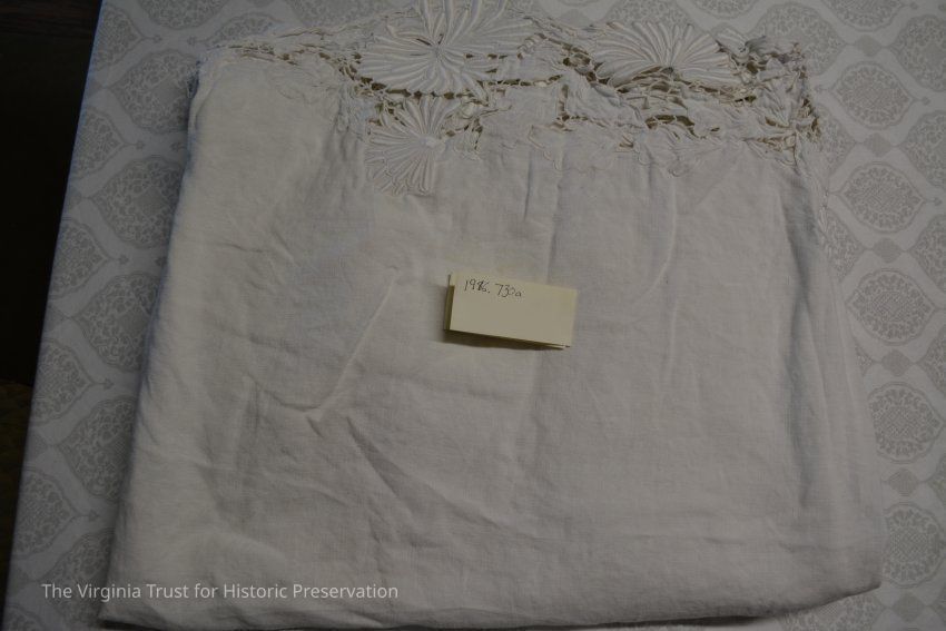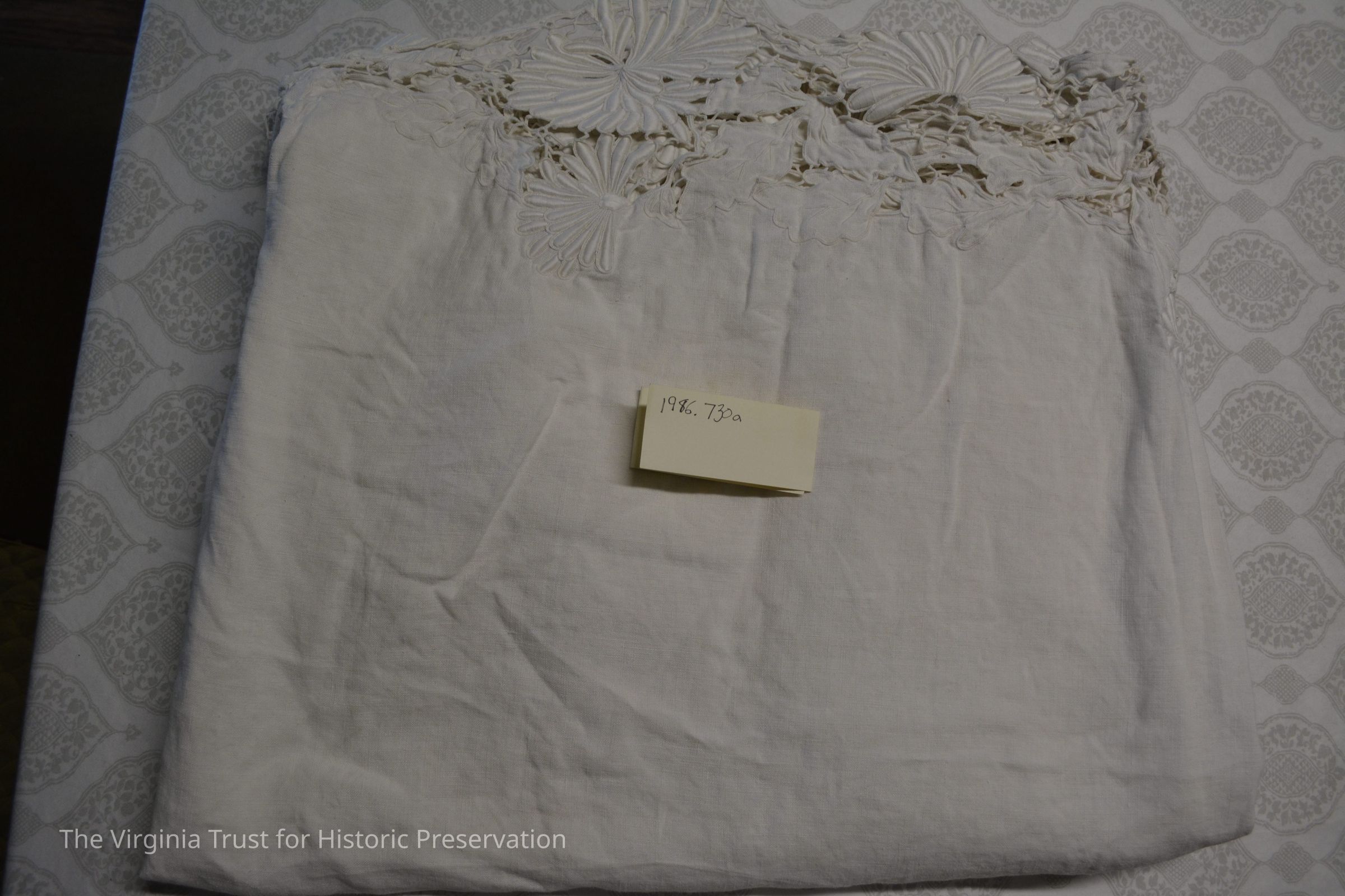 Linen banquet cloth. Cutwork and heavily embroidered. Fruit basket design. Purchased Shanghai, 1933.