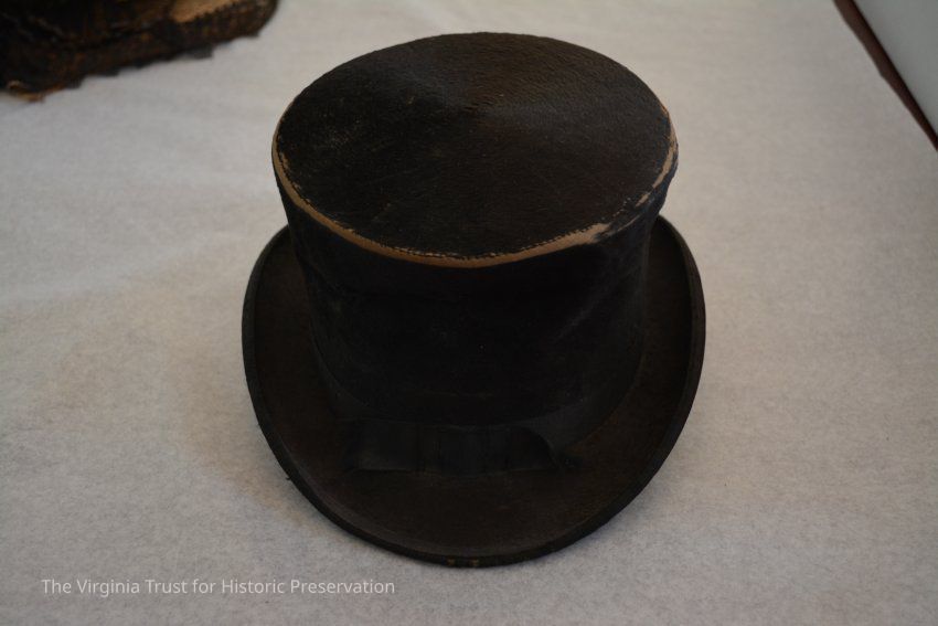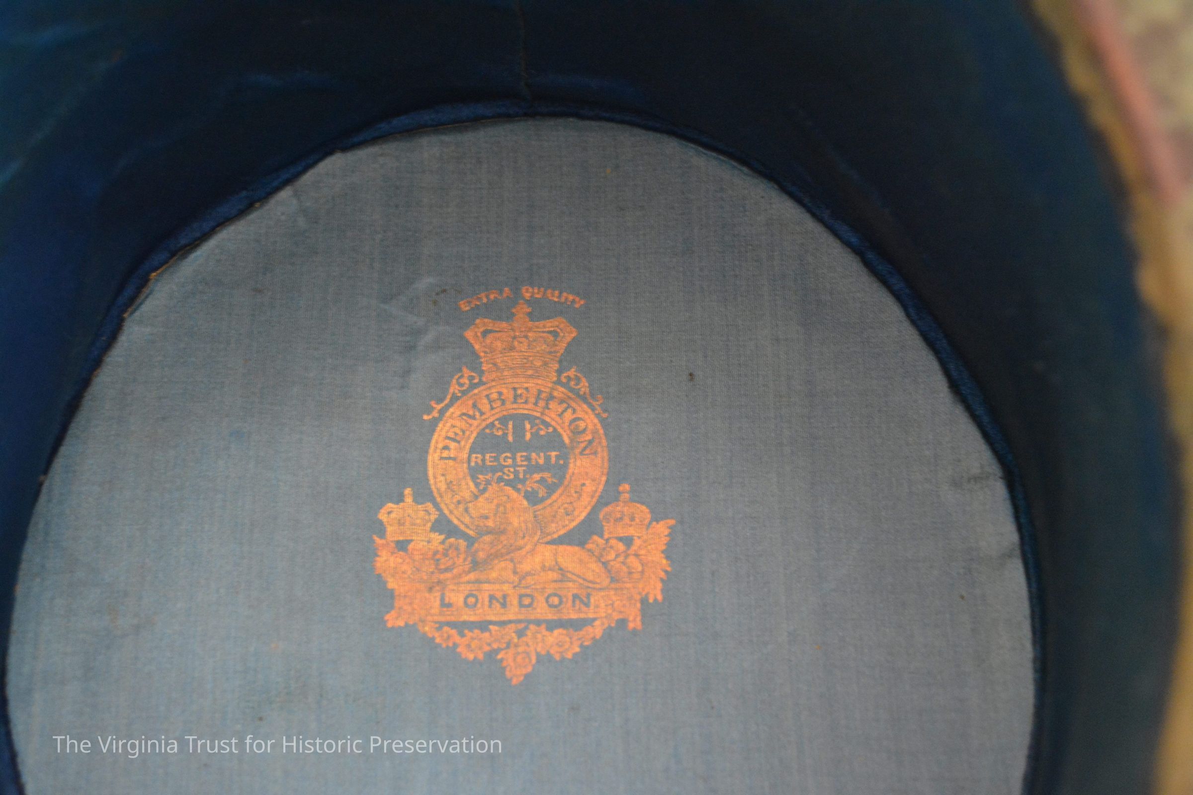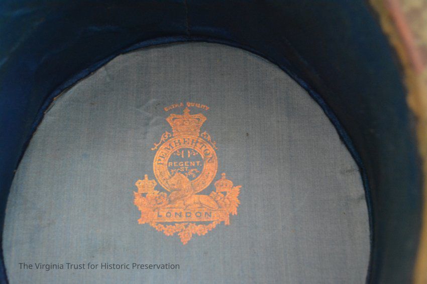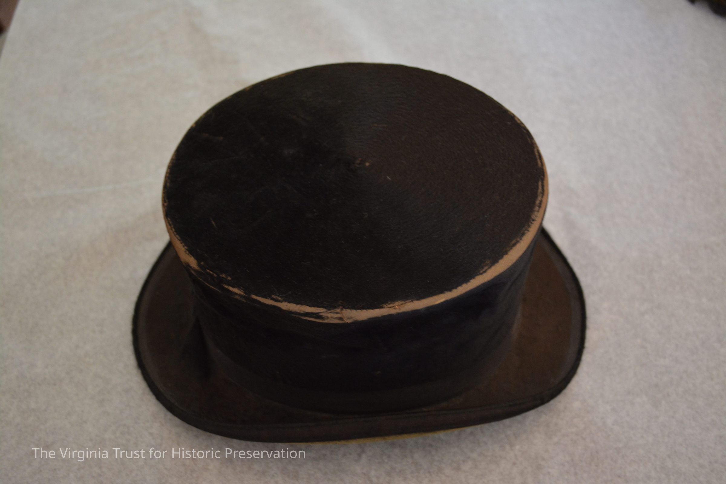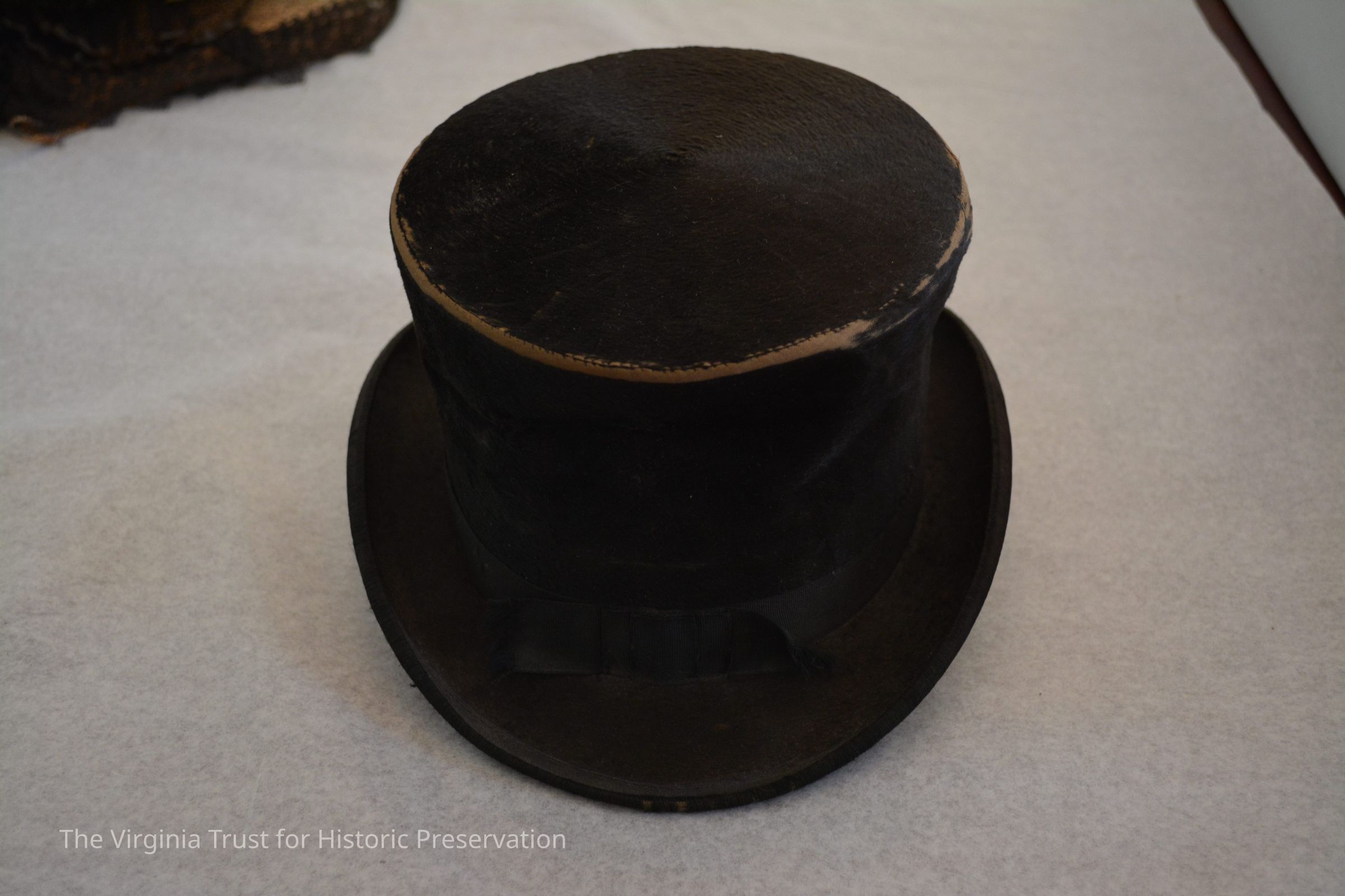 Beaver fur top hat. Black ribbon above the brim. Sold by Pemberton, Regent St, London.