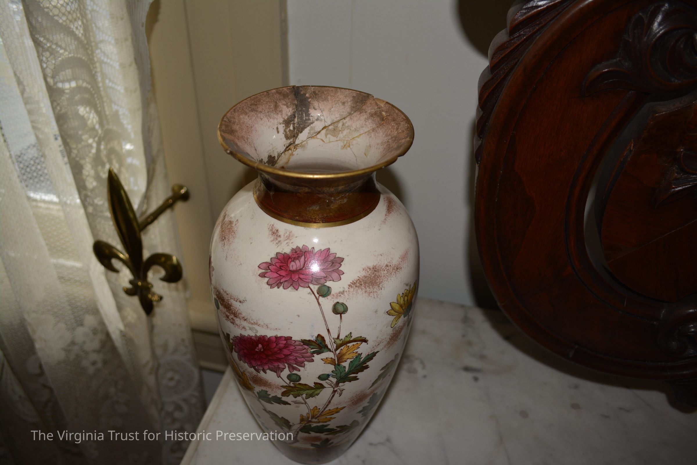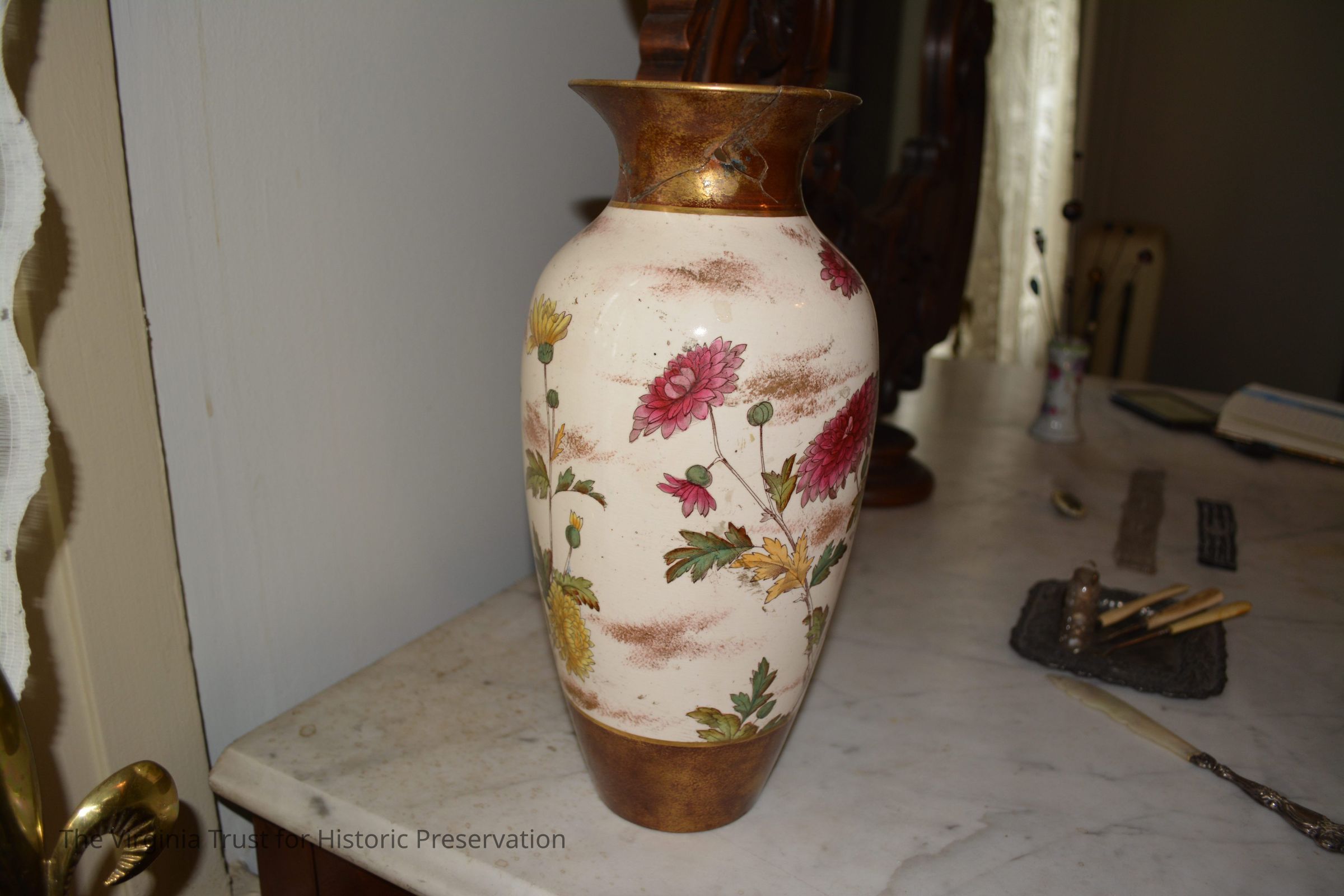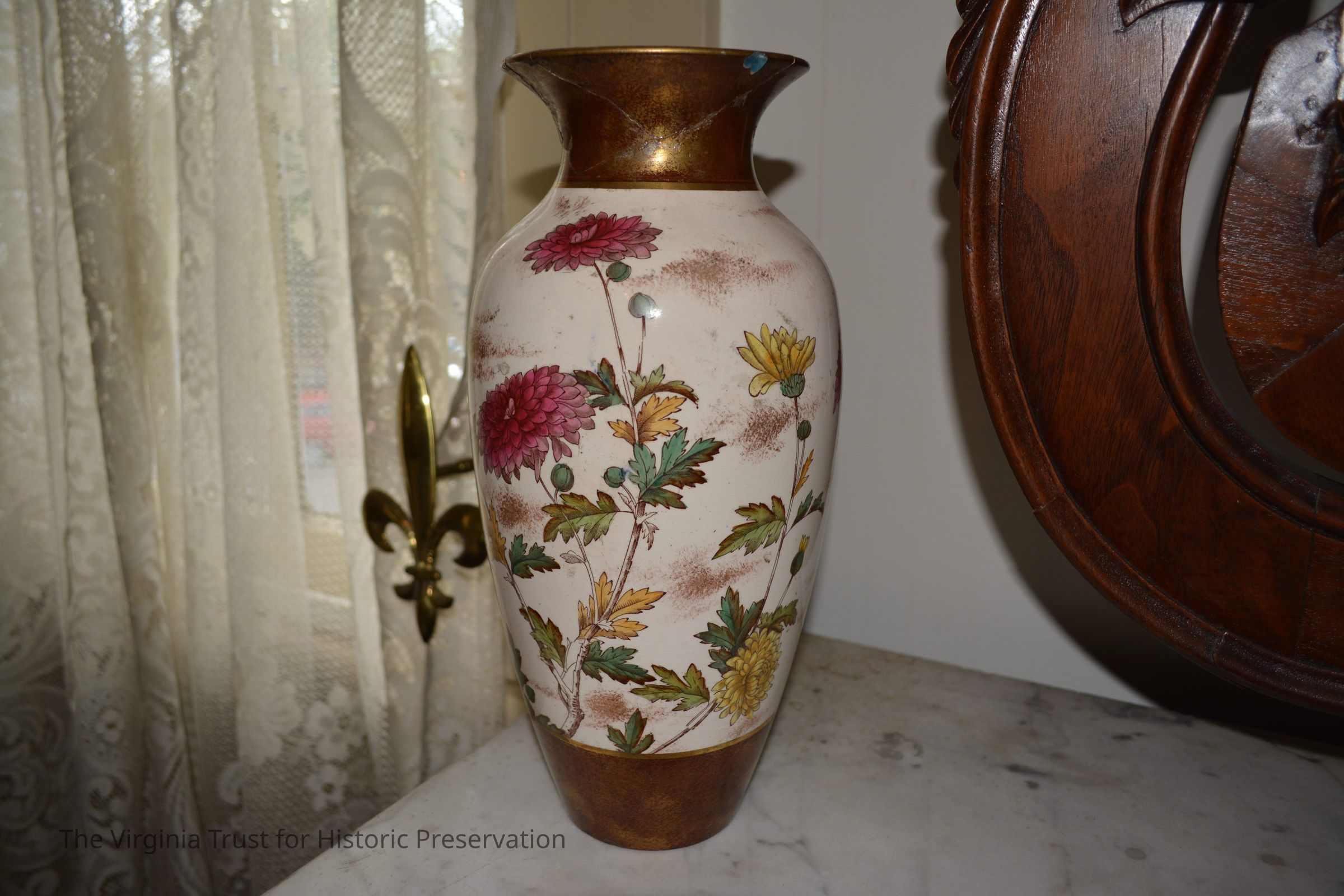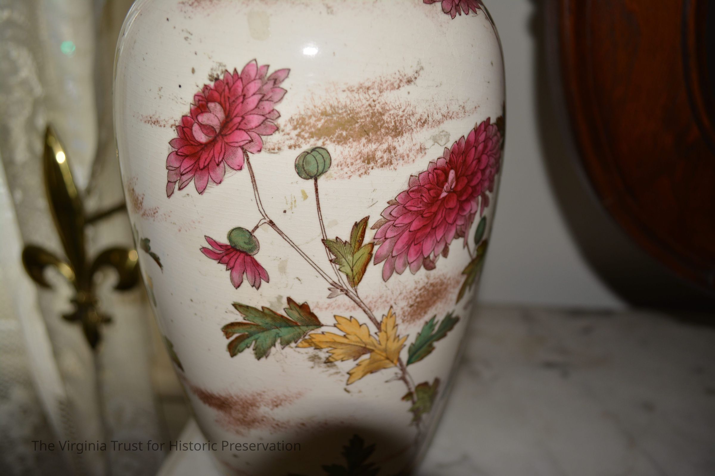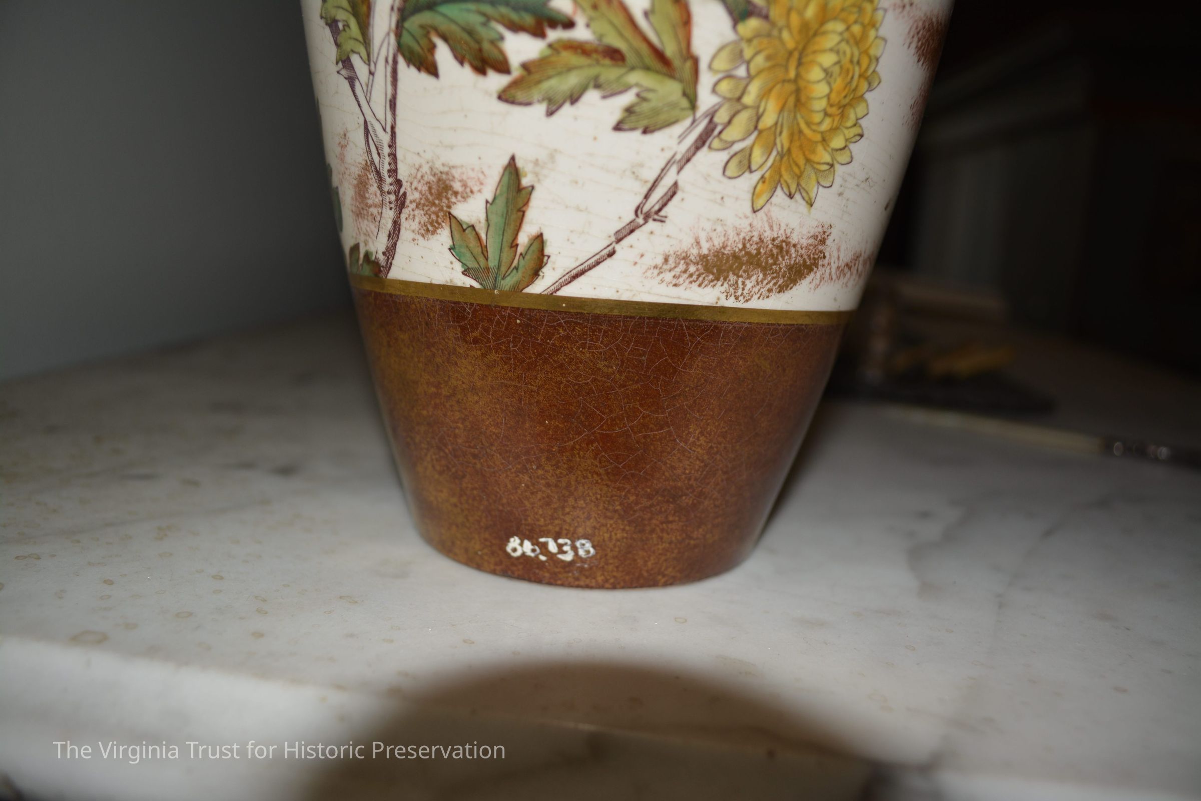 Ceramic vase with a chrysanthemum design on a white background. Two bands of reddish brown color around the top and the base.