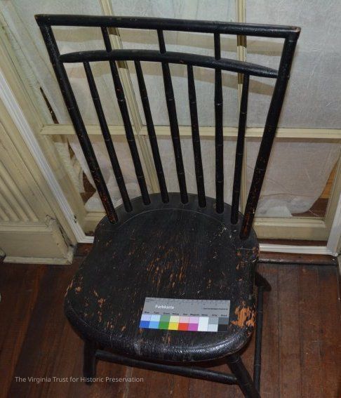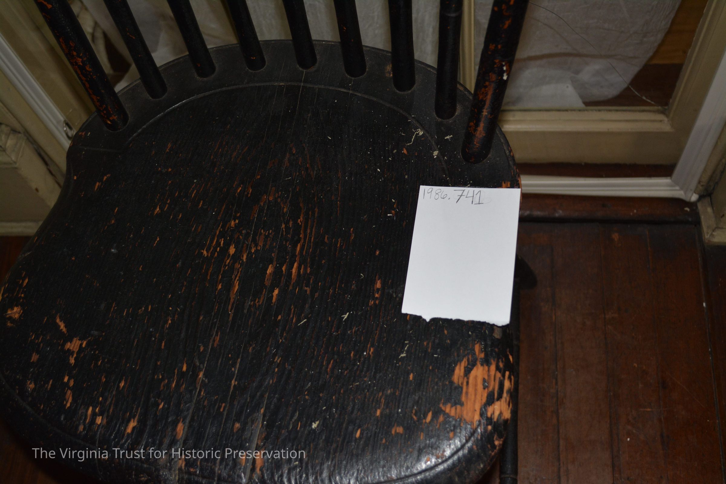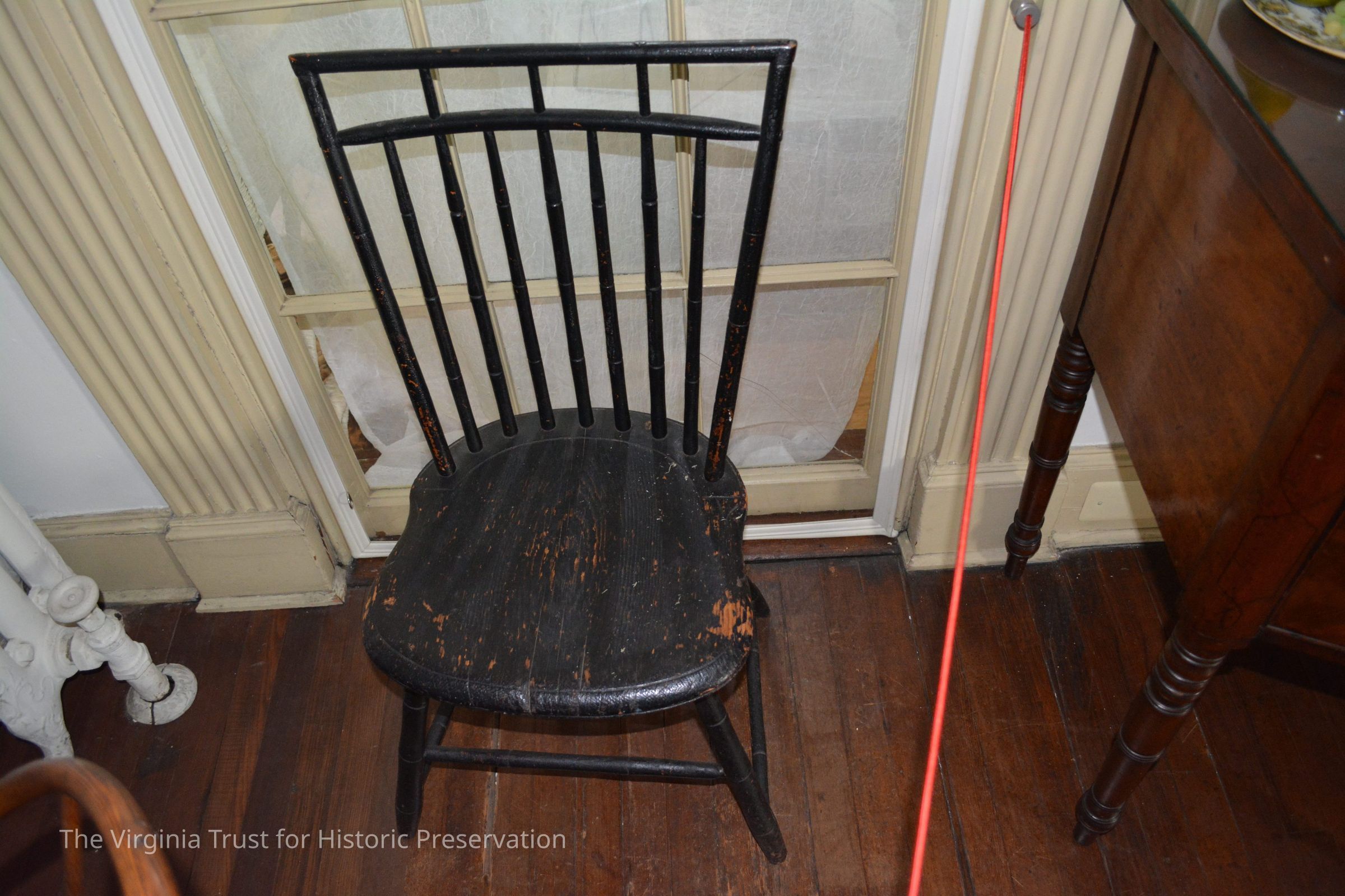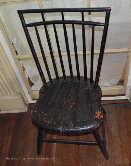 Small black painted Windsor chair. Rough grain seat. 9 spindles on the back. One of a pair.